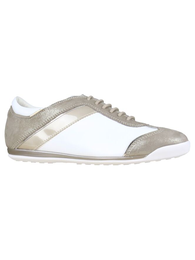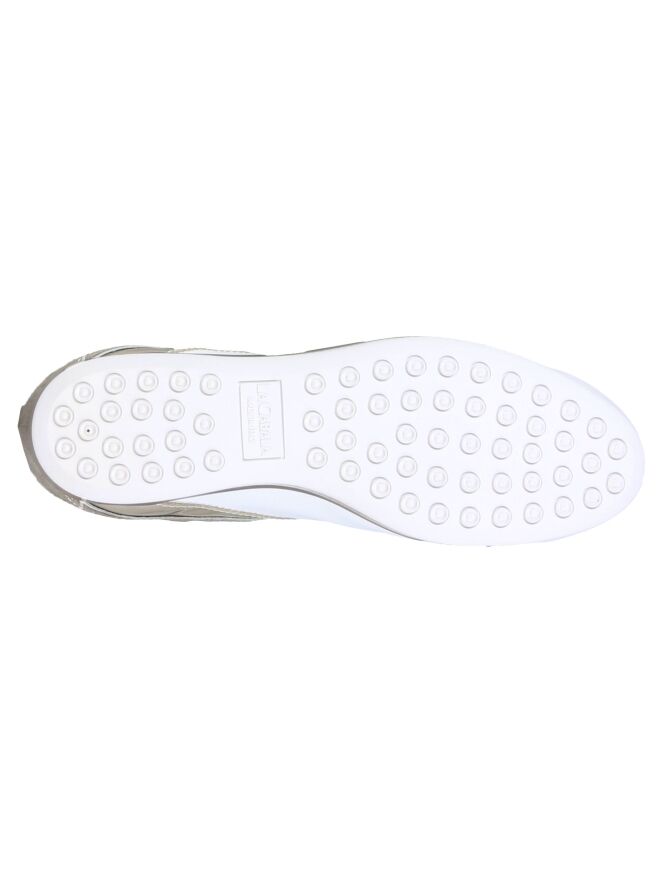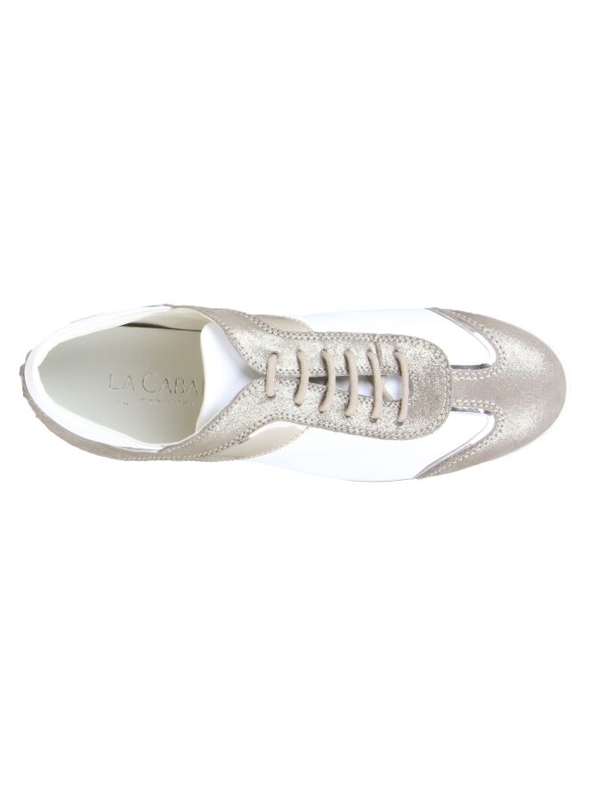 A sneaker by La Cabala in the color white and metallic taupe. On the sides is a lacquer piping in the color taupe. The insole is removable. The inside is lined with leather.