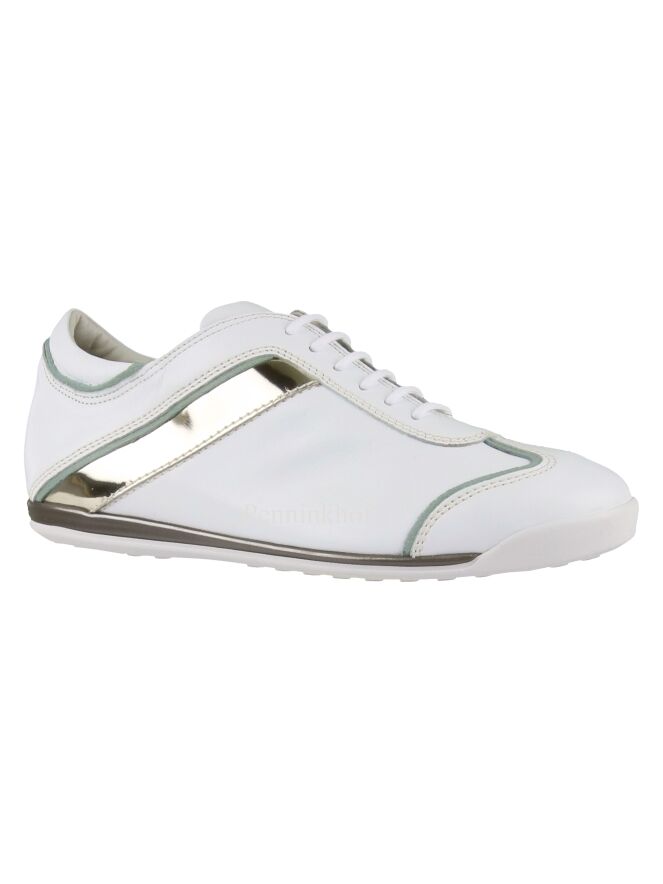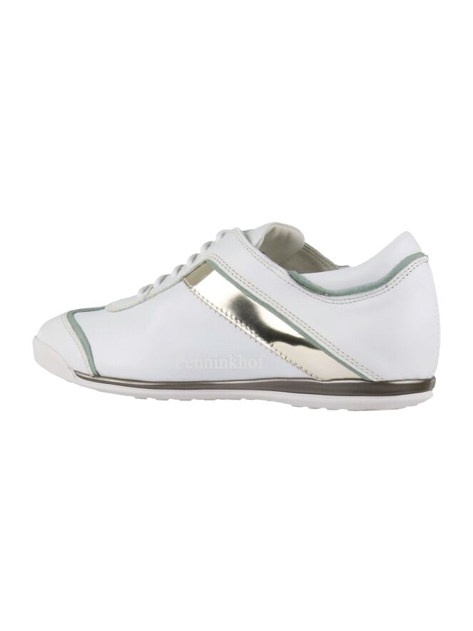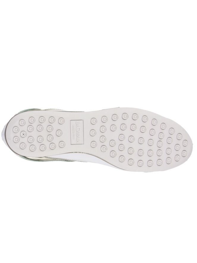 A sneaker from La Cabala in the color white. On the sides, heel and along the forefoot is a mint green trim in patent leather. There is also a silver colored trim on both sides. The insole is removable. The inside is lined with leather.
