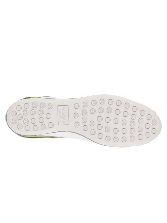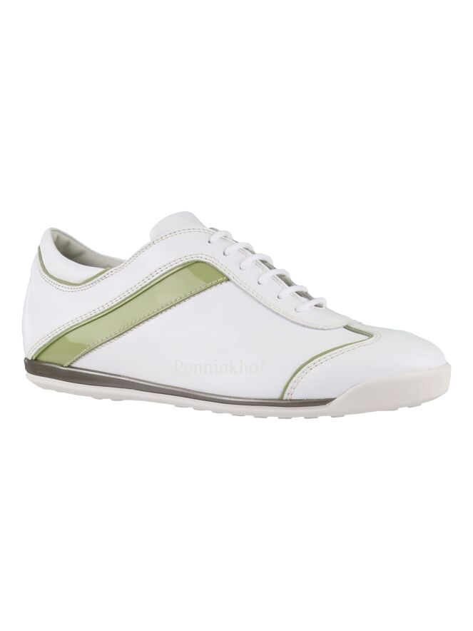 A sneaker from La Cabala in the color white. On the sides, heel and along the forefoot is a pistachio green trim in patent leather. The insole is removable. The inside is lined with leather.