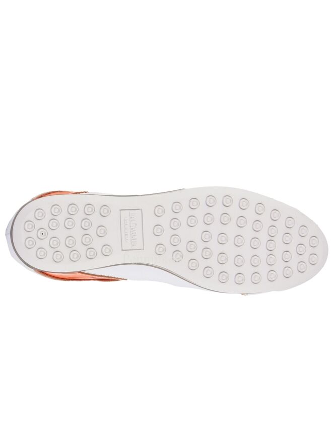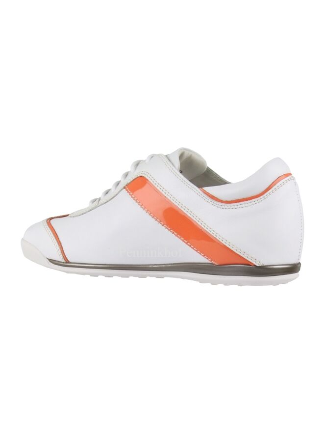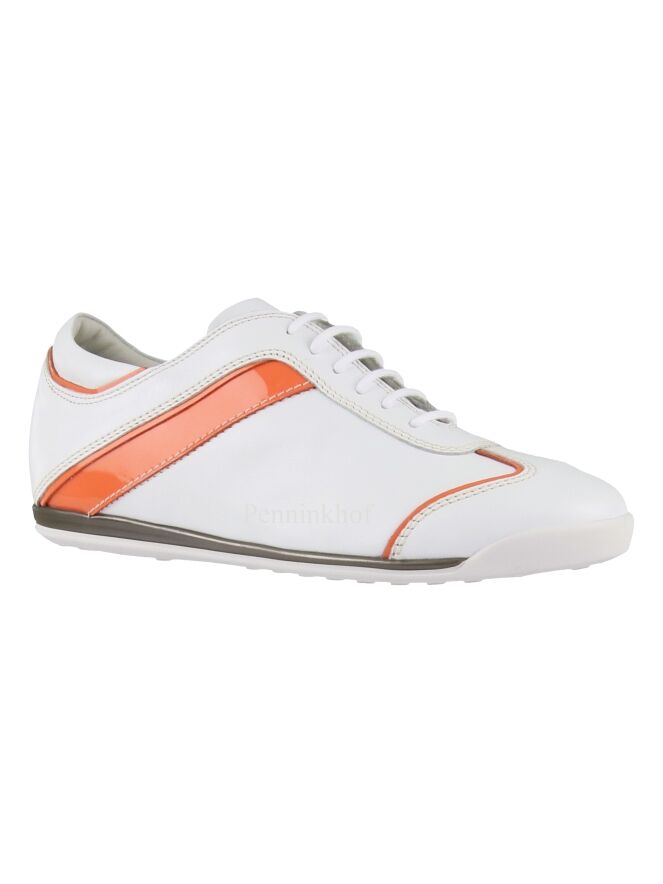 A sneaker from La Cabala in the color white. On the sides, heel and along the forefoot is an orange trim in patent leather. The insole is removable. The inside is lined with leather.