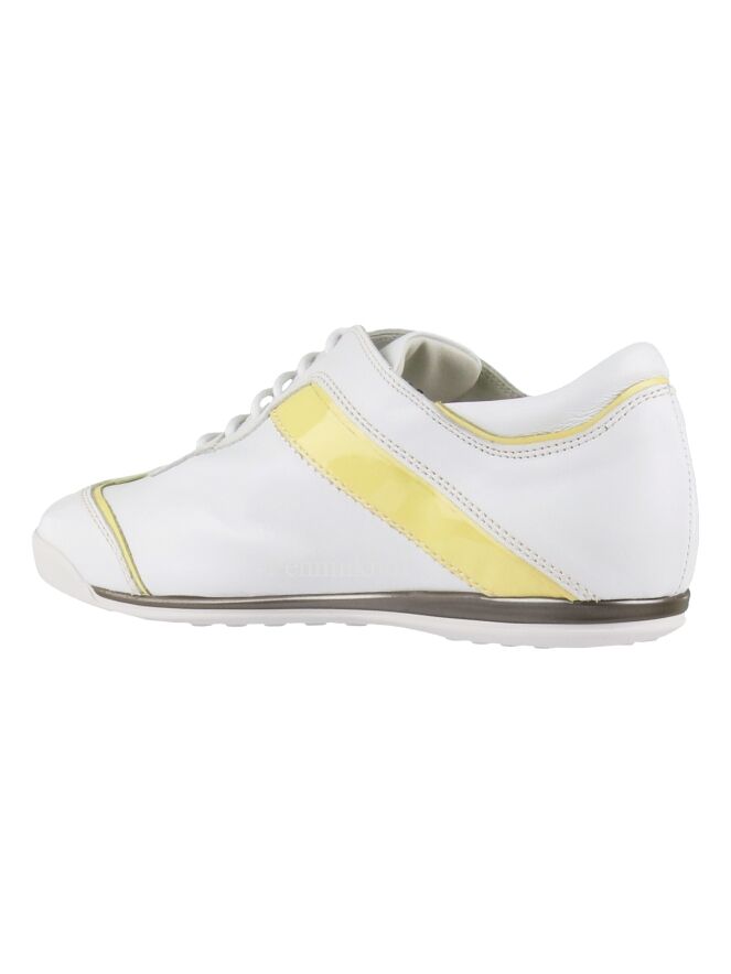 A sneaker from La Cabala in the color white. On the sides, heel and along the forefoot is a pastel yellow piping in patent leather. The insole is removable. The inside is lined with leather.