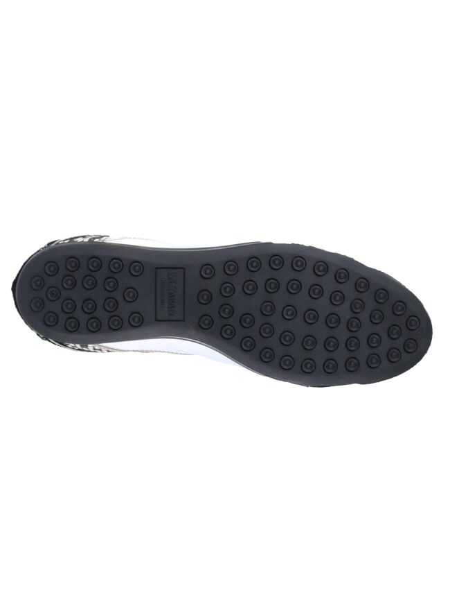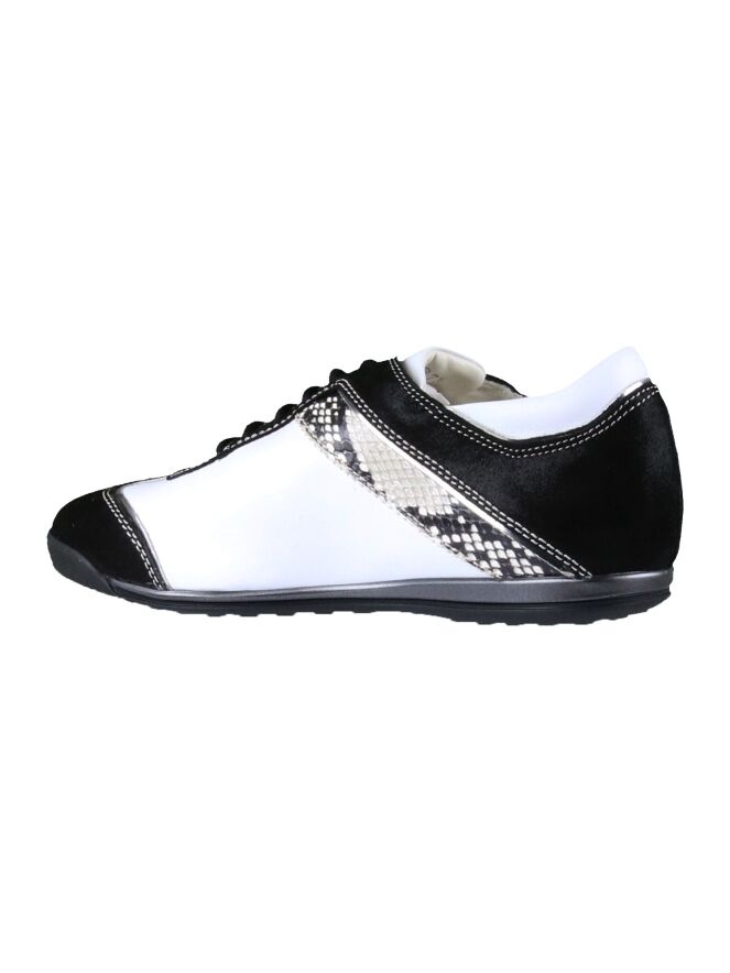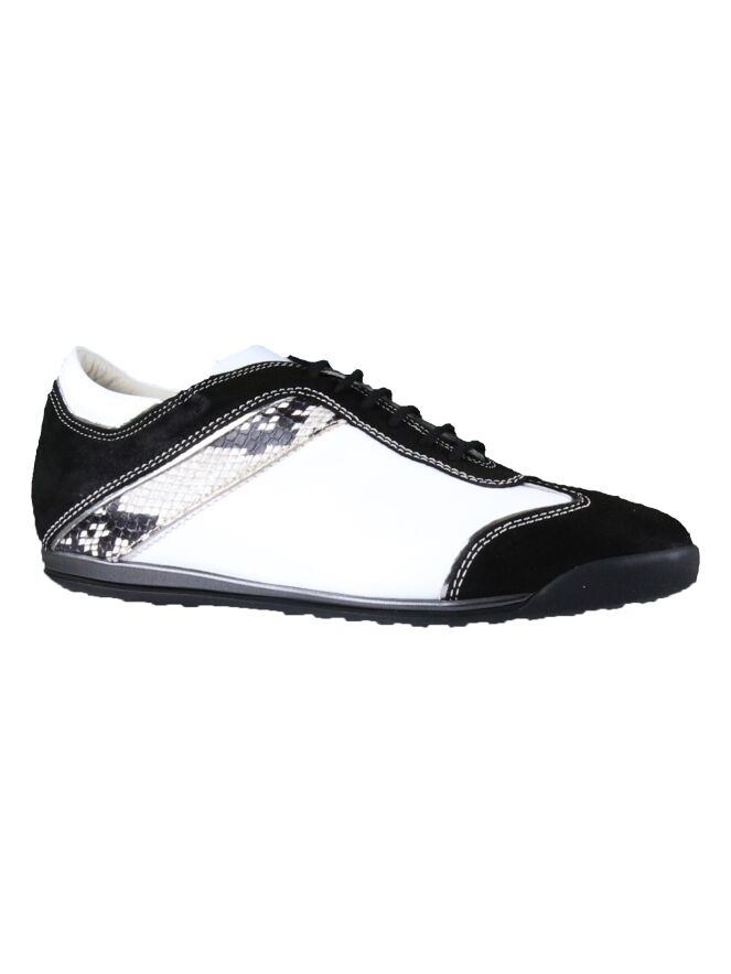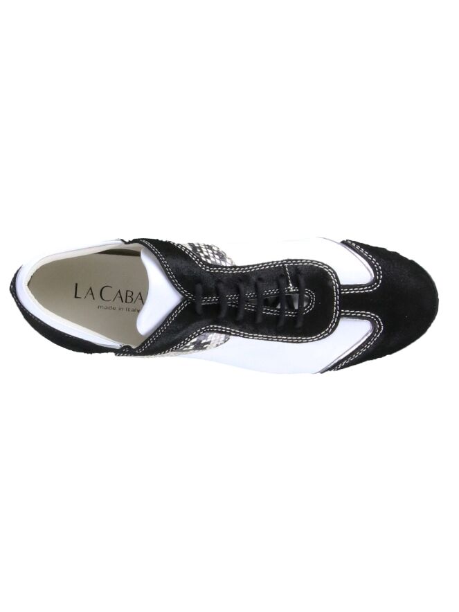 A sneaker from La Cabala in the color white. Along the shaft, on the heel and on the toe is matte glossy suede in a black color. Along the sides is a piping in a taupe-colored python print. The insole is removable. The inside is lined with leather.
