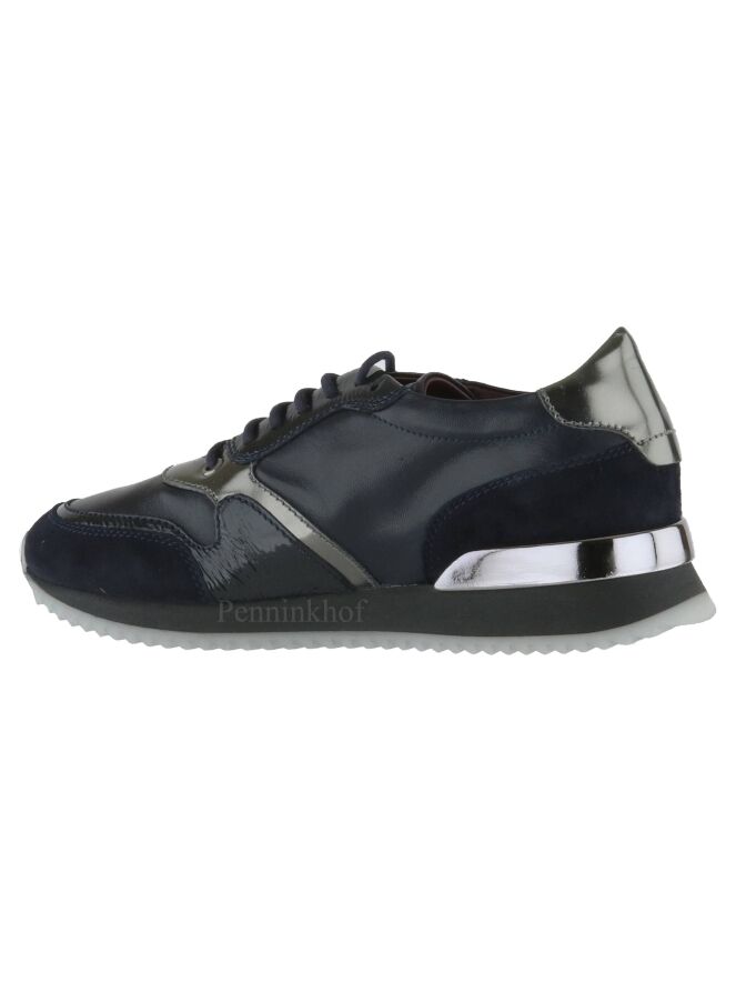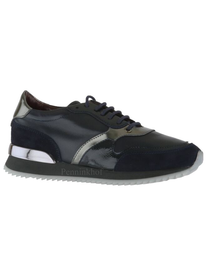 A sneaker from La Cabala in the color navy blue. From the toe to the sides is navy blue camoscio suede with a navy blue patent trim. Along the lace is a nickel-colored trim. On the heel are 2 nickel colored parts. The fine serrated sole is in a light and dark gray color. The inside is lined with leather and the insole is removable.
