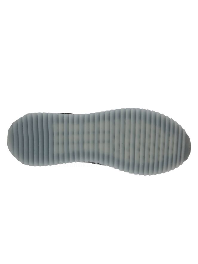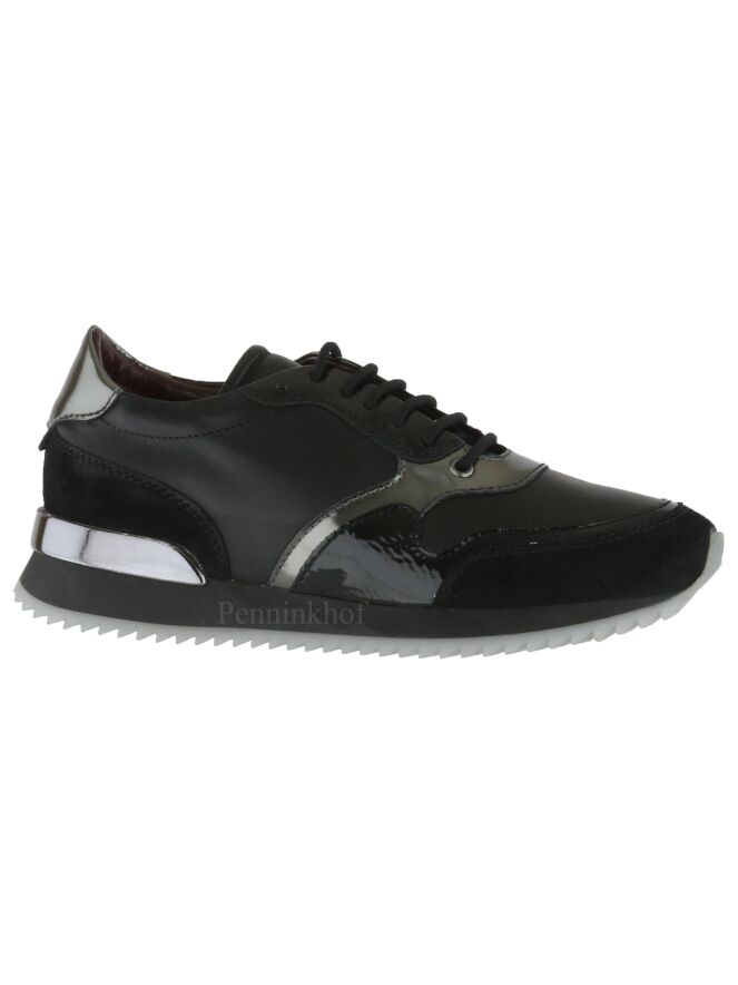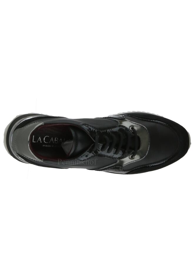 A sneaker from La cabala in the color black. From the toe to the sides is black camoscio suede with a black patent trim. Along the lace is a nickel-colored trim. On the heel are 2 nickel colored parts. The fine serrated sole is in a light and dark gray color. The inside is lined with leather and the insole is removable.