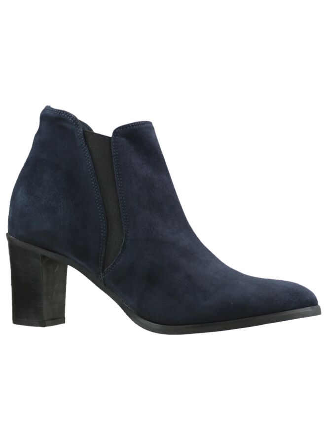 A short ankle boot in the color Navy Blue of the brand La Ross. The boot has a round toe and along both sides is a diagonally elastic fabric. The heel is in a neutral black color. The shaft height is from the heel 11 cm and the shaft circumference is 26 cm. the inside of the boot is lined with leather.