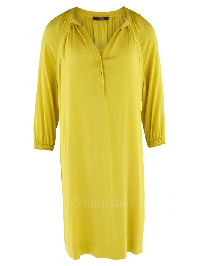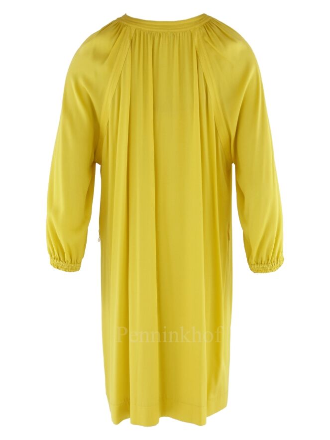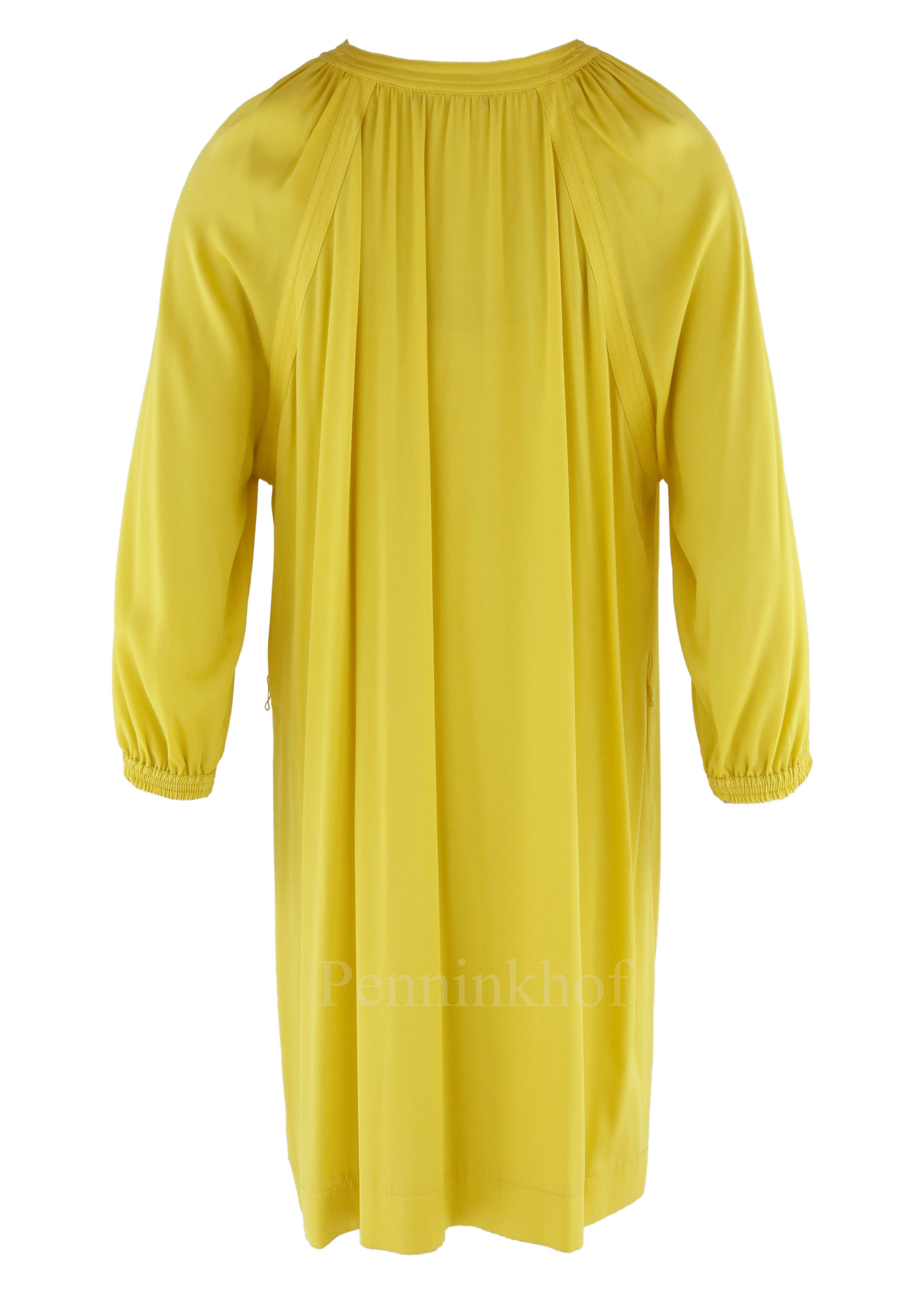 A dress by Laurel in a lemon yellow color. The dress has a V-neckline with a few buttons. From the edge of the neckline to the back are fine pleats. At the end of the half-length sleeves is an elastic trim. The dress is lined and should not be washed.