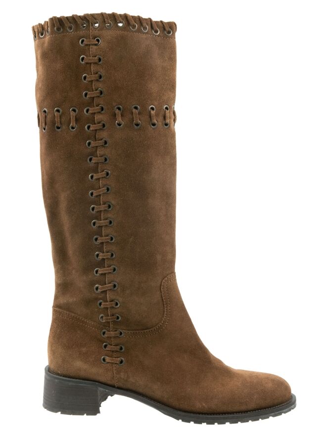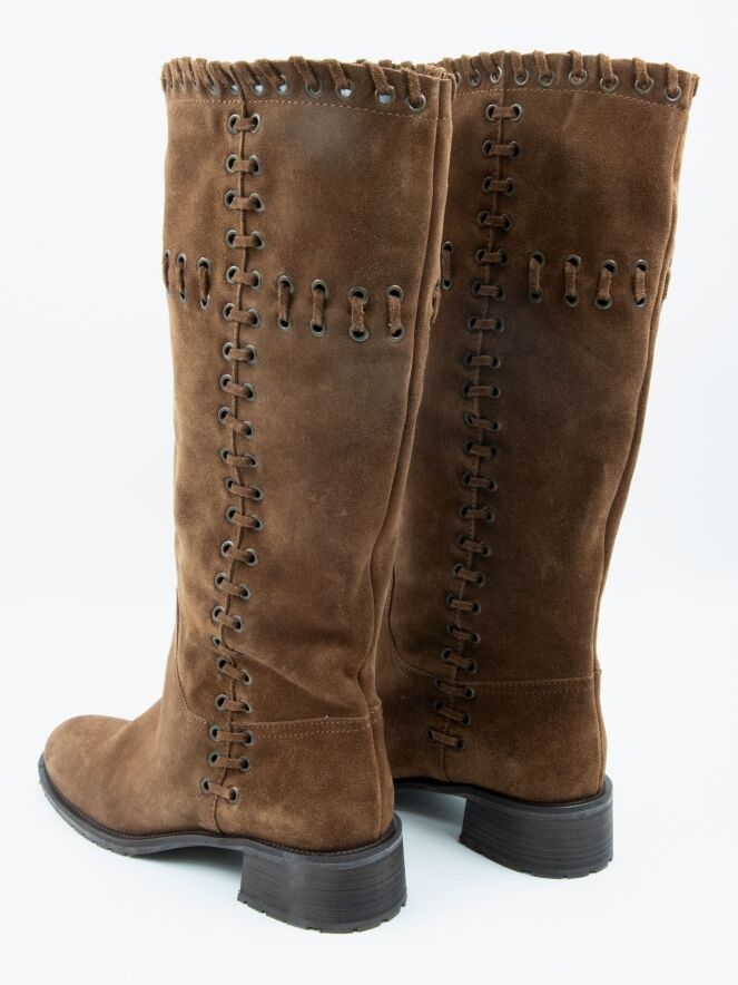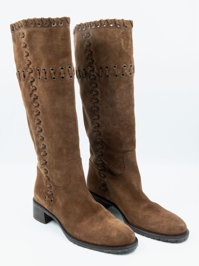A high boot from Luca Mode in cognac. Along the outer side of the shaft, a decorative cord is woven through copper-colored rings along the entire length. The same decoration is applied along the top edge of the shaft and about 10 cm below it. The inside of the shaft is unlined.