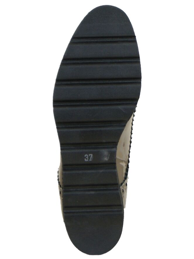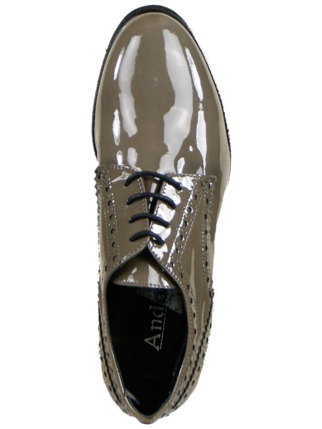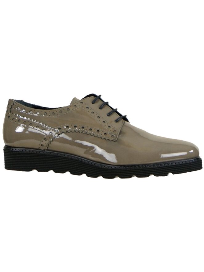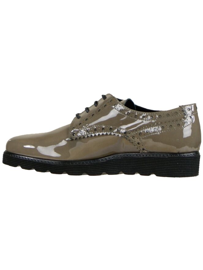 A lace-up shoes of the brand Luca Mode in a patent leather in the color taupe. The shoe has brooks details along the sides and heel. The sporty sole is good pliable. This shoe is leather lined on the inside.