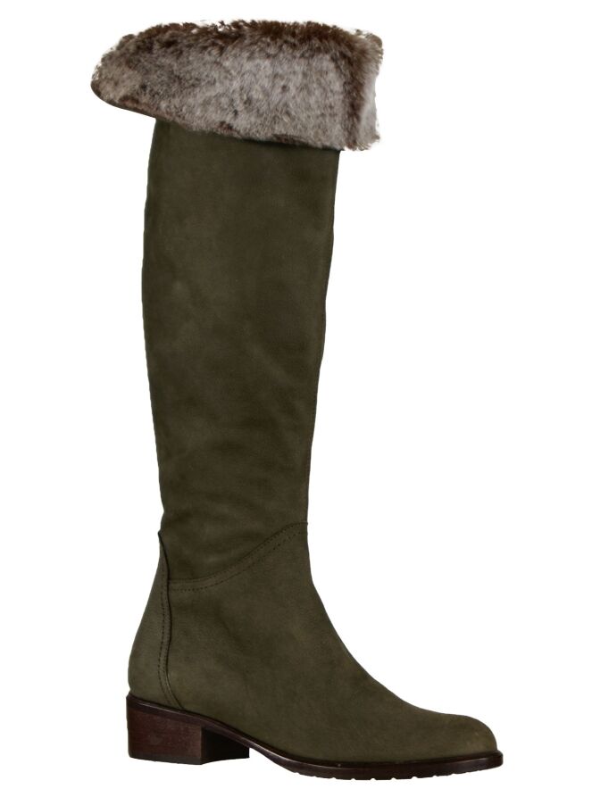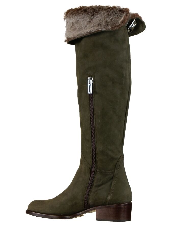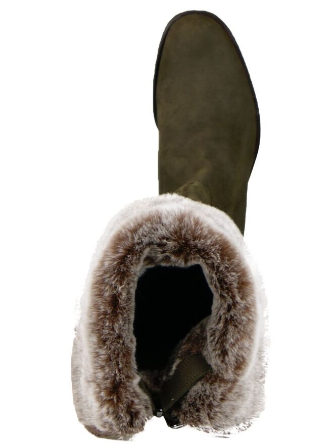 A high boot from the Luca Mode brand in the color dark brown in a sporty leather with a short faux fur cover at the top of the shaft. At the rear of the shaft is a strap with a buckle. From the sole to well above the calf, a zipper is used on the inside of the boot. The height of the shaft is 40 cm up to the fur rim and the circumference is 37 cm.