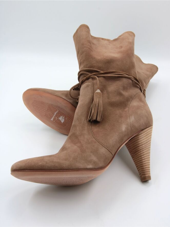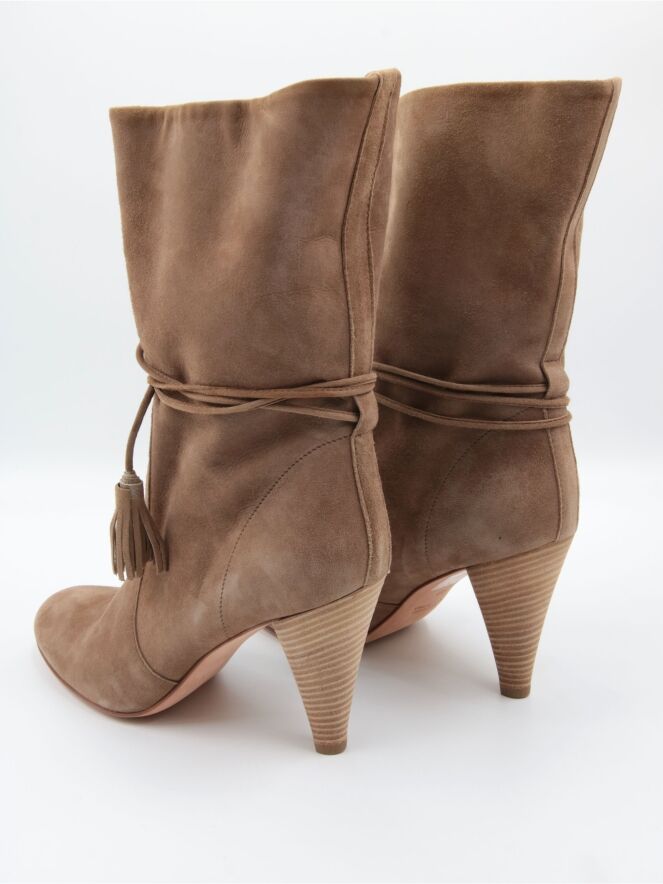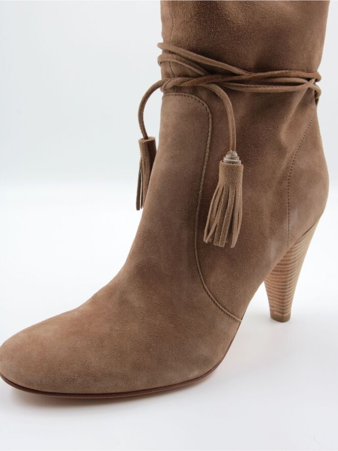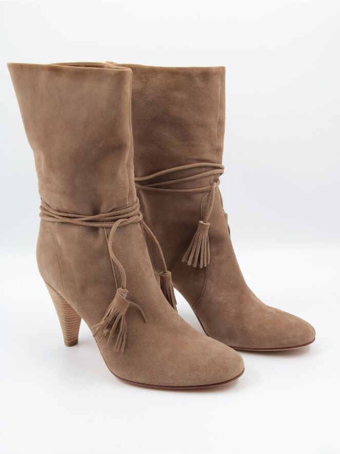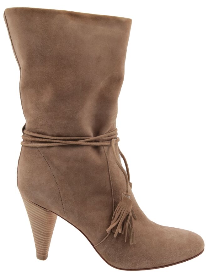 A mid-height boot from Luca Mode in taupe. Around the shaft is a leather cord with fringes at the ends. The boot features a slim wooden heel, and the interior of the shaft is leather-lined.