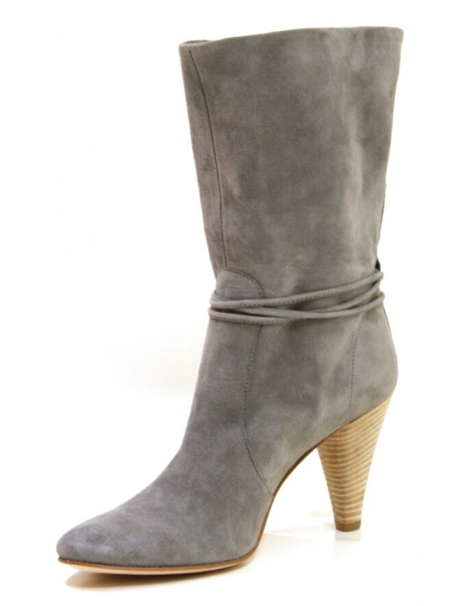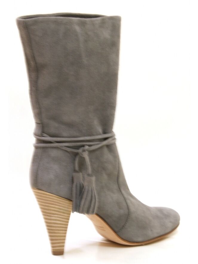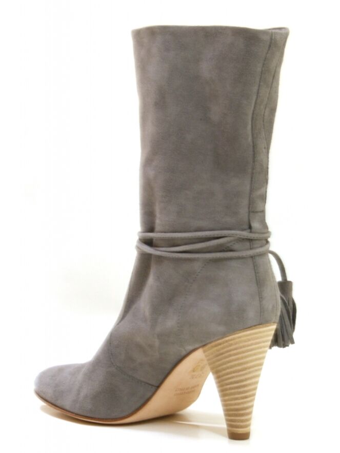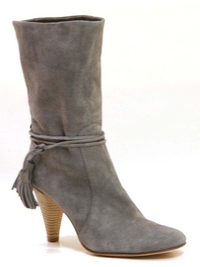 A mid-height boot from Luca Mode in grey. Around the shaft is a leather cord with fringes at the ends. The boot features a slim wooden heel. The inside of the shaft is lined with leather.