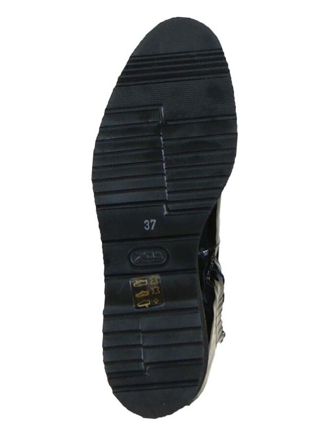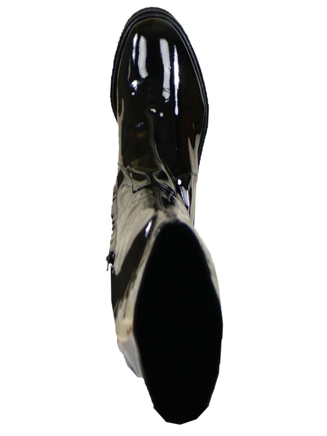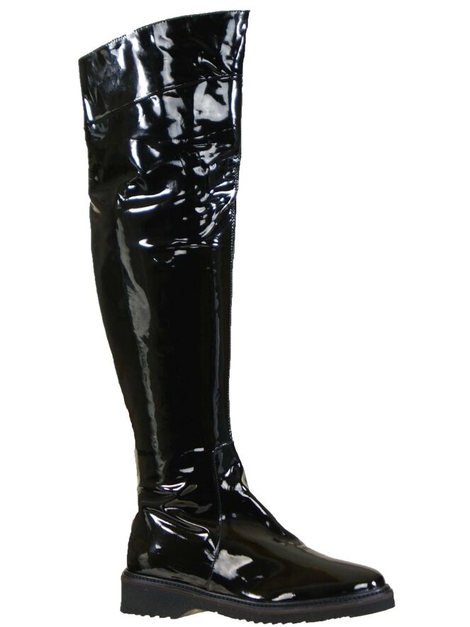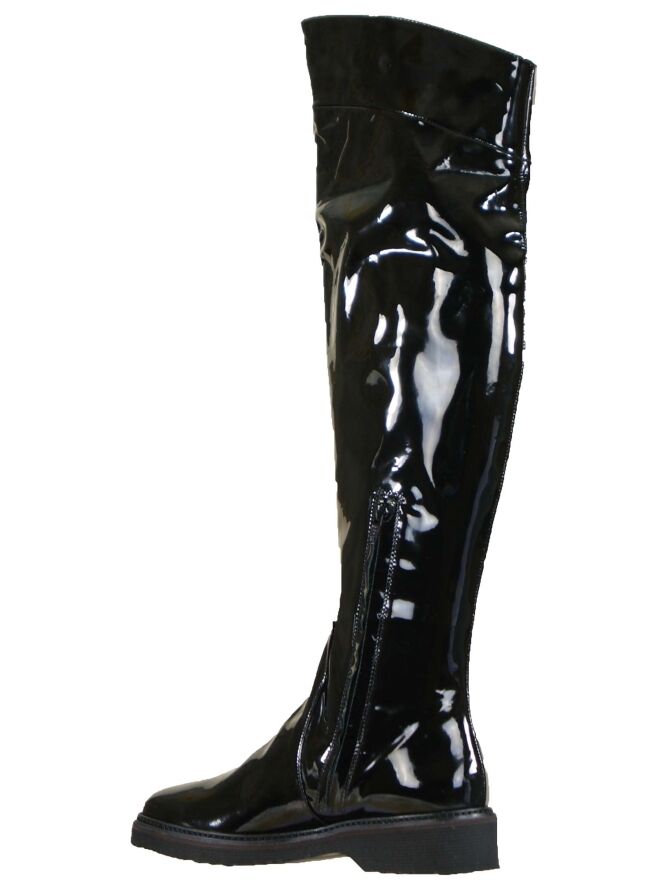 A tub boot in patent leather of the brand Luca Mode in the color black. The boot has a round toe. The height of the shaft is 52 cm and the width of the shaft is 37 cm. On the inside of the boot is from the sole to mid boot a zipper. The shaft is on the inside with leather lined.