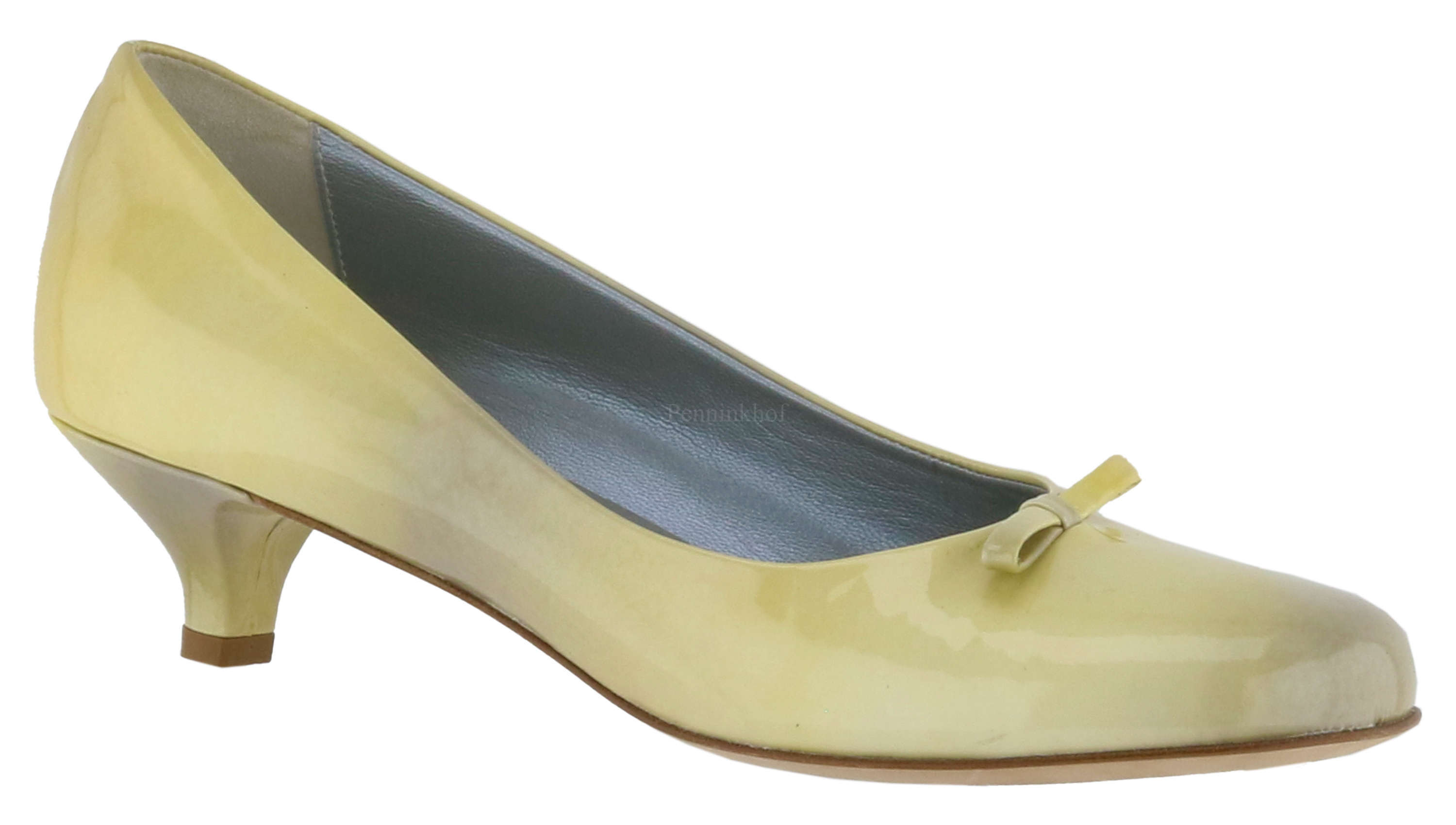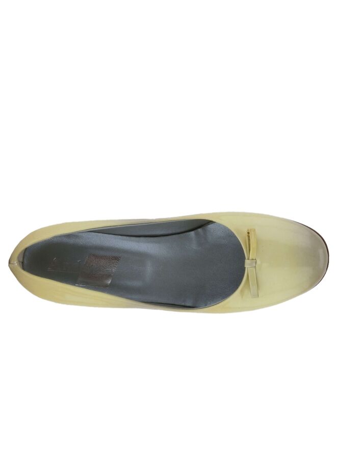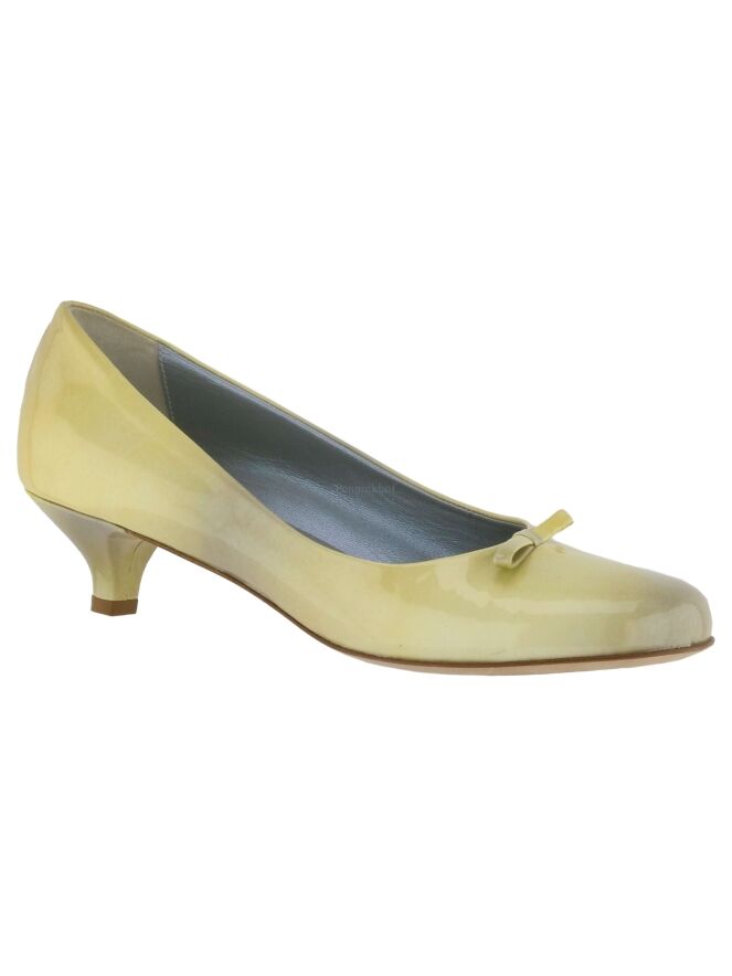 A patent leather pump by Luca Mode in a gradient of yellow with gray colours. There is a decorative bow on the front foot. The pump has a round toe and the inside is lined with leather.
