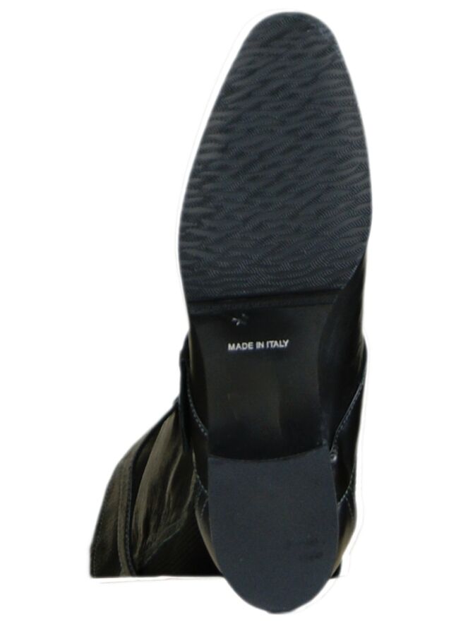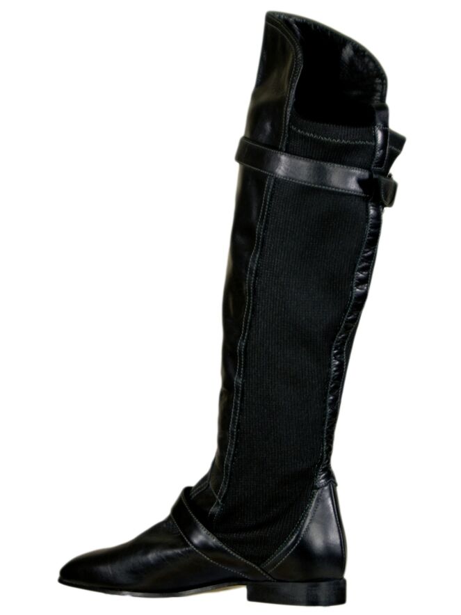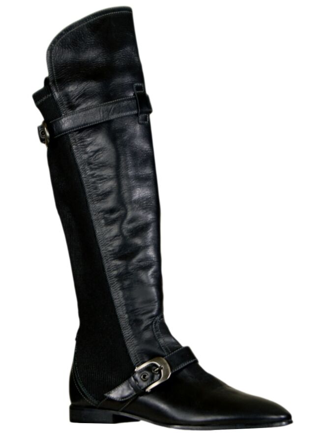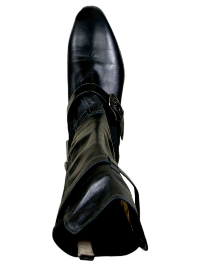 A boot by the brand Luca Mode in the color black. The forefoot is slim and over the forefoot is a leather band with a buckle. This detail comes back at the top of the shaft. The back of the shaft is in a stretch fabric. The height of the shaft is 35 cm to the folder of 5 cm and the width of the shaft is 35 cm. The leather part of the shaft is inside with leather lined.