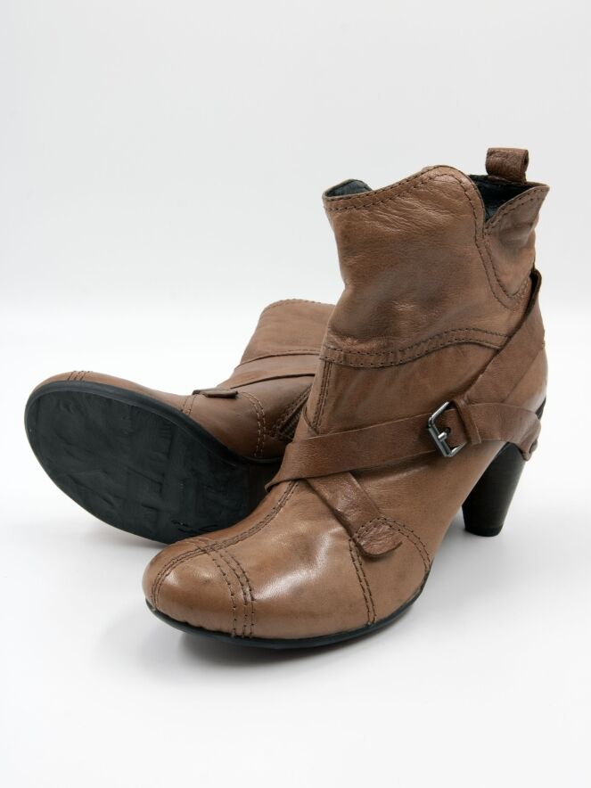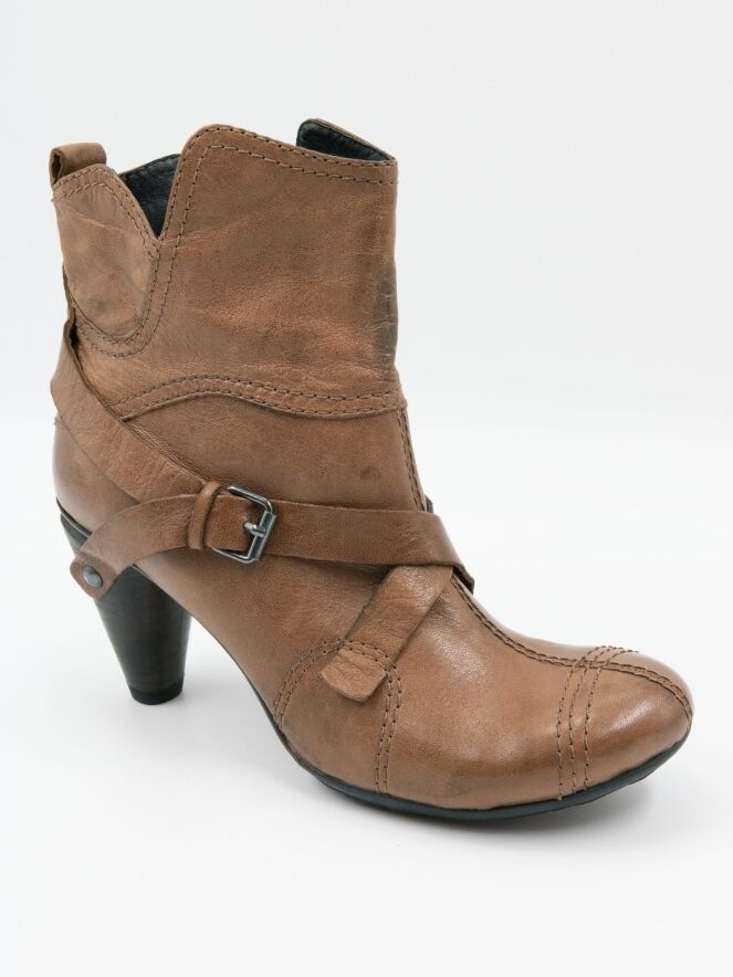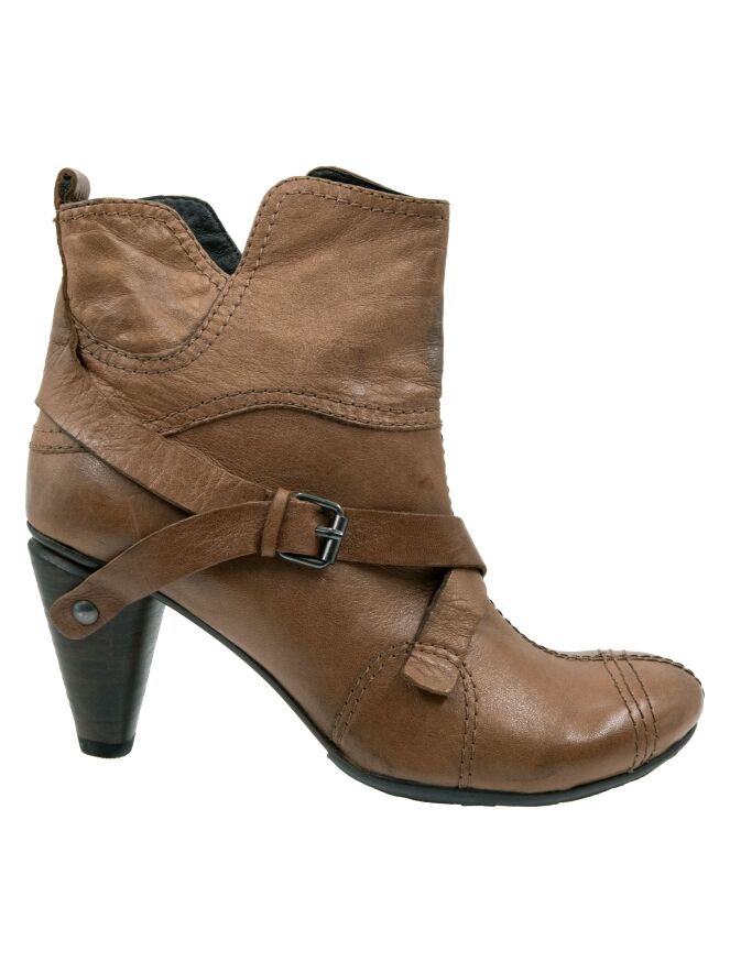 Ankle boot by Luciano Barachini in cognac. The forefoot features crossed double seams. At the instep are crossed straps with an adjustable buckle. On the outer side of the shaft, there is a notch along the edge. The inside of the shaft is unlined.
