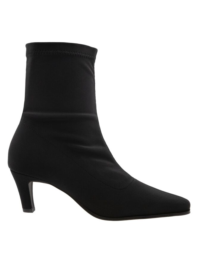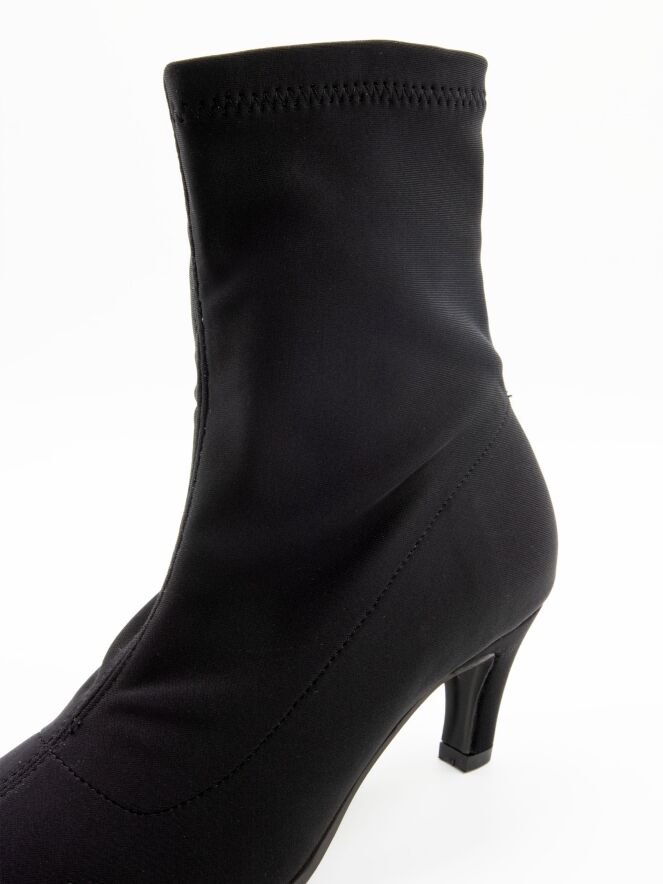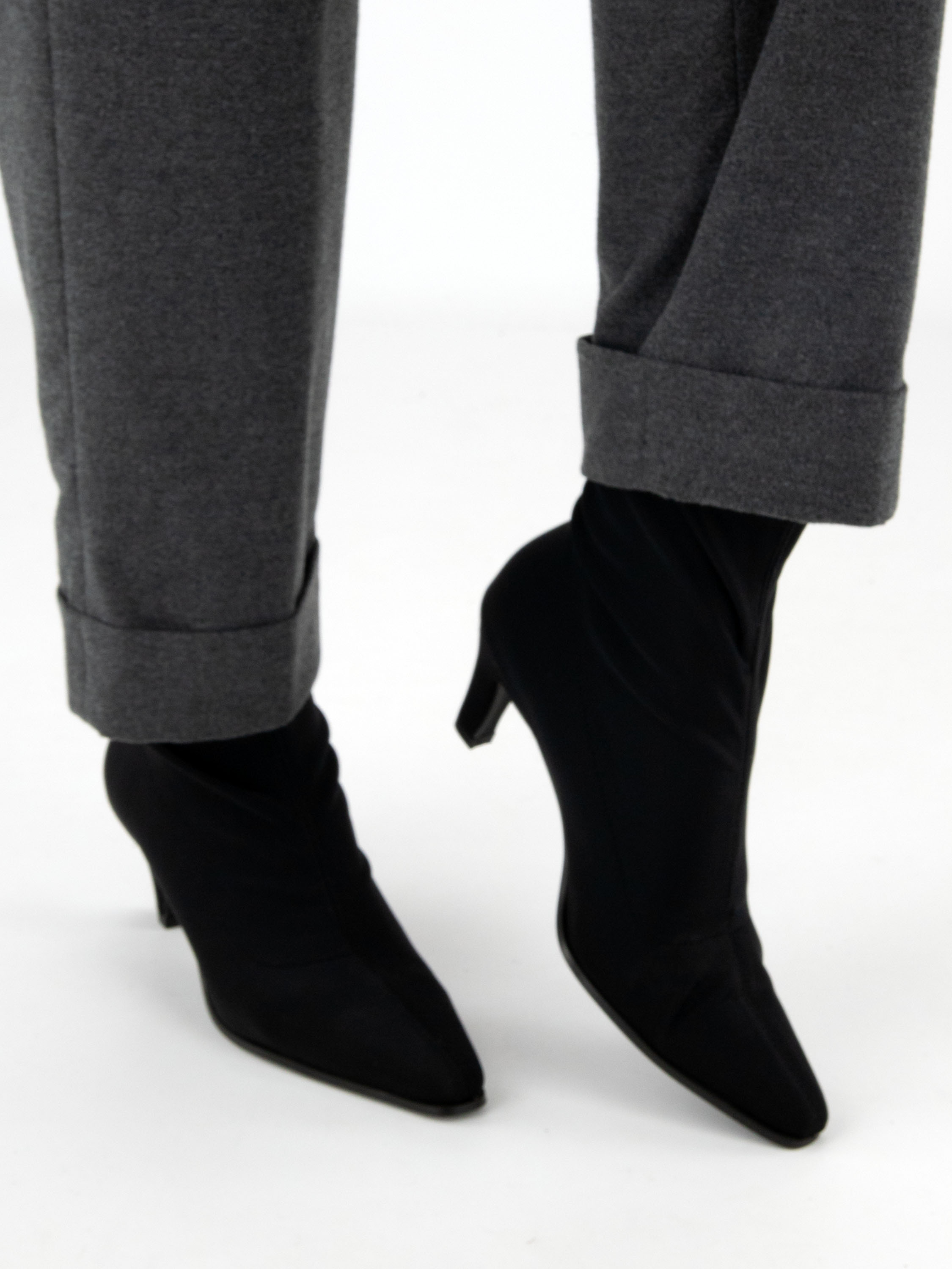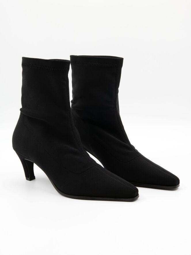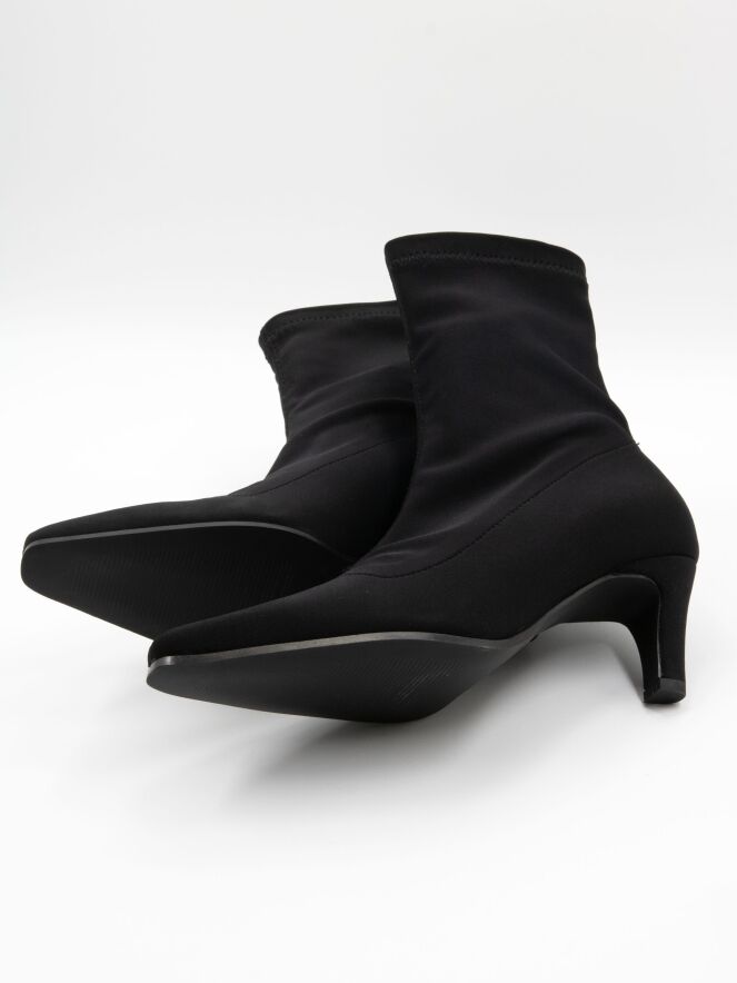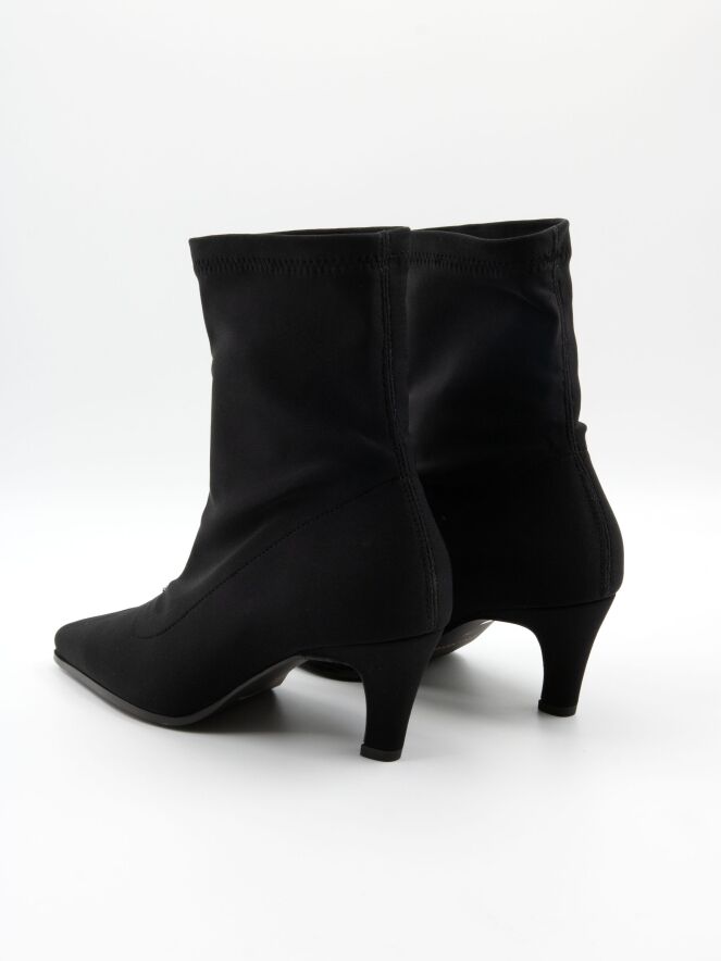 A short ankle boot from Madore in elastic fabric. The boot features a sleek pointed toe, and the stretch material fits elegantly around the foot.
