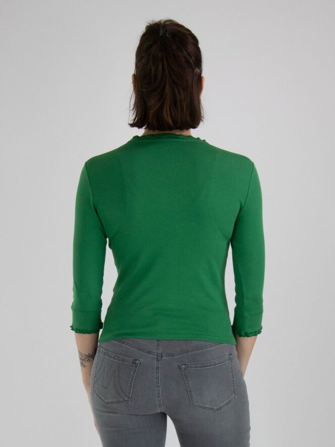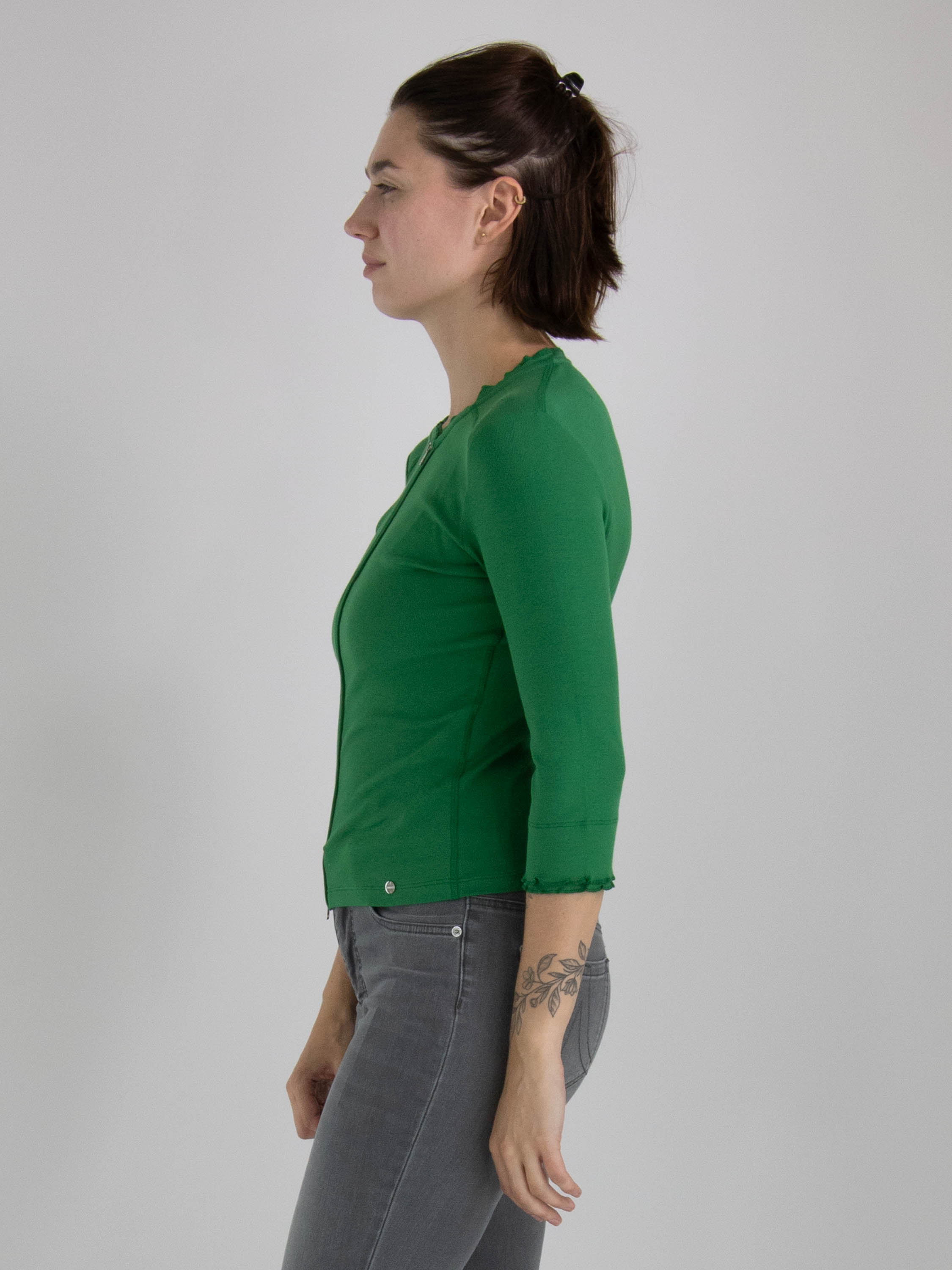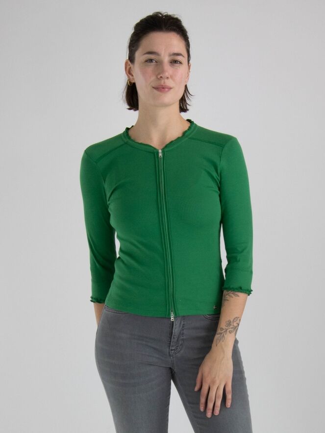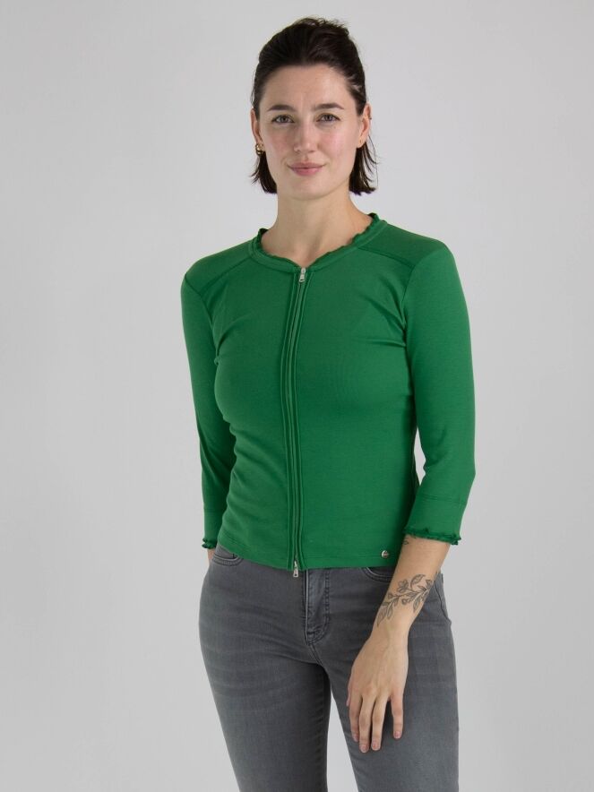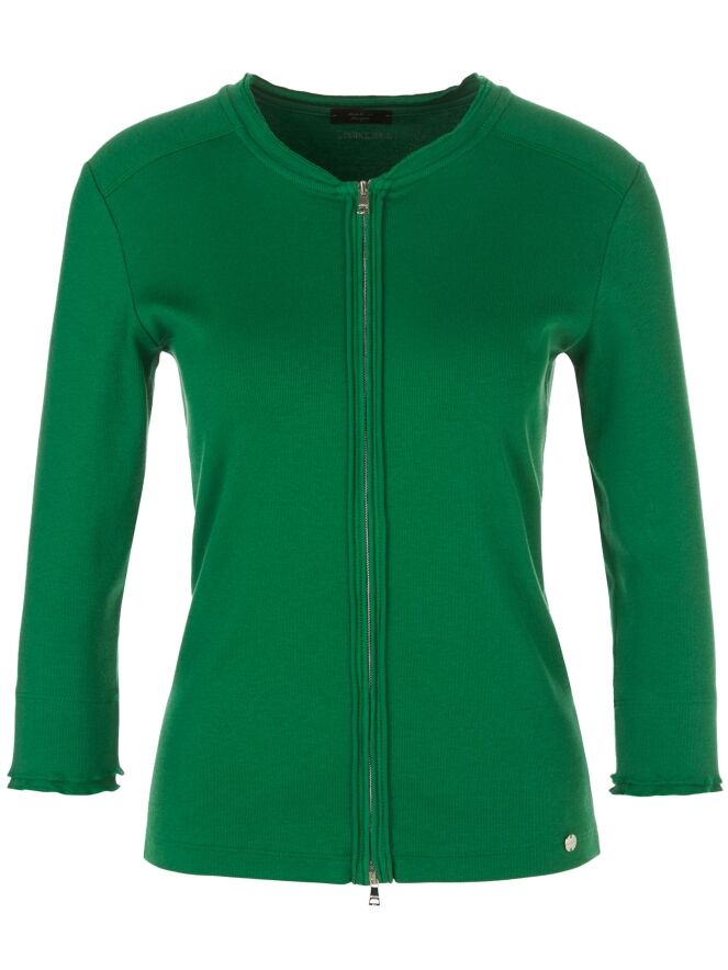 A short cardigan from Marc Cain in a finely ribbed structure and green color. The cardigan has half-length sleeves and a zipper closure. This cardigan can be washed at 30 degrees.
