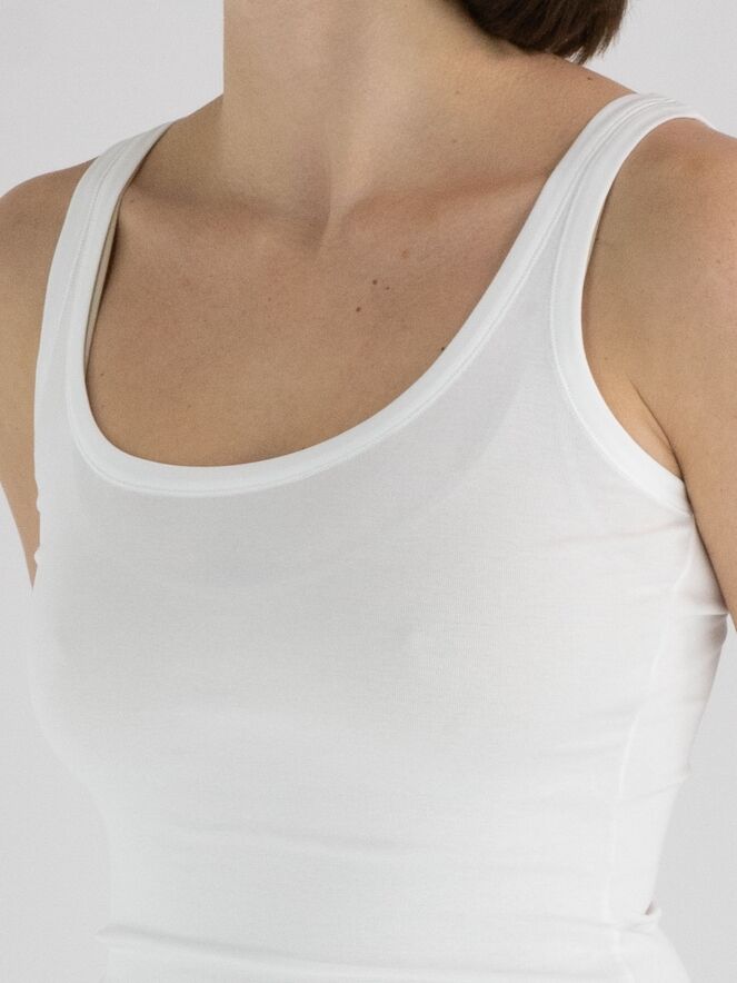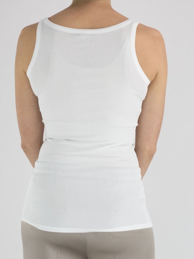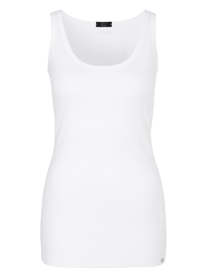 A top from Marc Cain in the color white. The top has a spacious round neckline, and the shoulder straps are 3 cm wide. This top can be washed at 30 degrees.
