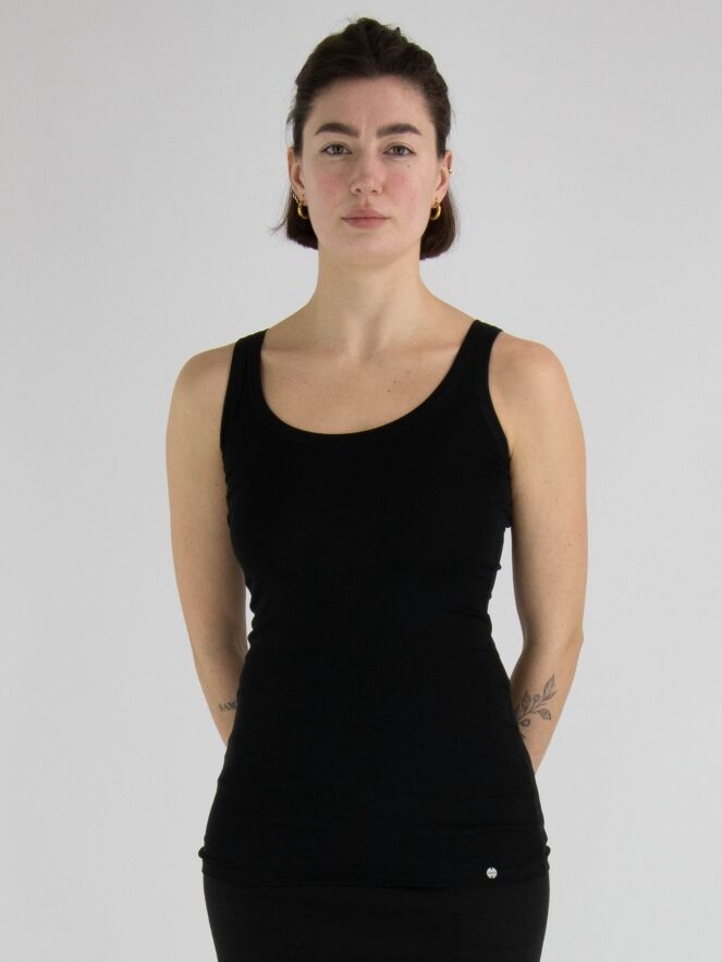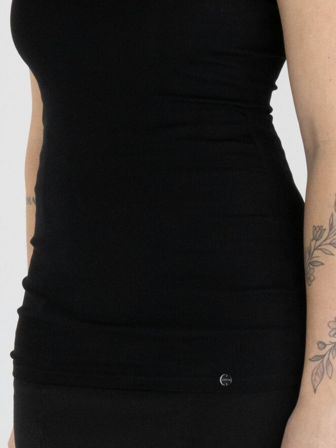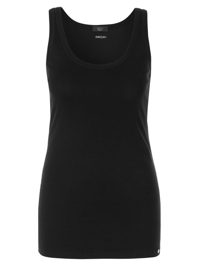 A top from Marc Cain in black. The top features a spacious round neckline, and the shoulder straps are 3 cm wide. This top can be washed at 30 degrees.