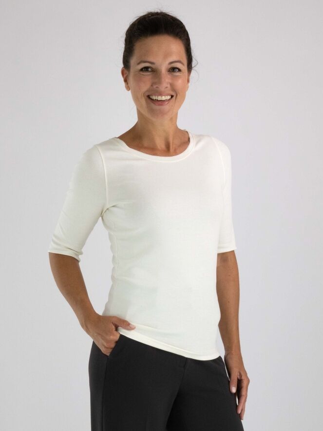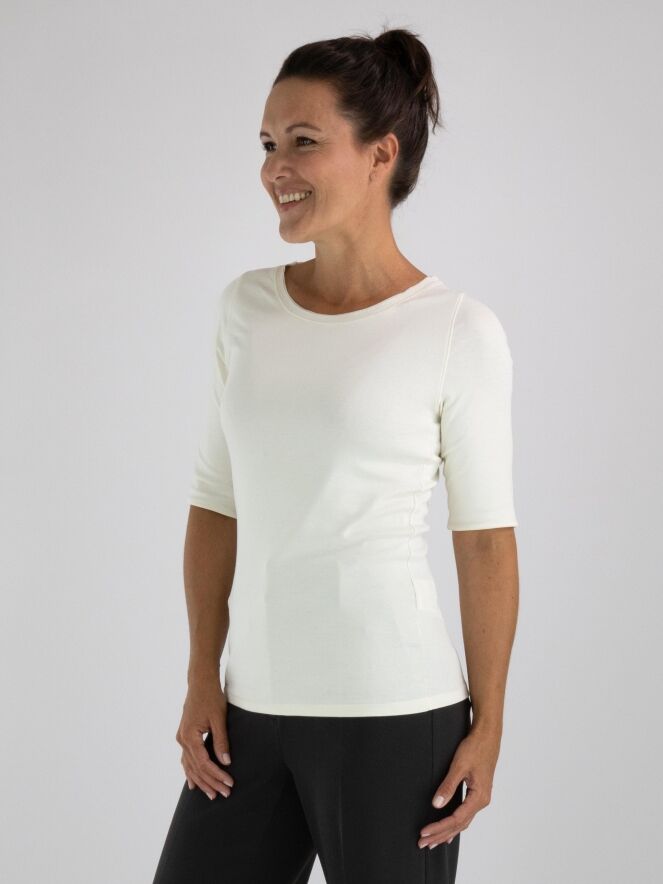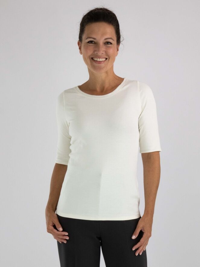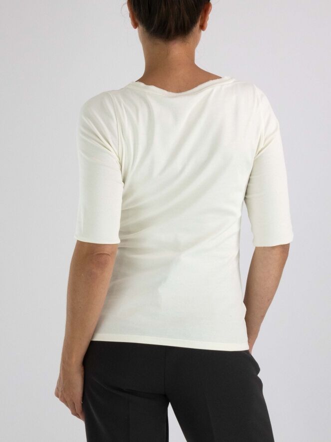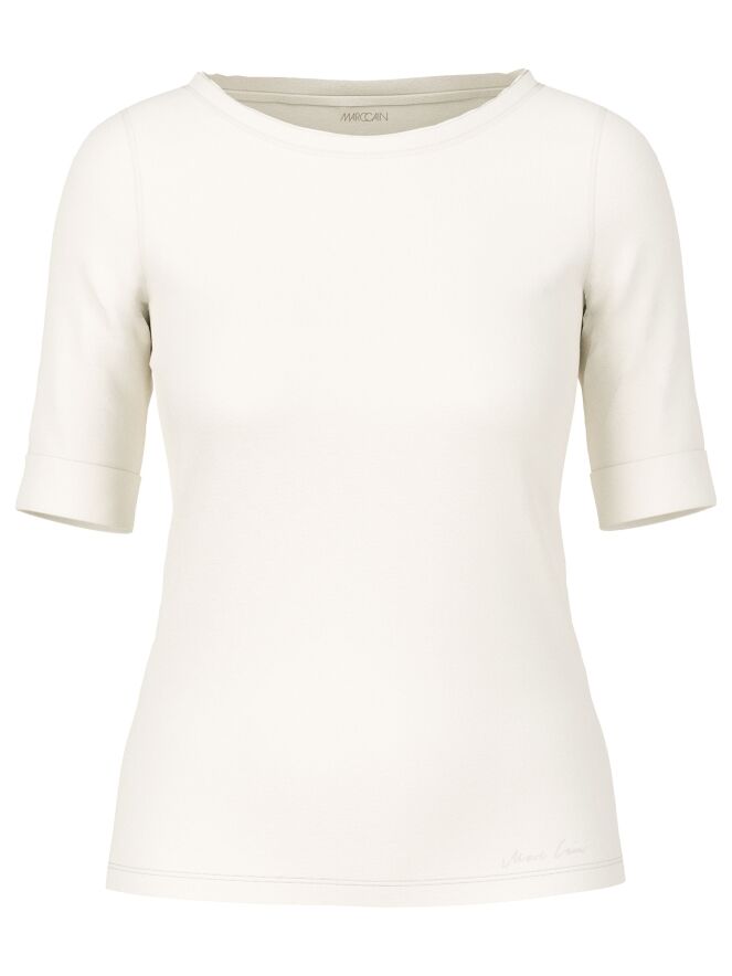 A shirt from Marc Cain in cream white. Along the edge of the round neckline is a double matte satin trim. The shirt has short sleeves and can be hand washed.