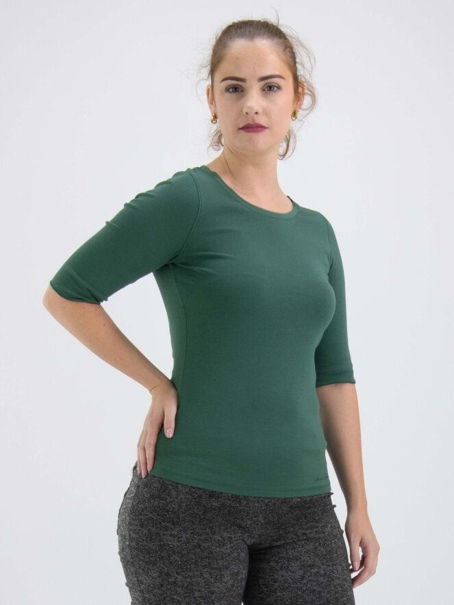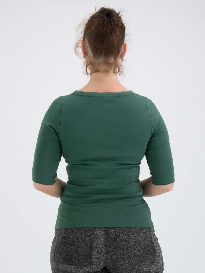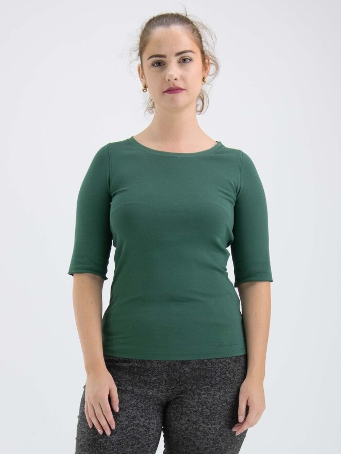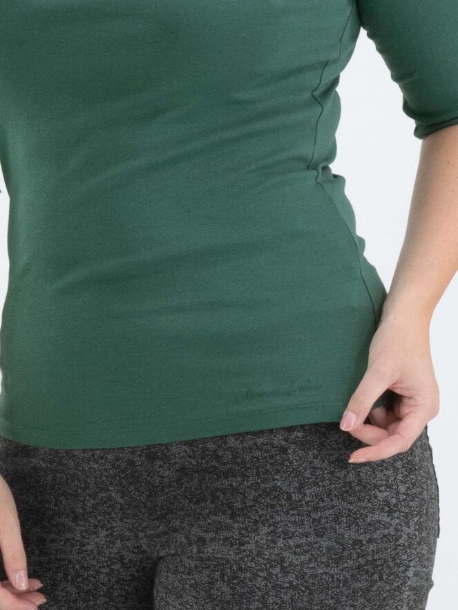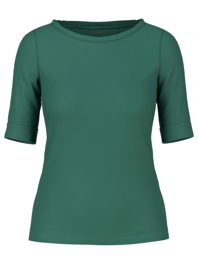 "A Marc Cain shirt in a pastel olive green color. Along the edge of the round neckline is a double matte satin trim. The shirt has short sleeves and can be hand-washed."
