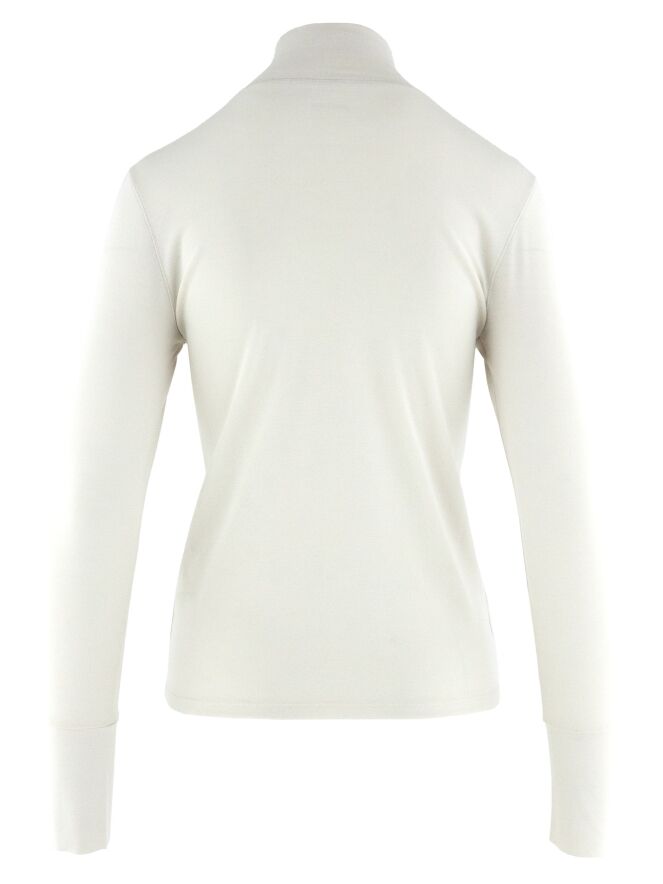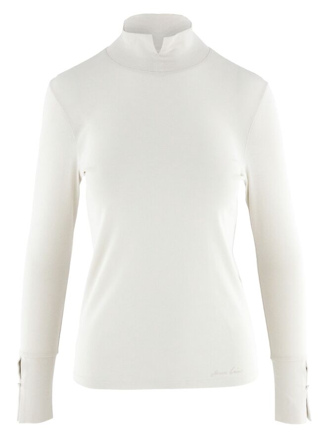 A shirt by Marc Cain in beige color. The shirt has long sleeves and a turtleneck with a short slit in the front center. This shirt can be washed at 30 degrees.