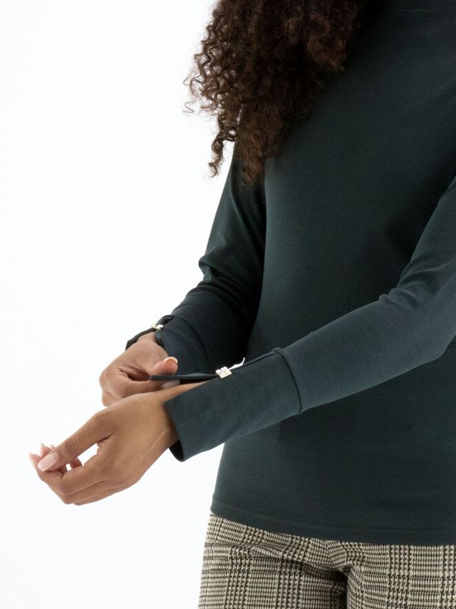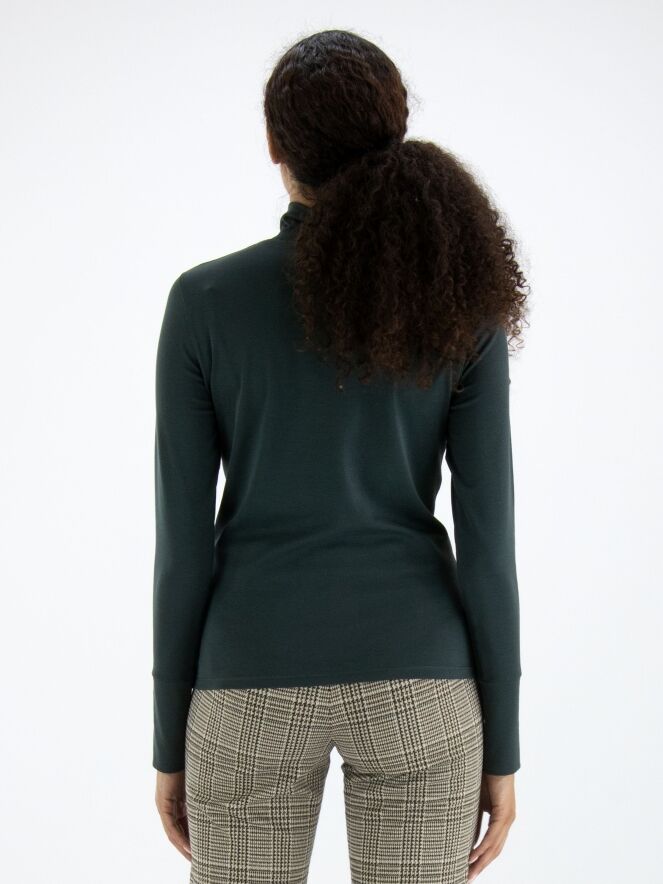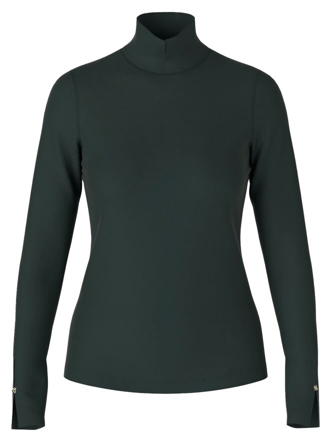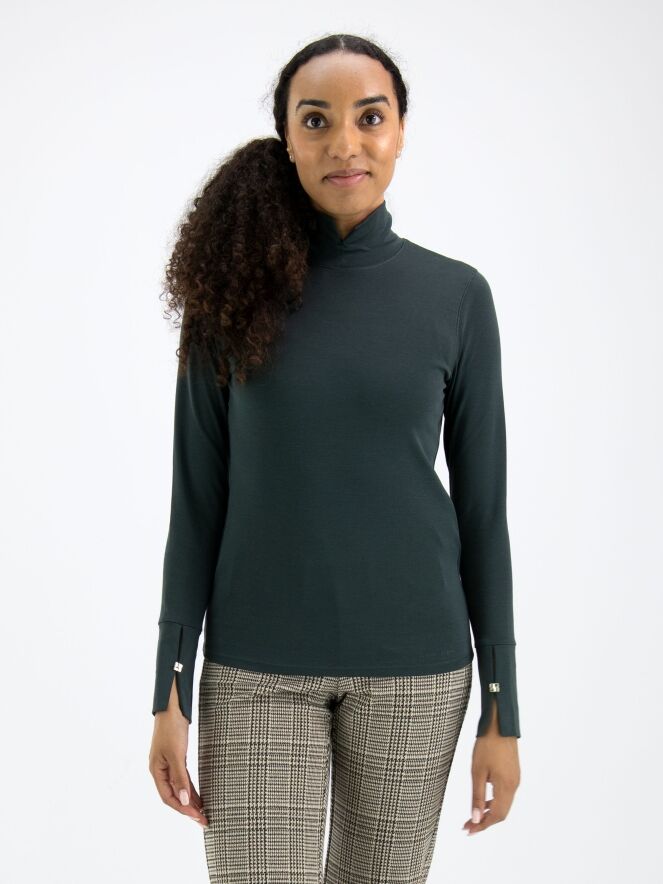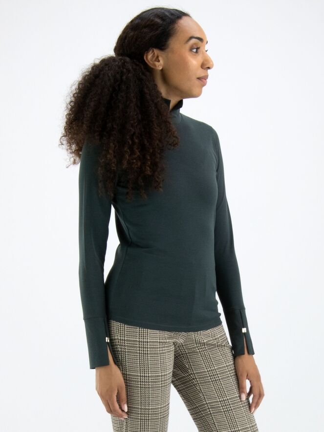 A shirt from Marc Cain in dark green. The shirt has long sleeves and a turtleneck with a small slit at the front. This shirt can be washed at 30 degrees.