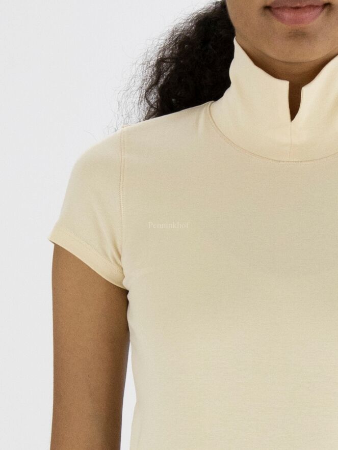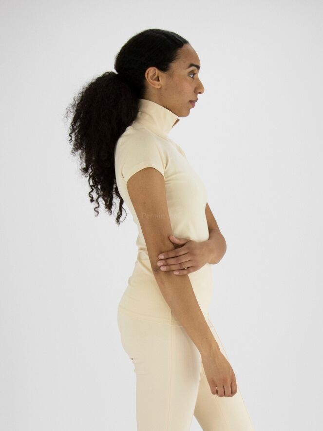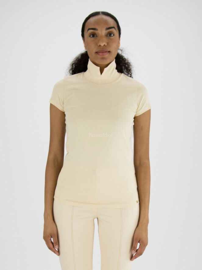 A Marc Cain shirt in the color sand. The shirt has short sleeves and a turtle neck. This shirt can be washed at 30 degrees.