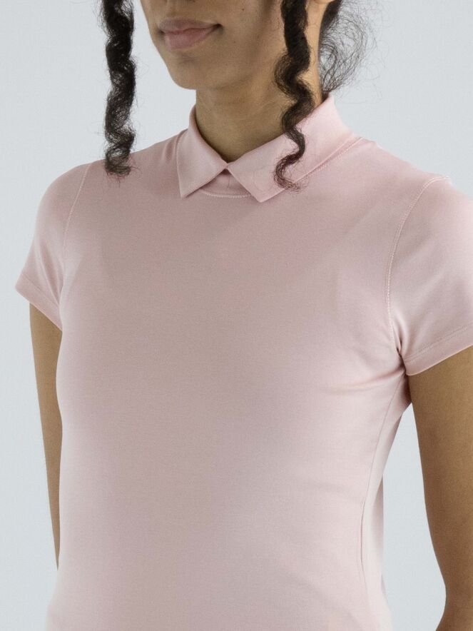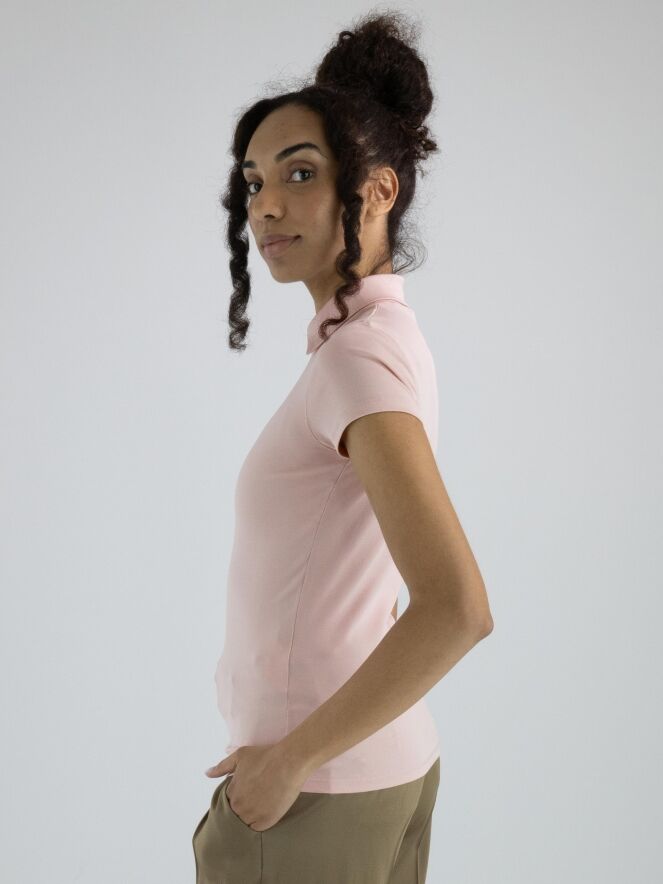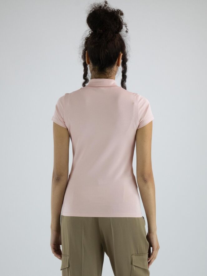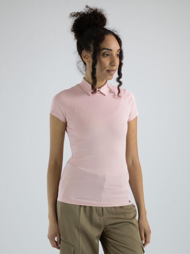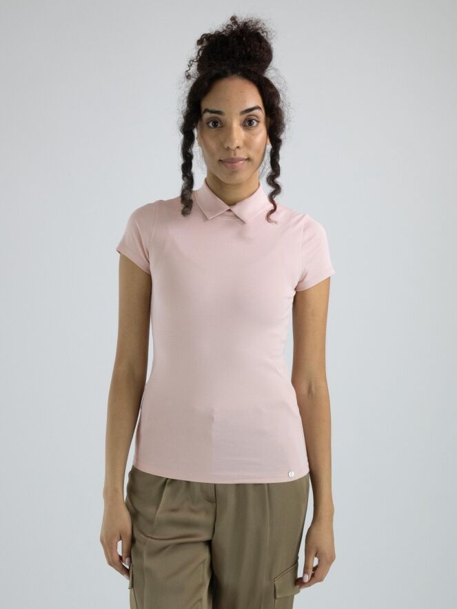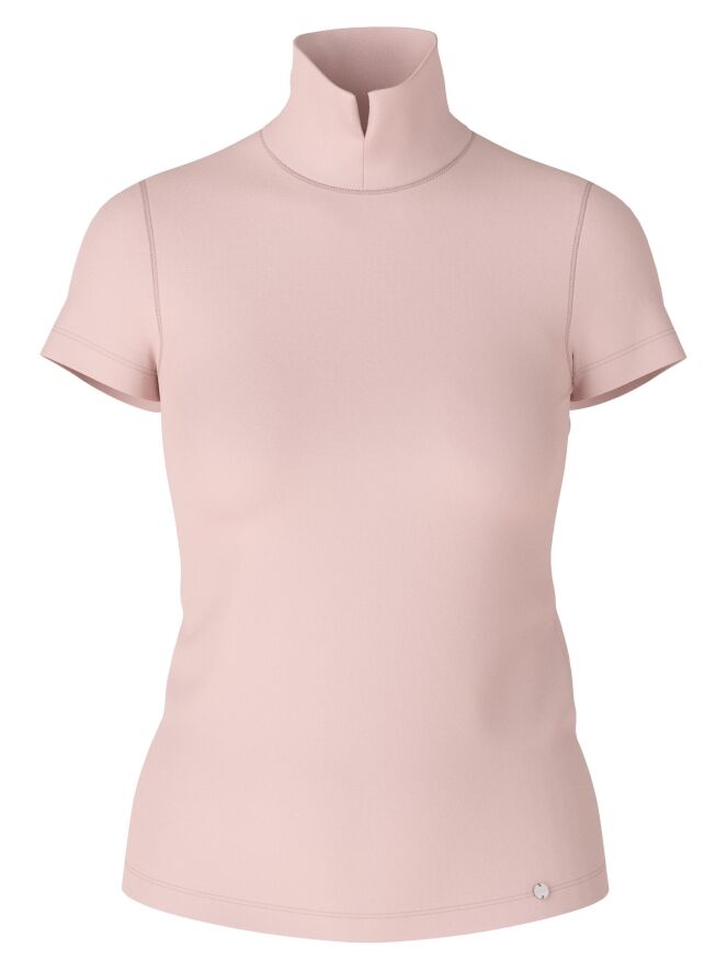A pink shirt from Marc Cain. The shirt has short sleeves and a turtleneck. There is a small slit at the front of the turtleneck. This shirt can be washed at 30 degrees.