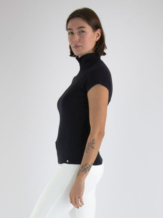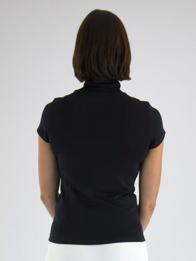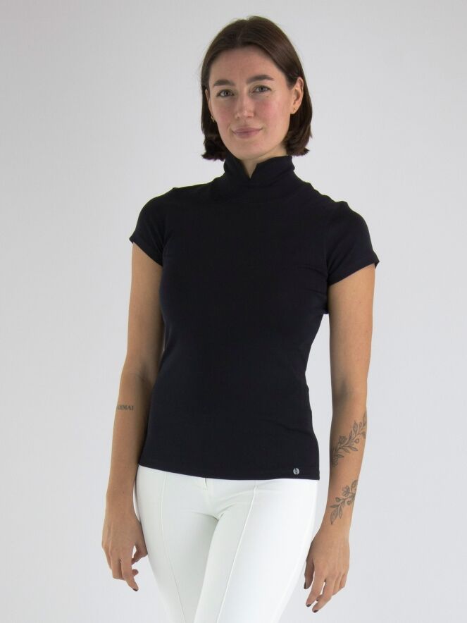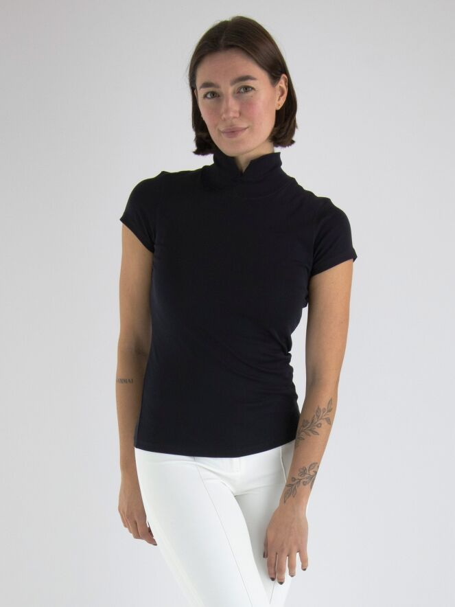 A navy blue shirt from Marc Cain. The shirt has short sleeves and a turtleneck. There is a small slit at the front of the turtleneck. This shirt can be washed at 30 degrees.