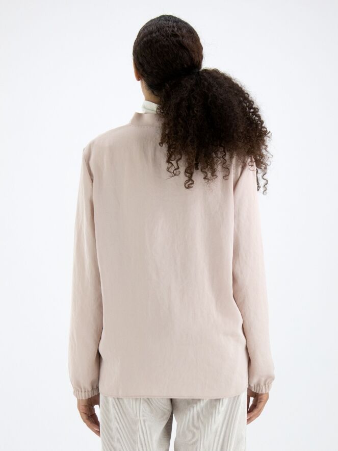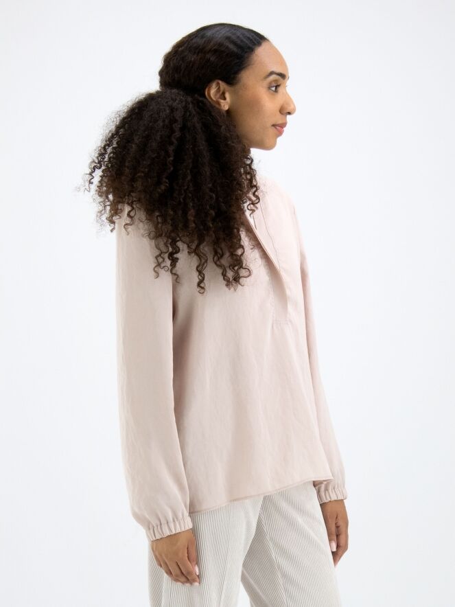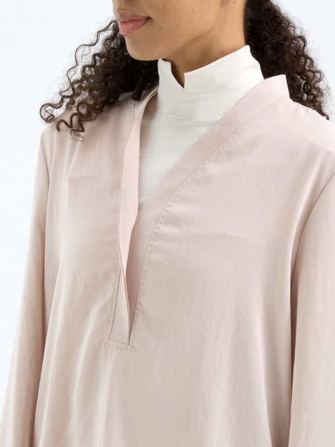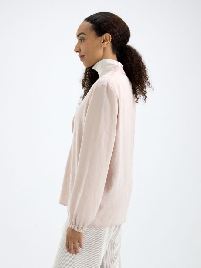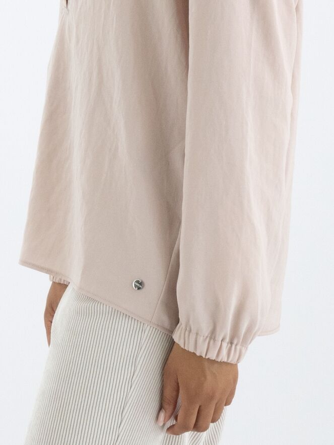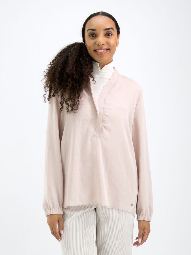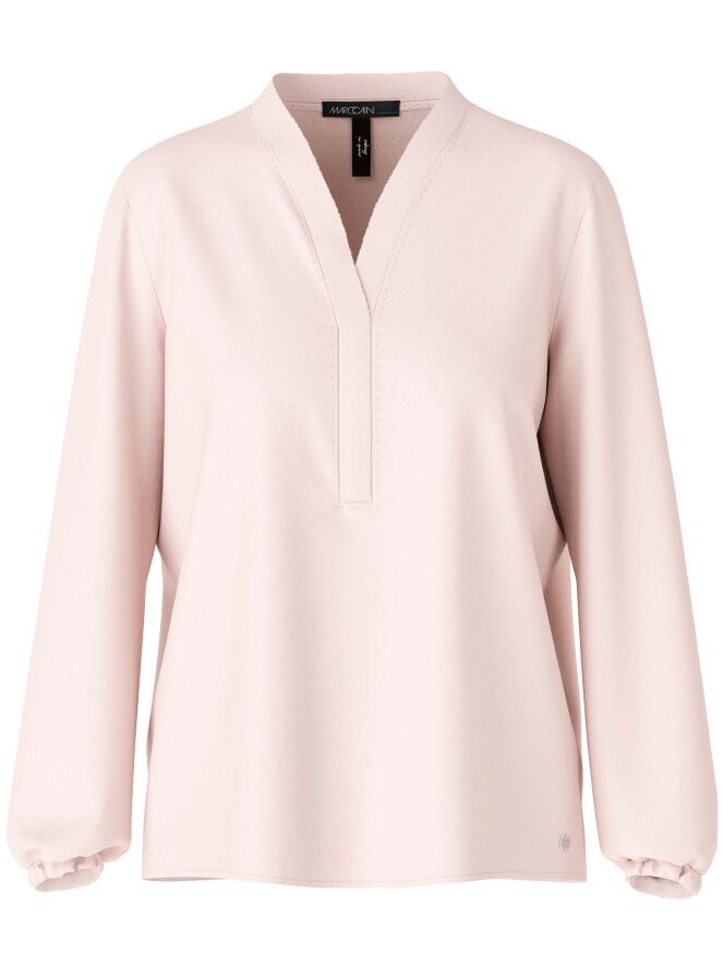 A blouse from Marc Cain in pastel pink. Along the edge of the V-neck is a trim made of double fabric with a decorative topstitched seam. At the ends of the long sleeves, there is an elastic finely pleated trim. This blouse can be washed at 30 degrees.