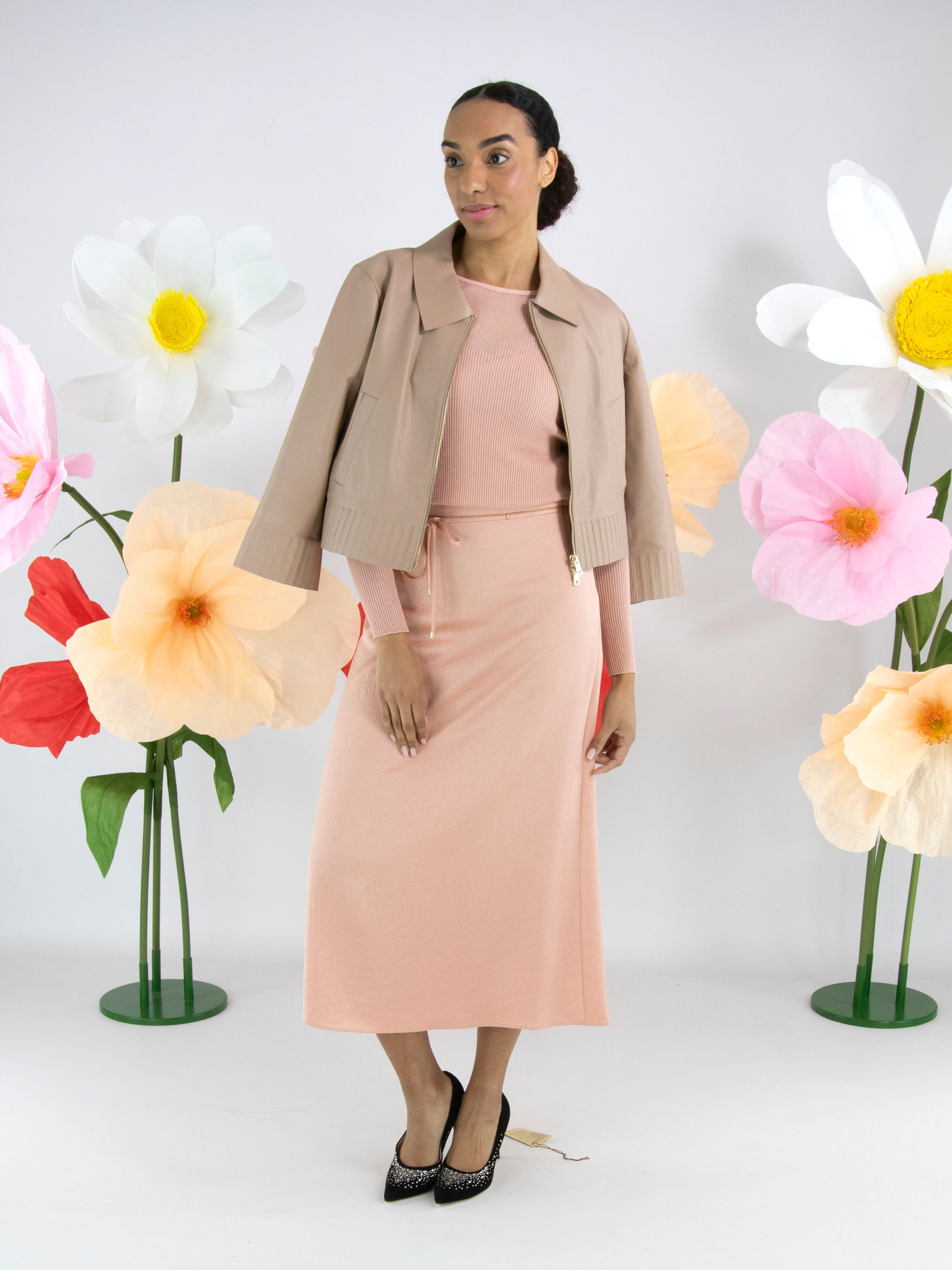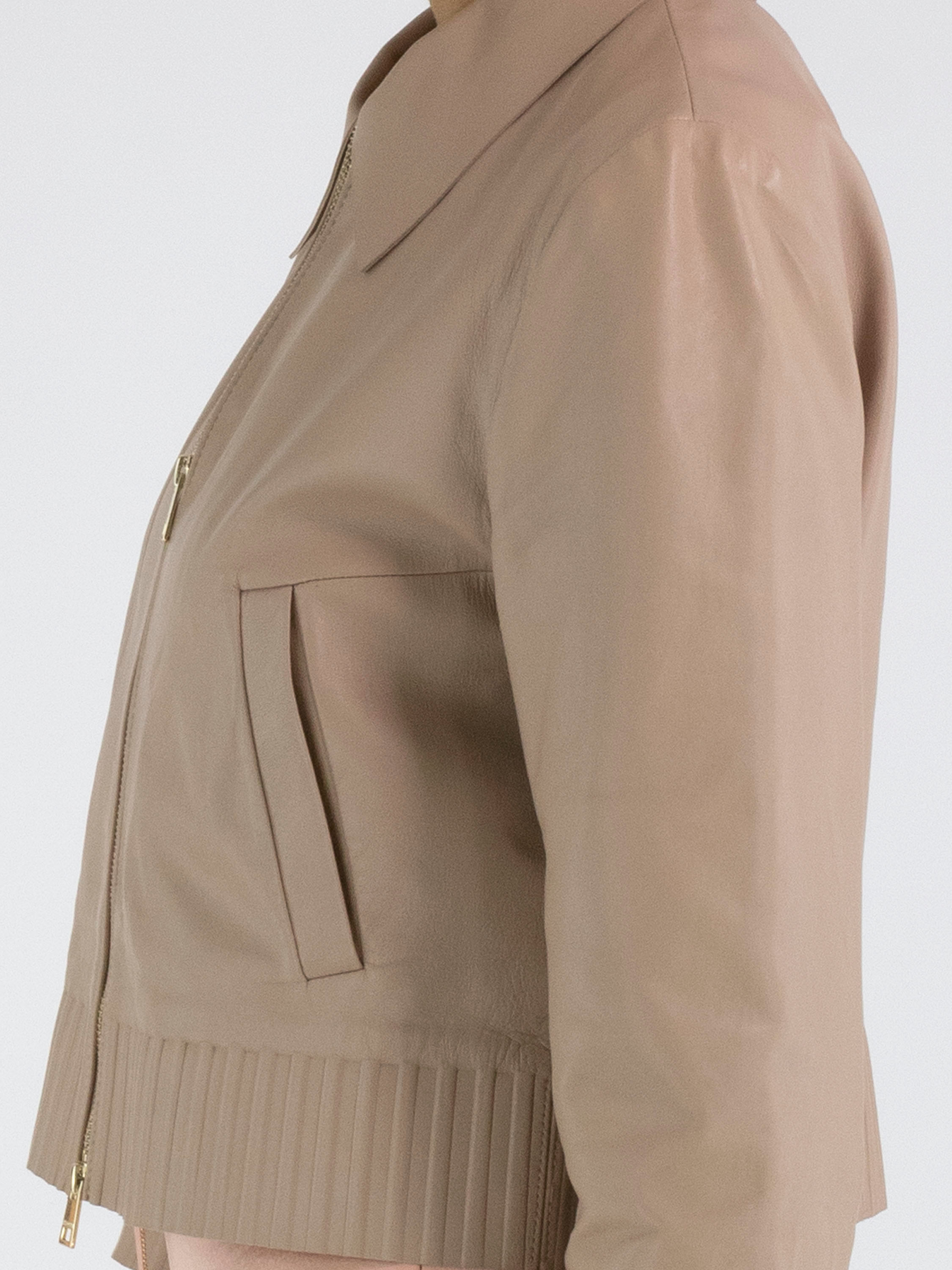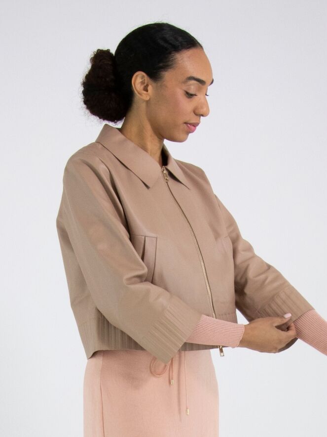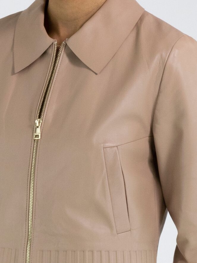 A short leather coat from Marc Cain in a soft taupe colour. The coat features a collar and a zipper. At the hem and at the ends of the long sleeves is a wide band with a ribbed pattern embossed into the leather. This coat must not be washed.