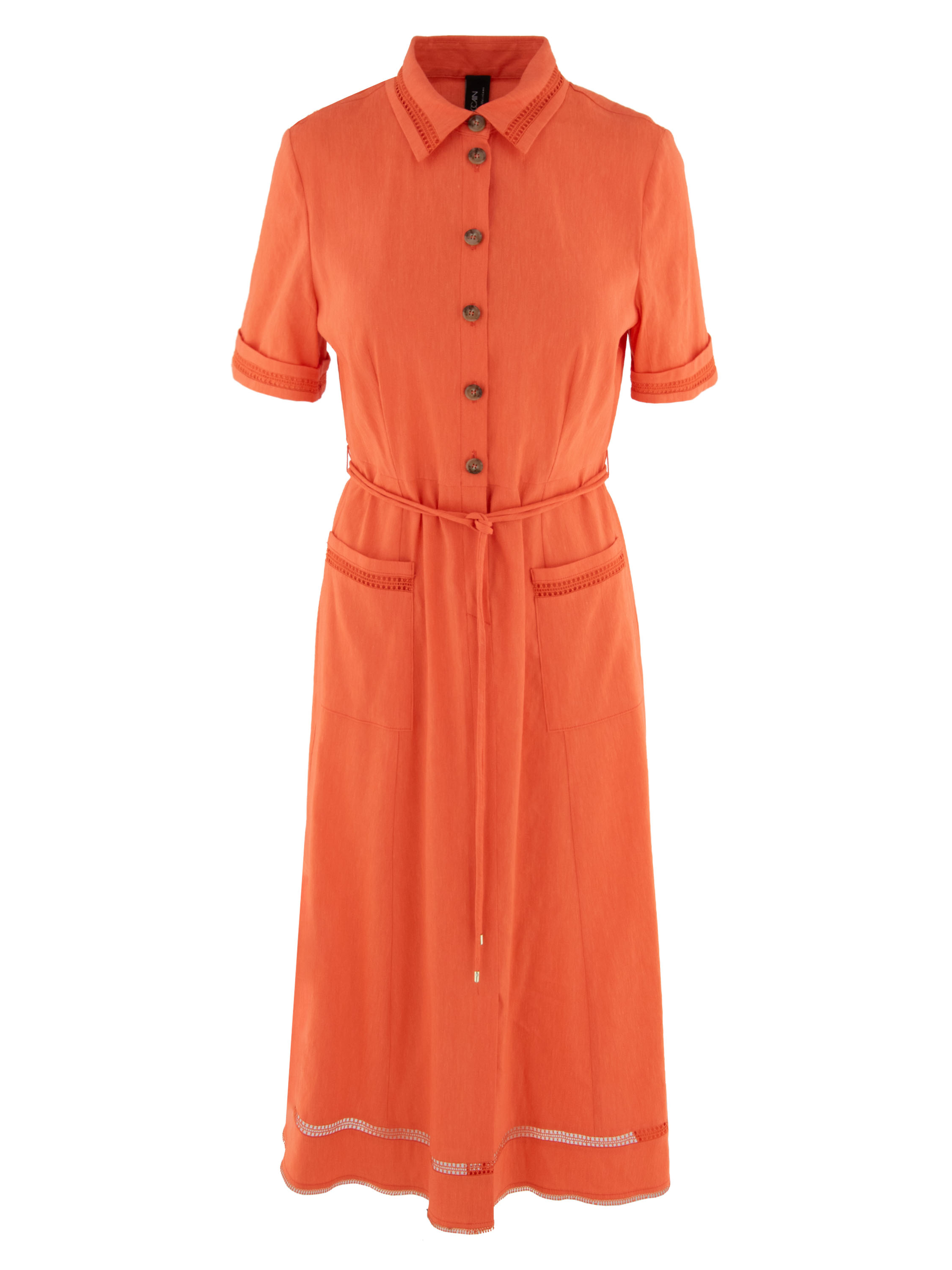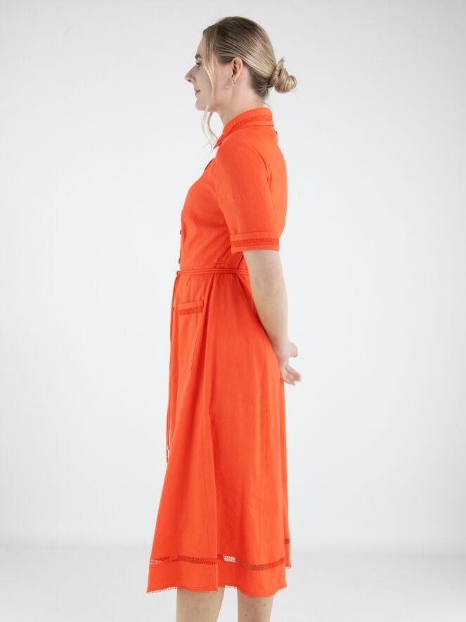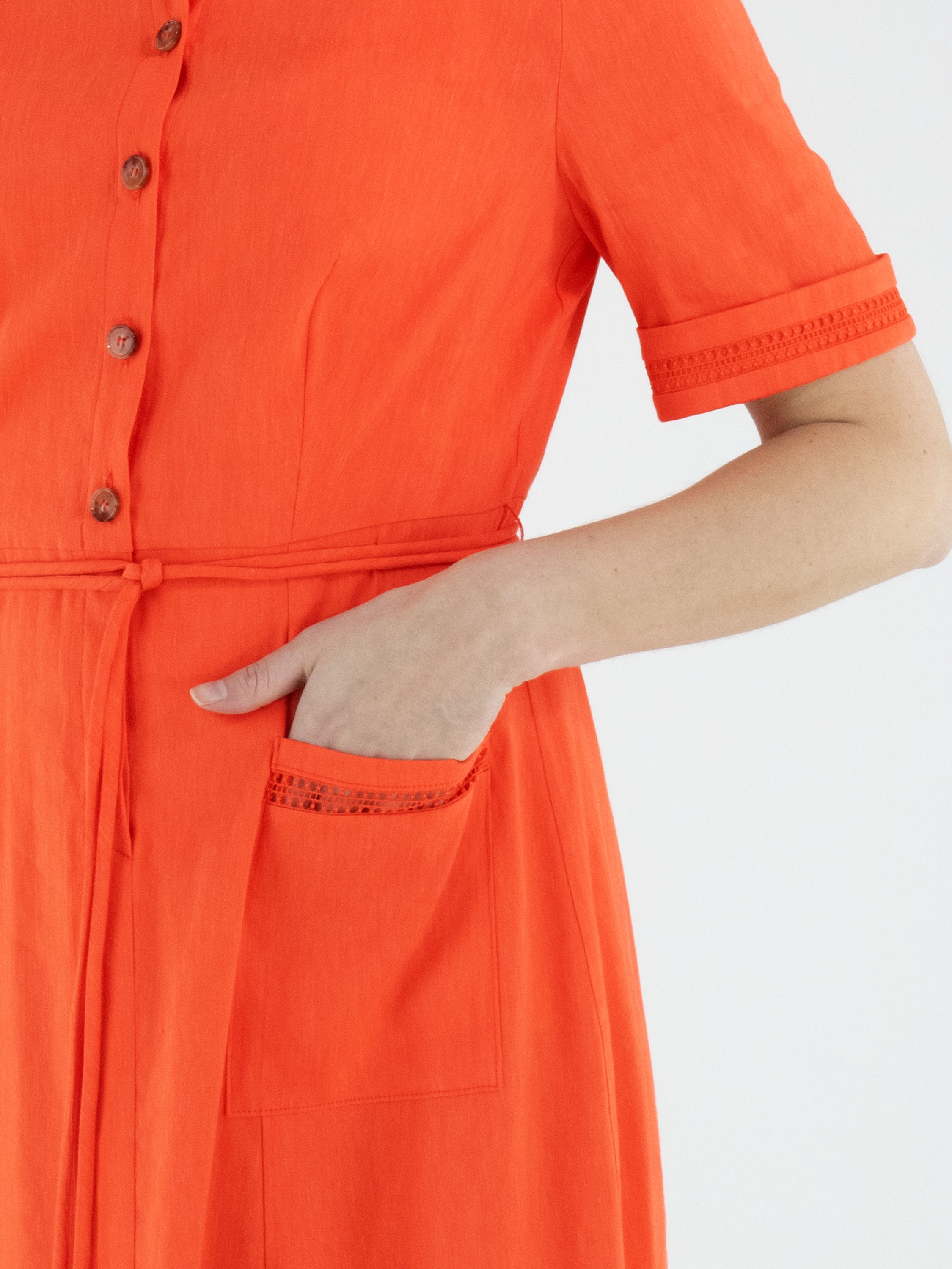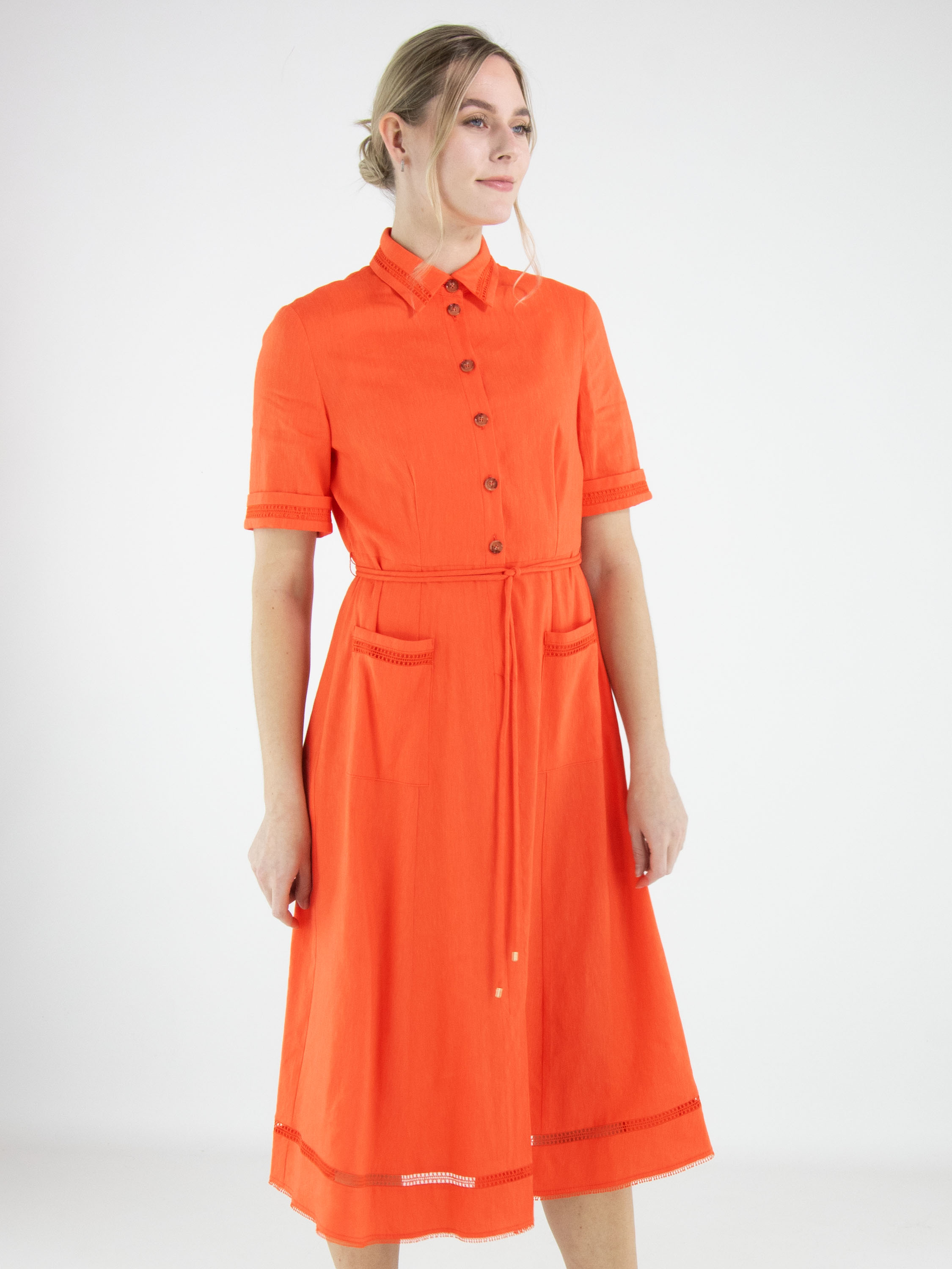 Dress by Marc Cain in a fresh coral red shade. Delicate openwork trim details the collar edge, the turned-up short sleeves, the pocket edges, and the hem, adding a subtle feminine touch. The button fastening extends to below the waist. A matching drawstring belt in the same fabric defines the waist elegantly. From the waist down, the dress falls into a gentle A-line silhouette. This dress can be washed at 30 degrees.