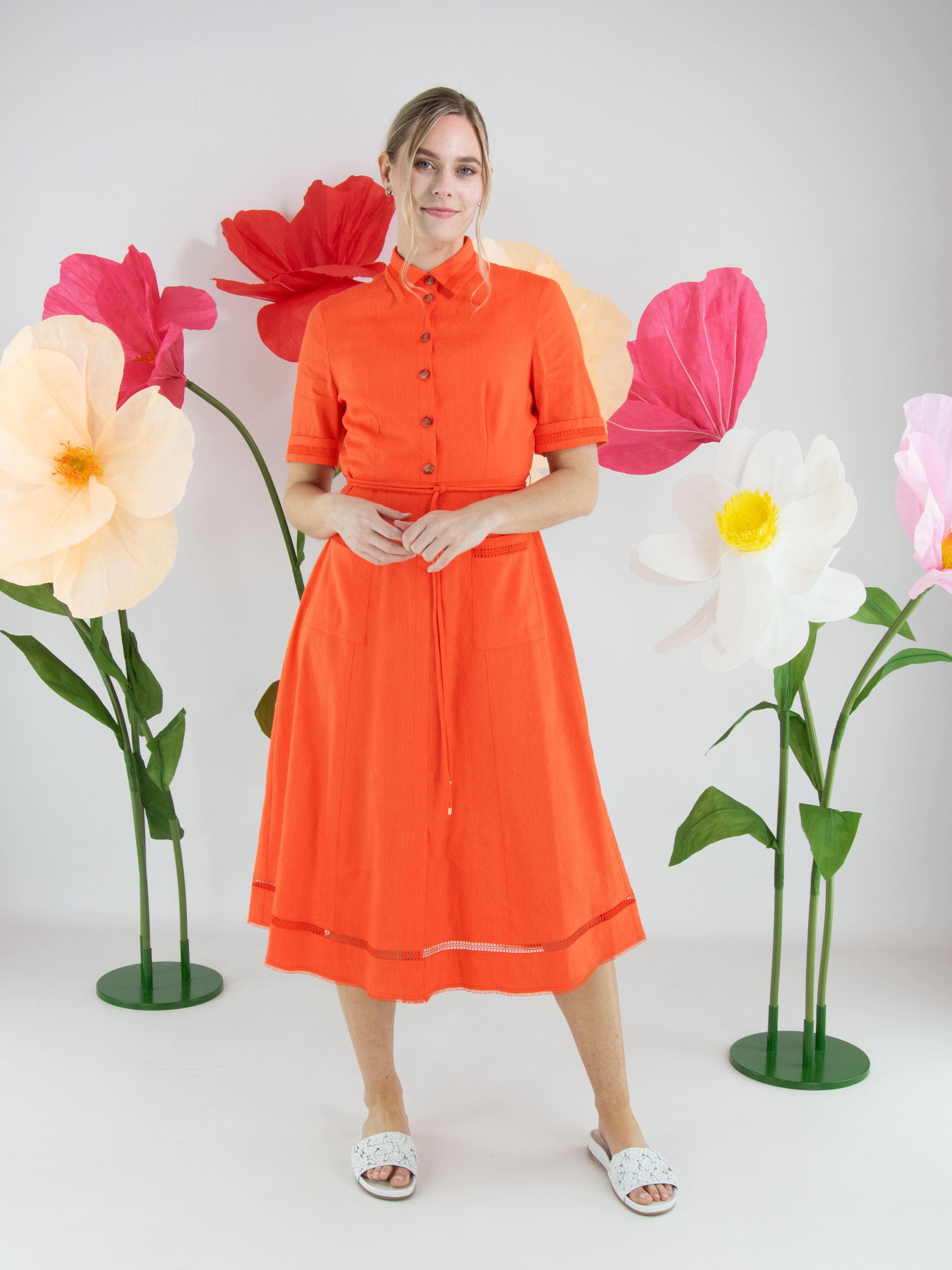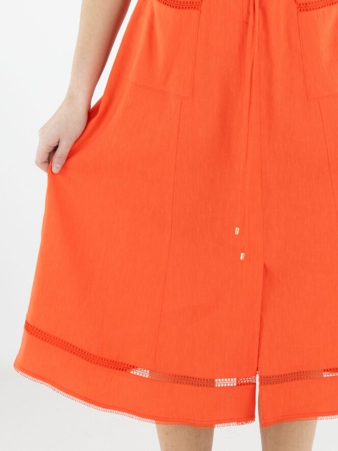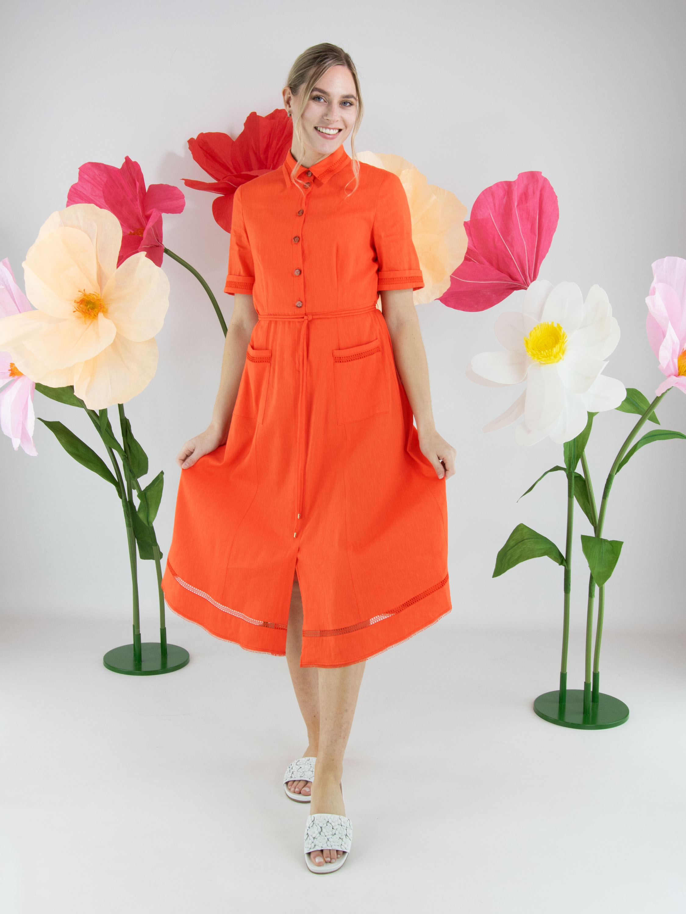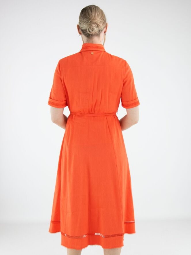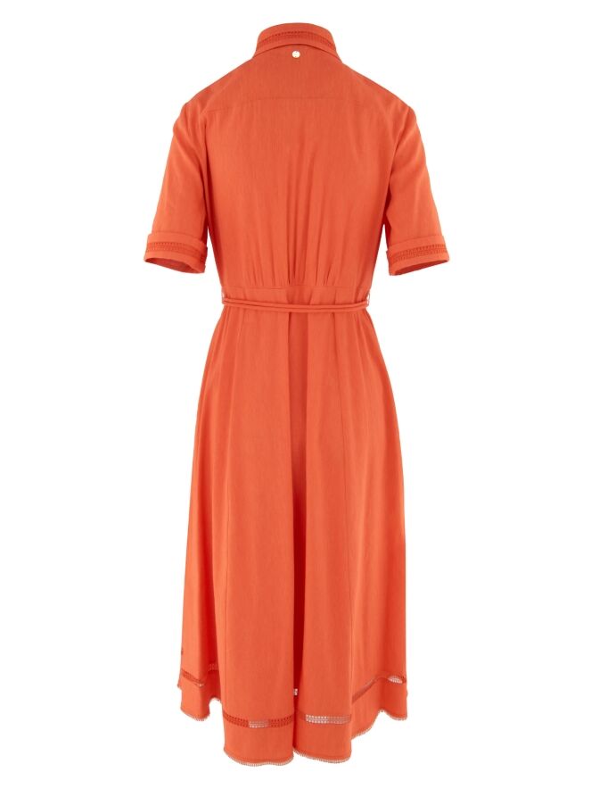Dress by Marc Cain in a fresh coral red shade. Delicate openwork trim details the collar edge, the turned-up short sleeves, the pocket edges, and the hem, adding a subtle feminine touch. The button fastening extends to below the waist. A matching drawstring belt in the same fabric defines the waist elegantly. From the waist down, the dress falls into a gentle A-line silhouette. This dress can be washed at 30 degrees.