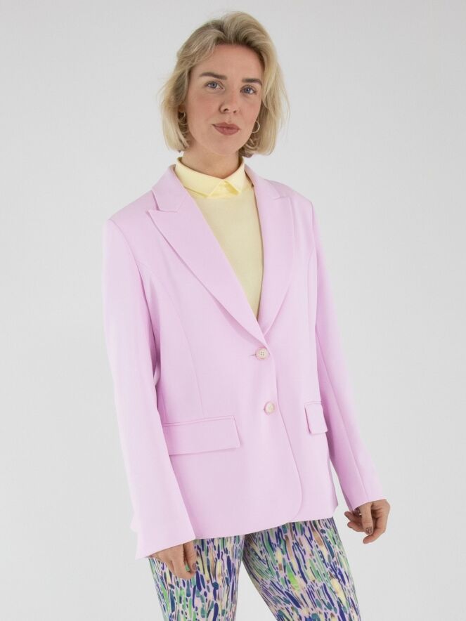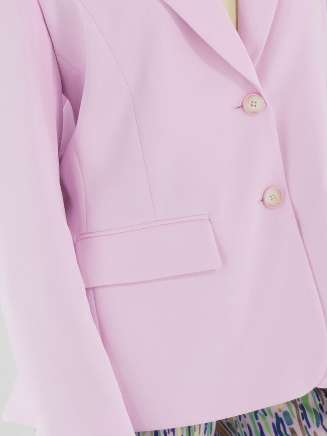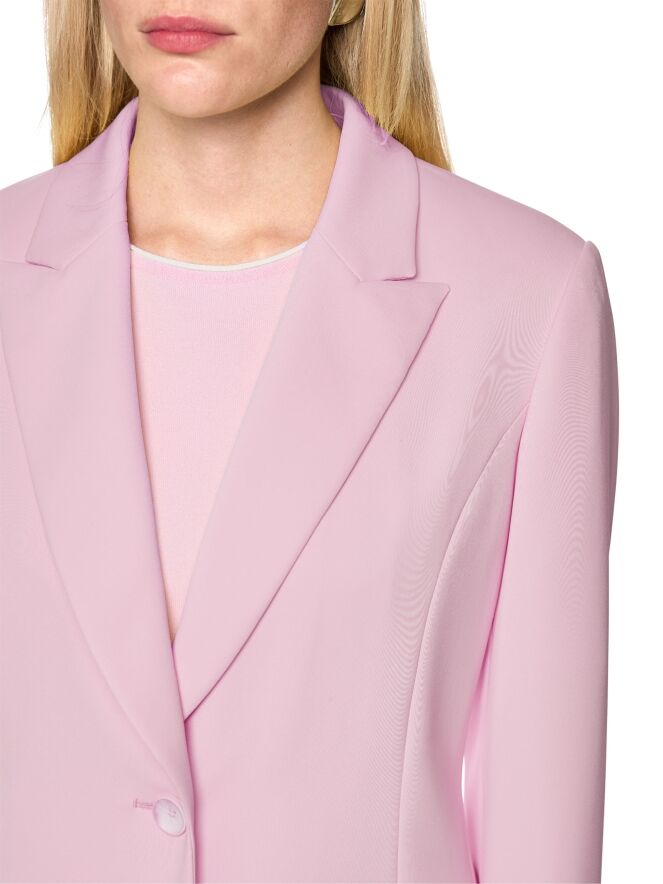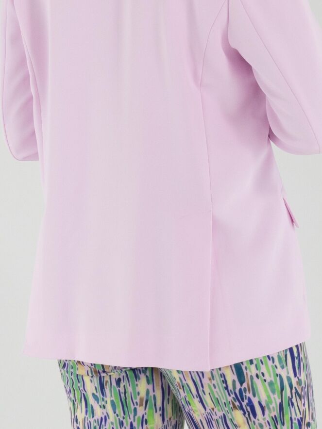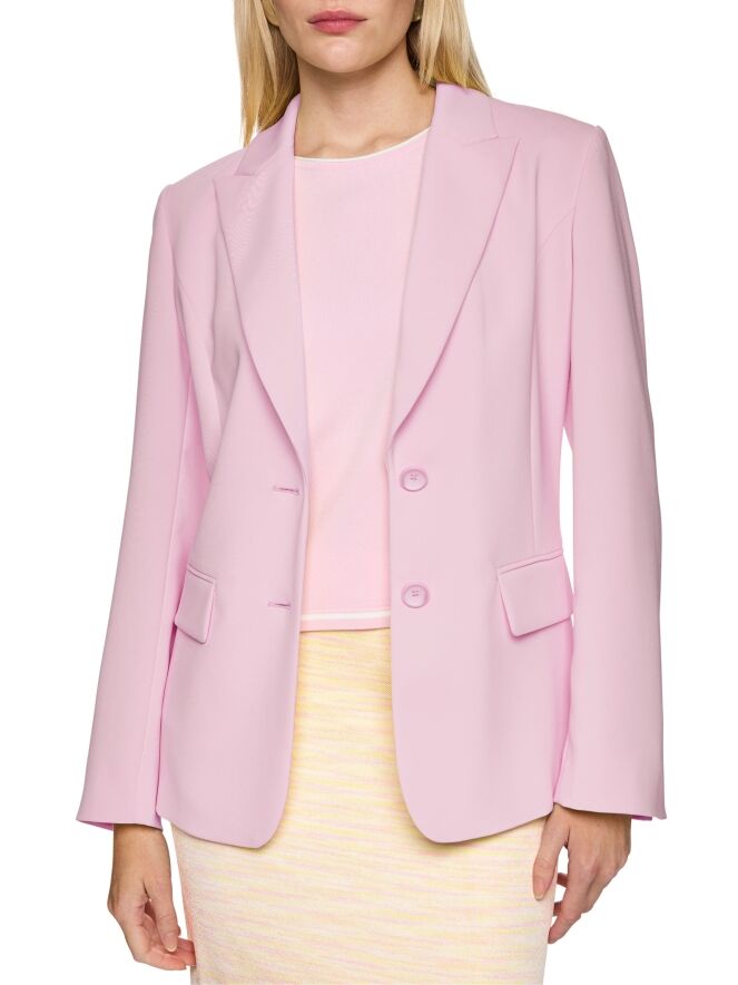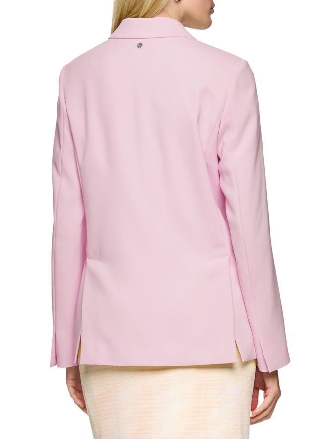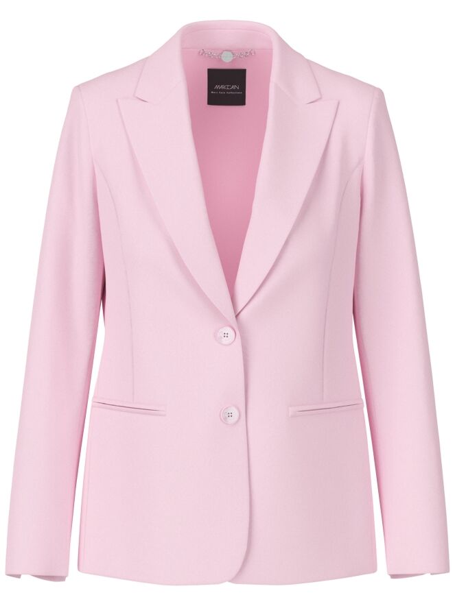 A blazer by Marc Cain in a bright pink shade. The blazer features a two-button closure. The cuffs of the long sleeves are finished with a short slit. At the back, two slits are positioned at the hem on either side of the centre. This blazer must not be washed.