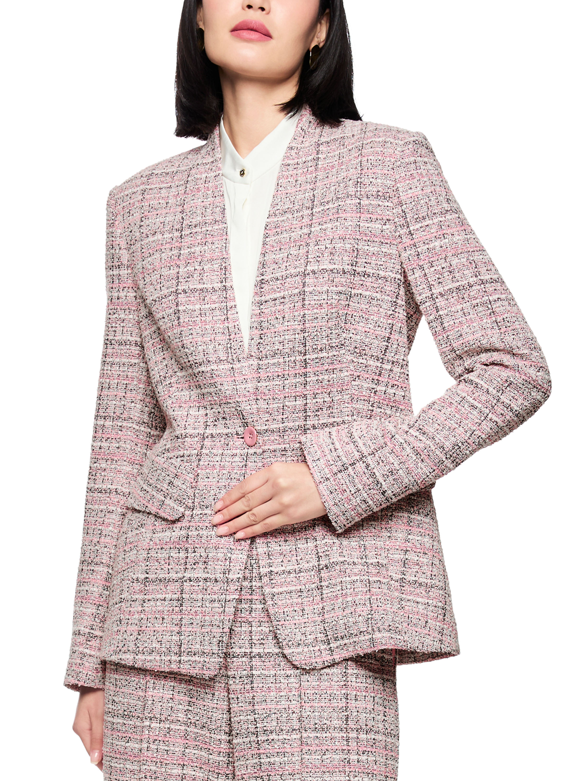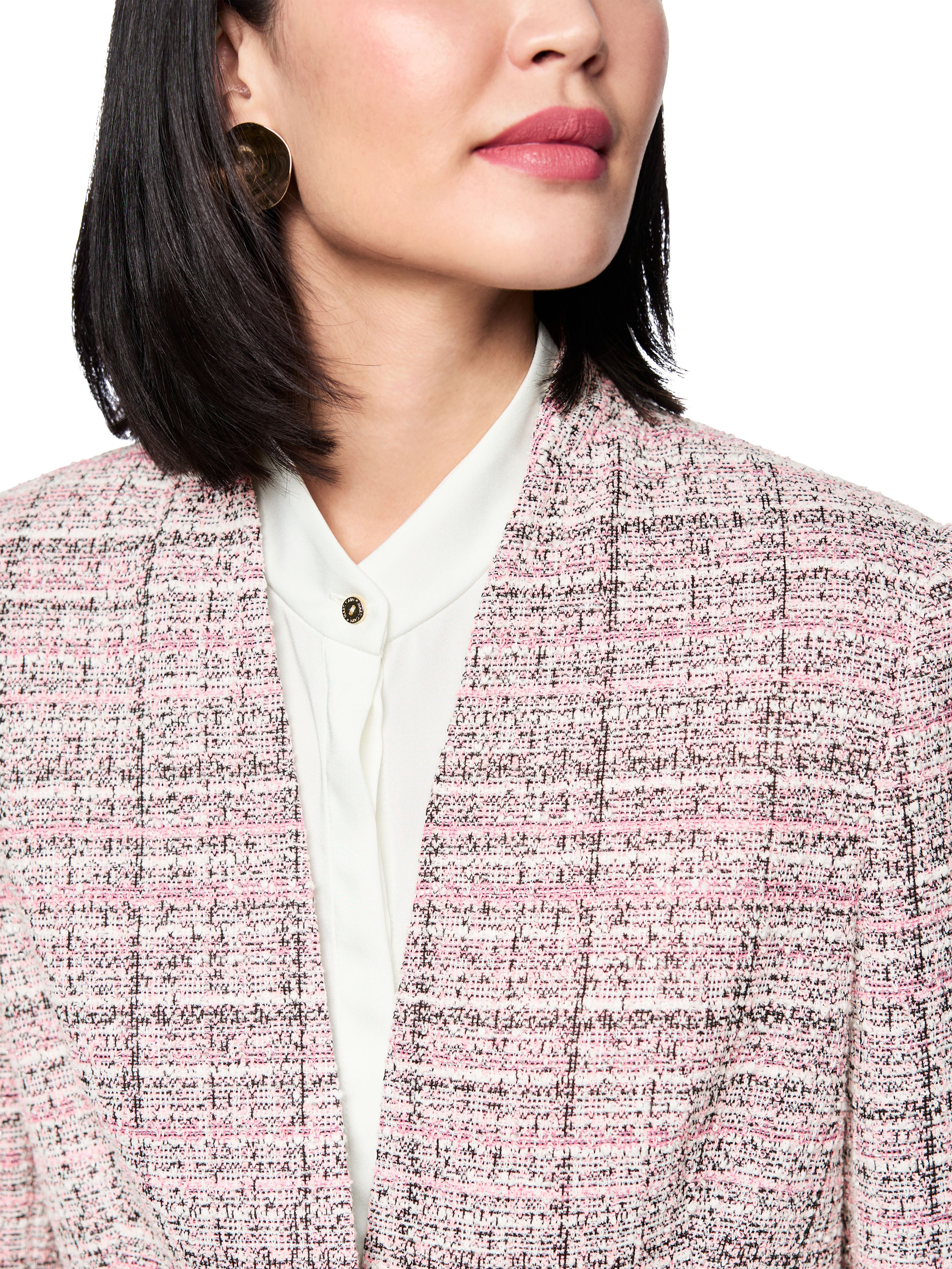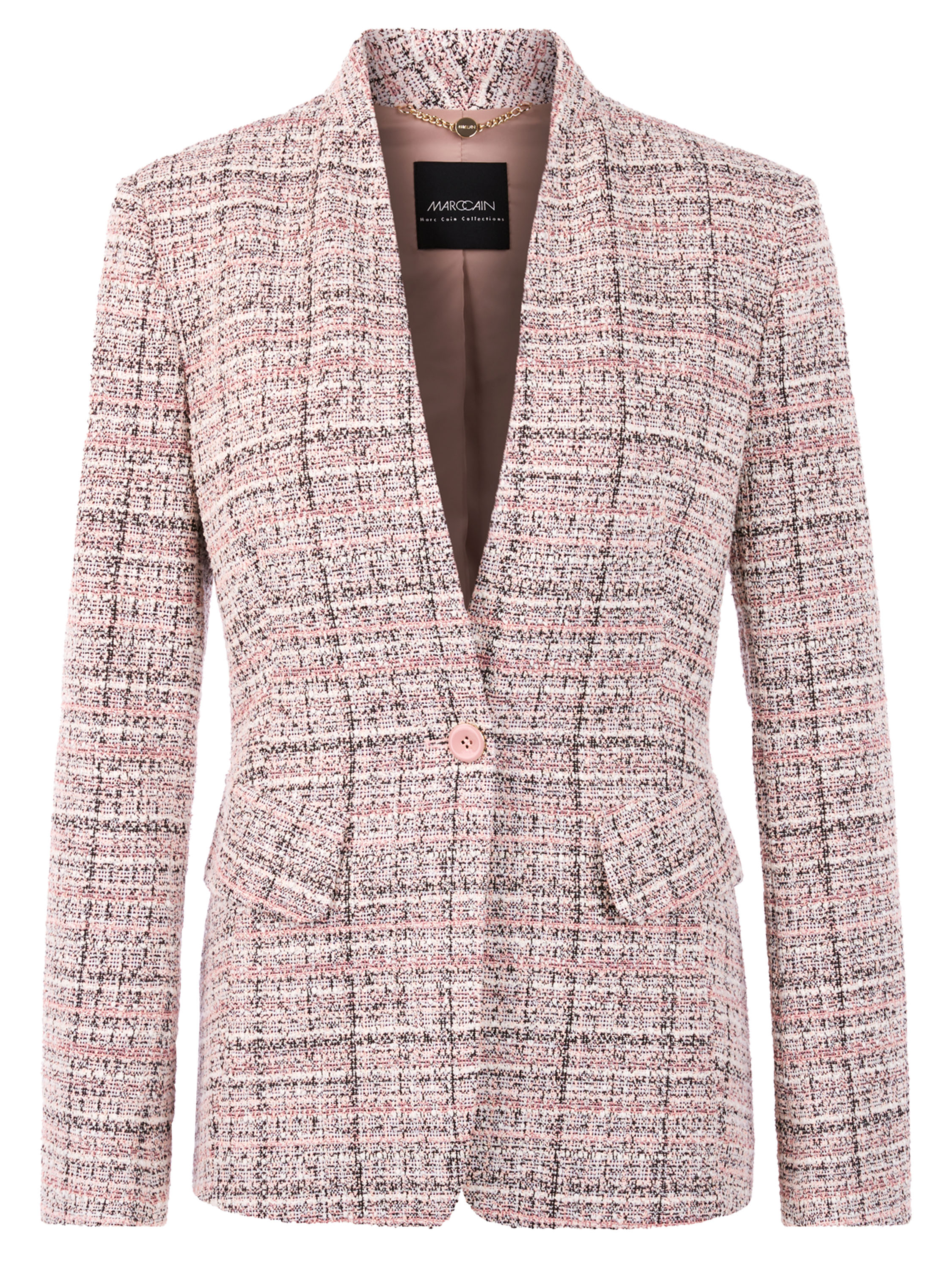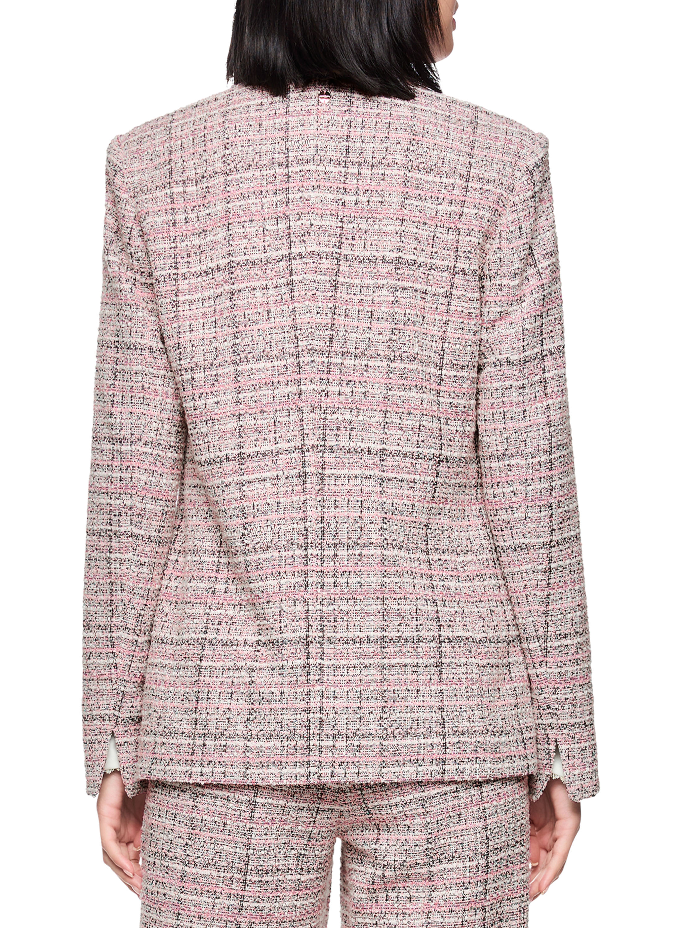 A blazer in a tweed look with salmon pink, off-white, nude and black tones. The blazer closes with a single enamelled button. At the ends of the long sleeves is a short slit. The blazer is lined and must not be washed.