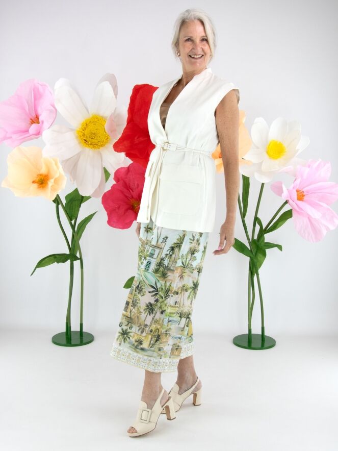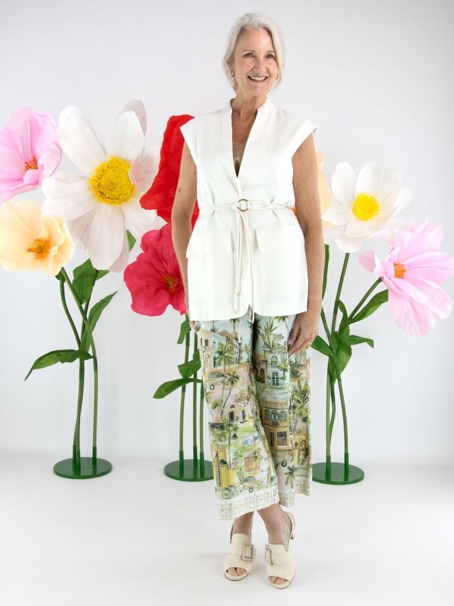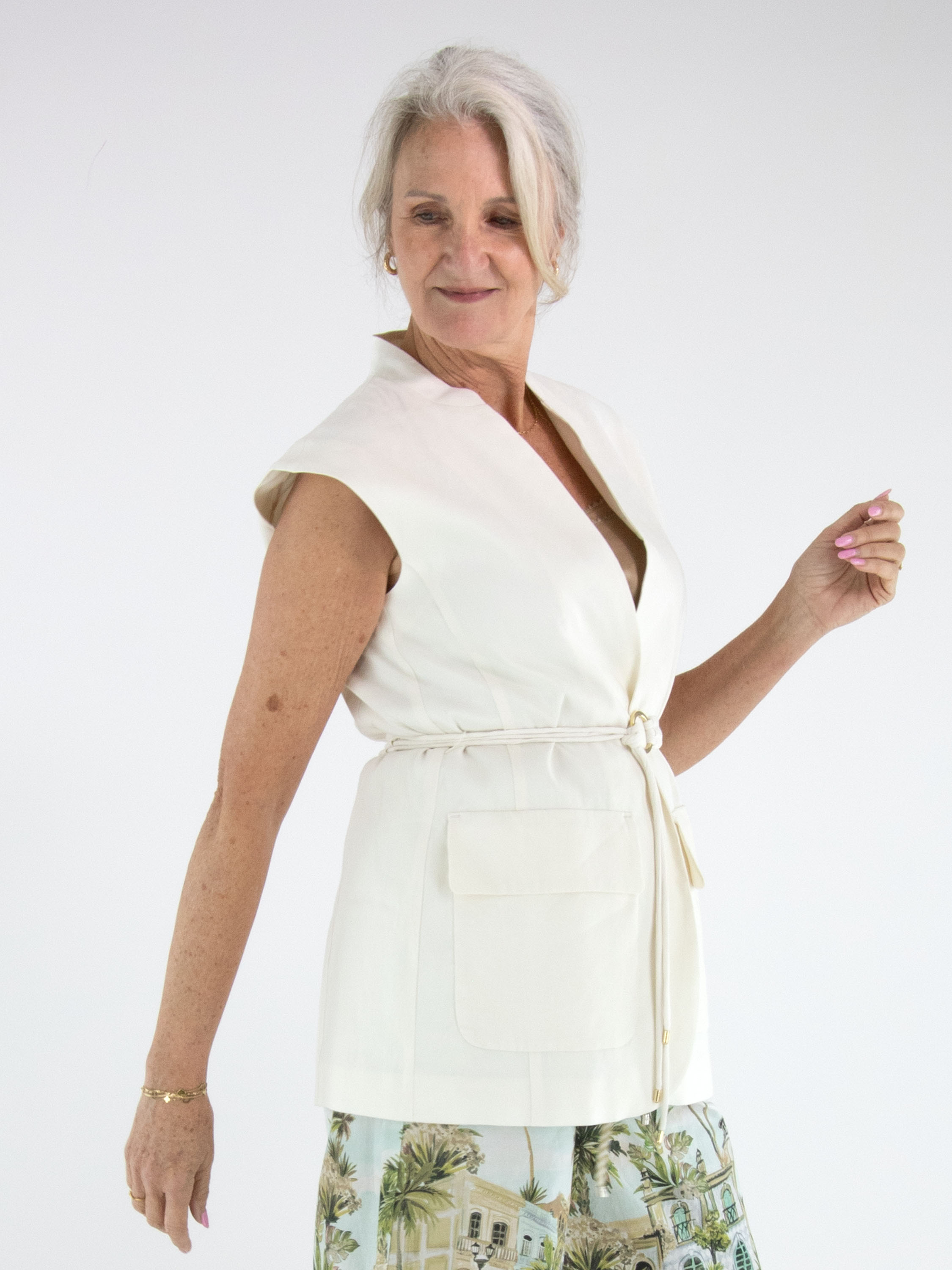Gilet by Marc Cain in an elegant off-white shade. At the waist, a belt composed of three cords in matching fabric and color is finished with a round gold-tone buckle, adding a refined detail. The gilet fastens with a single press stud and is fully lined for a graceful drape and enhanced comfort. This gilet can be washed at 30 degrees.