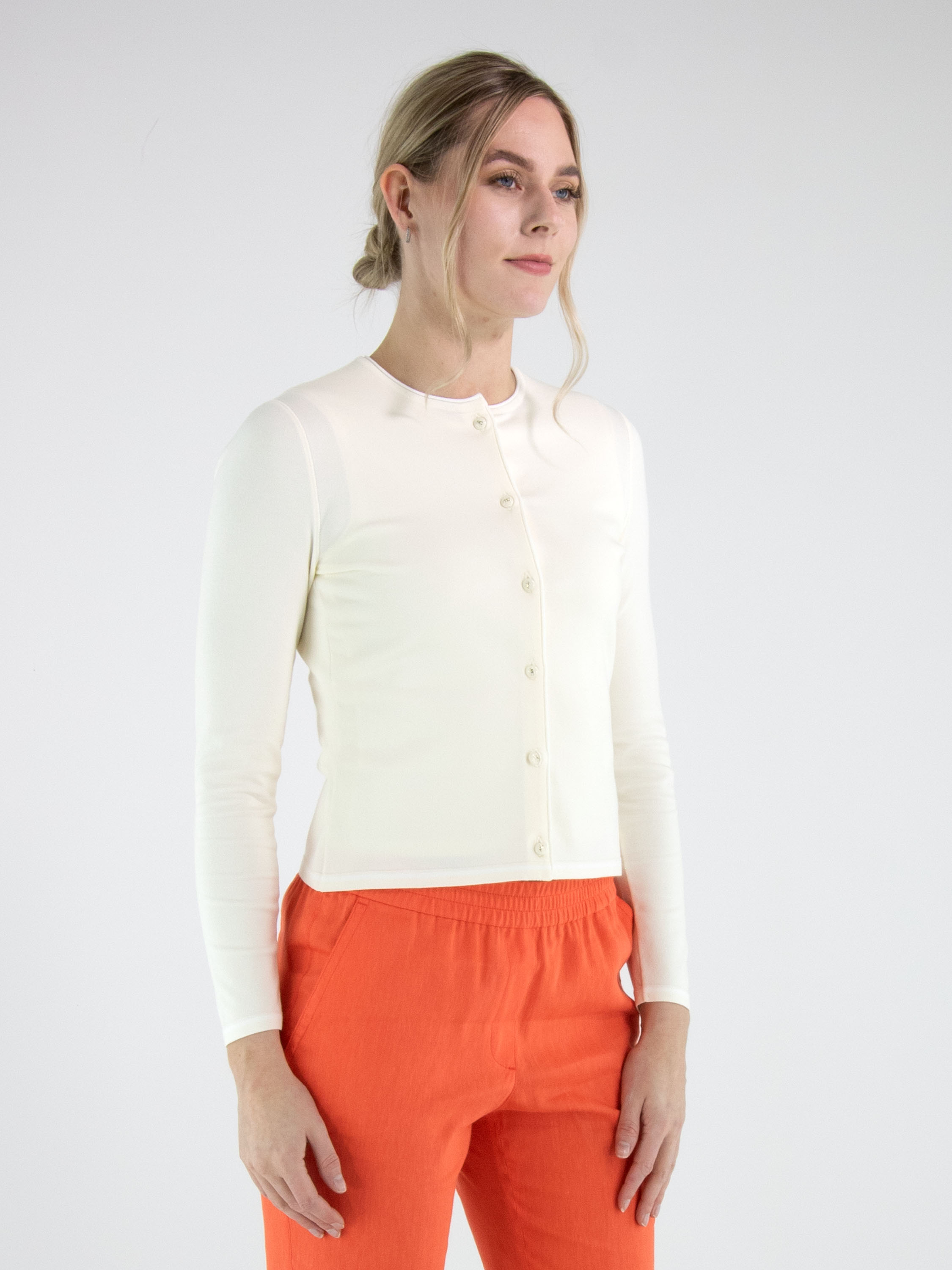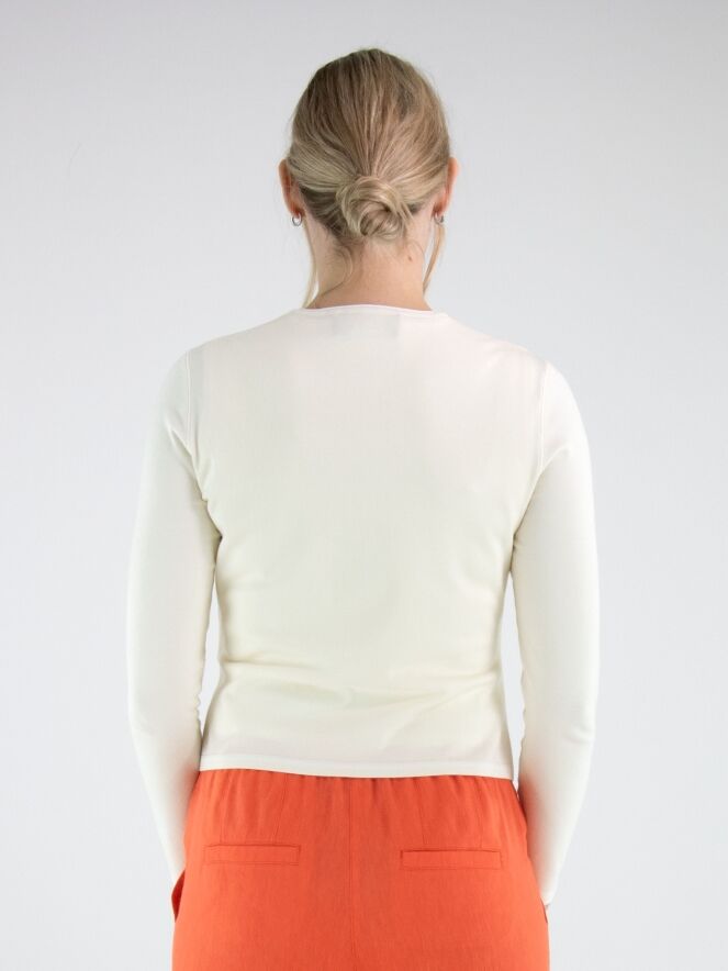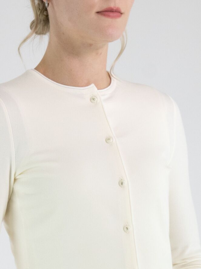 Cardigan by Marc Cain in an elegant off-white shade. A finely ribbed knit trim with a subtle printed white stripe details the round neckline, the cuffs of the long sleeves, and the hem, adding a refined yet sporty touch. The cardigan features a button fastening and can be washed at 30 degrees.