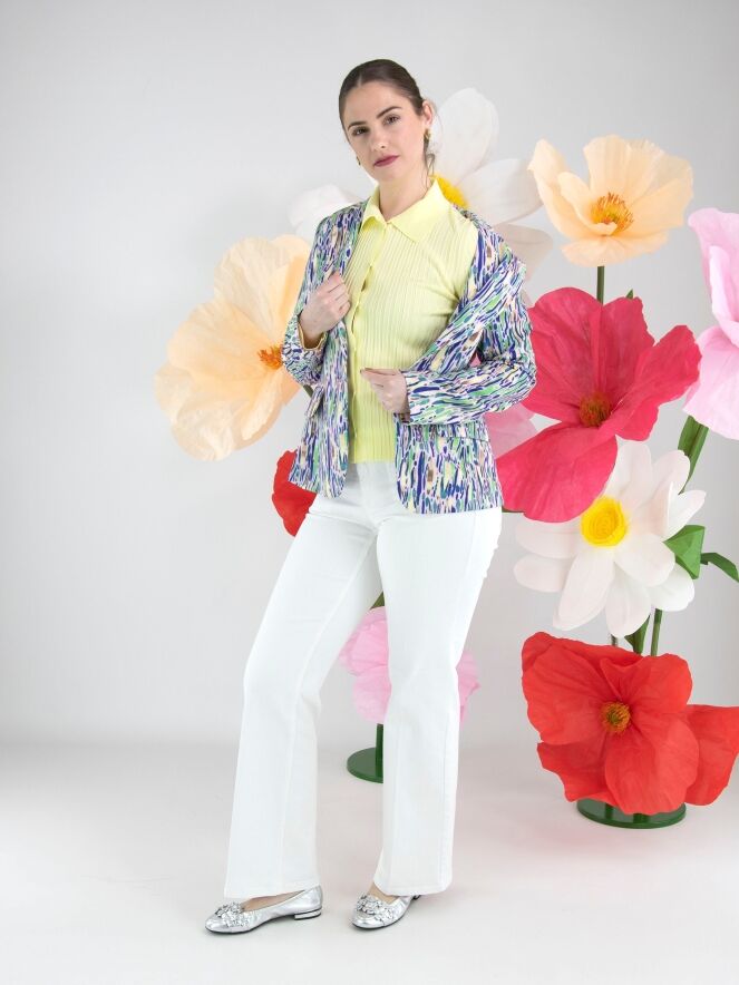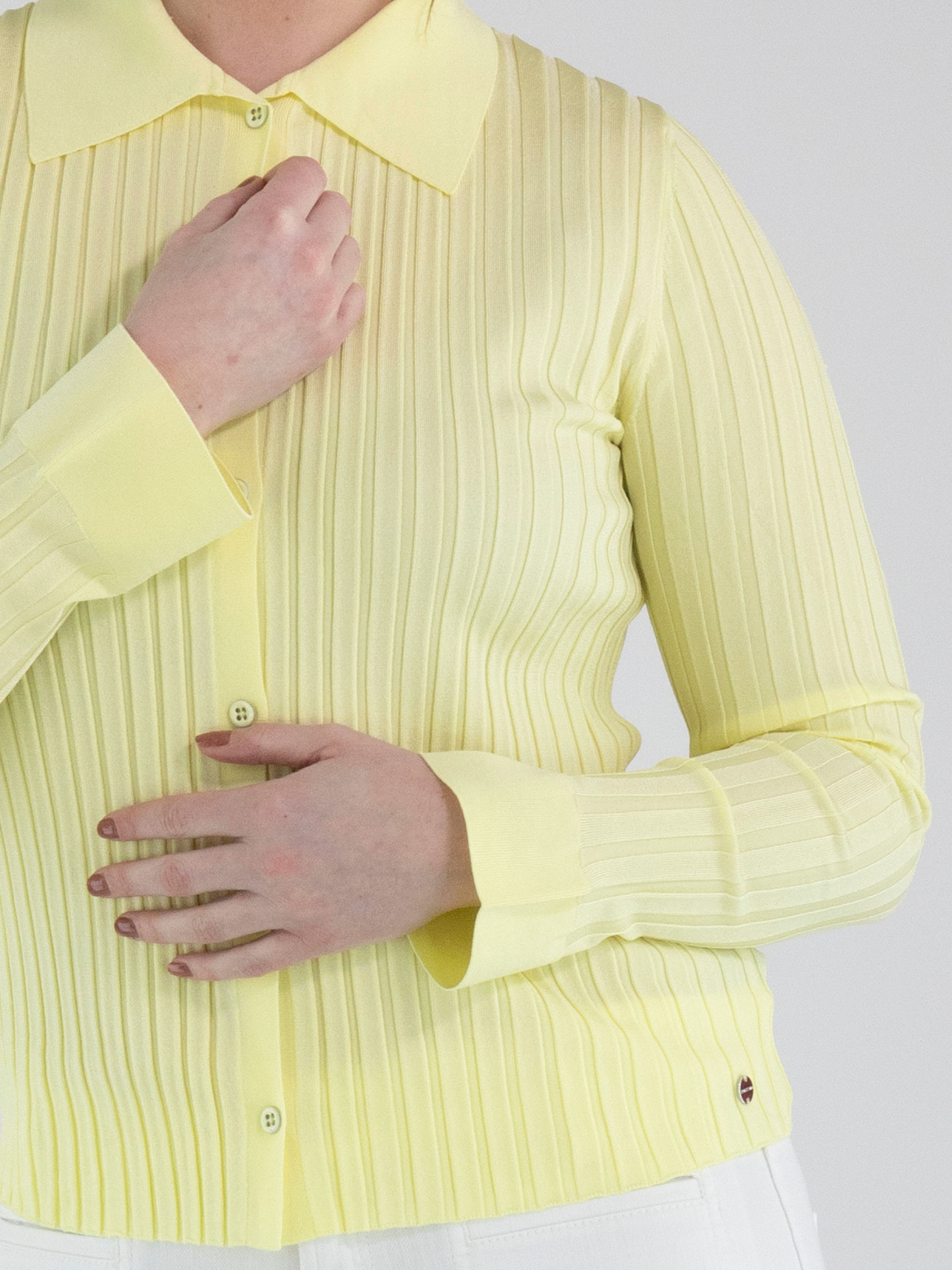 A cardigan by Marc Cain in a pastel yellow shade. The fabric features a wide ribbed structure. The collar and the ends of the long sleeves are finished with fine ribbing. This cardigan can be hand-washed.