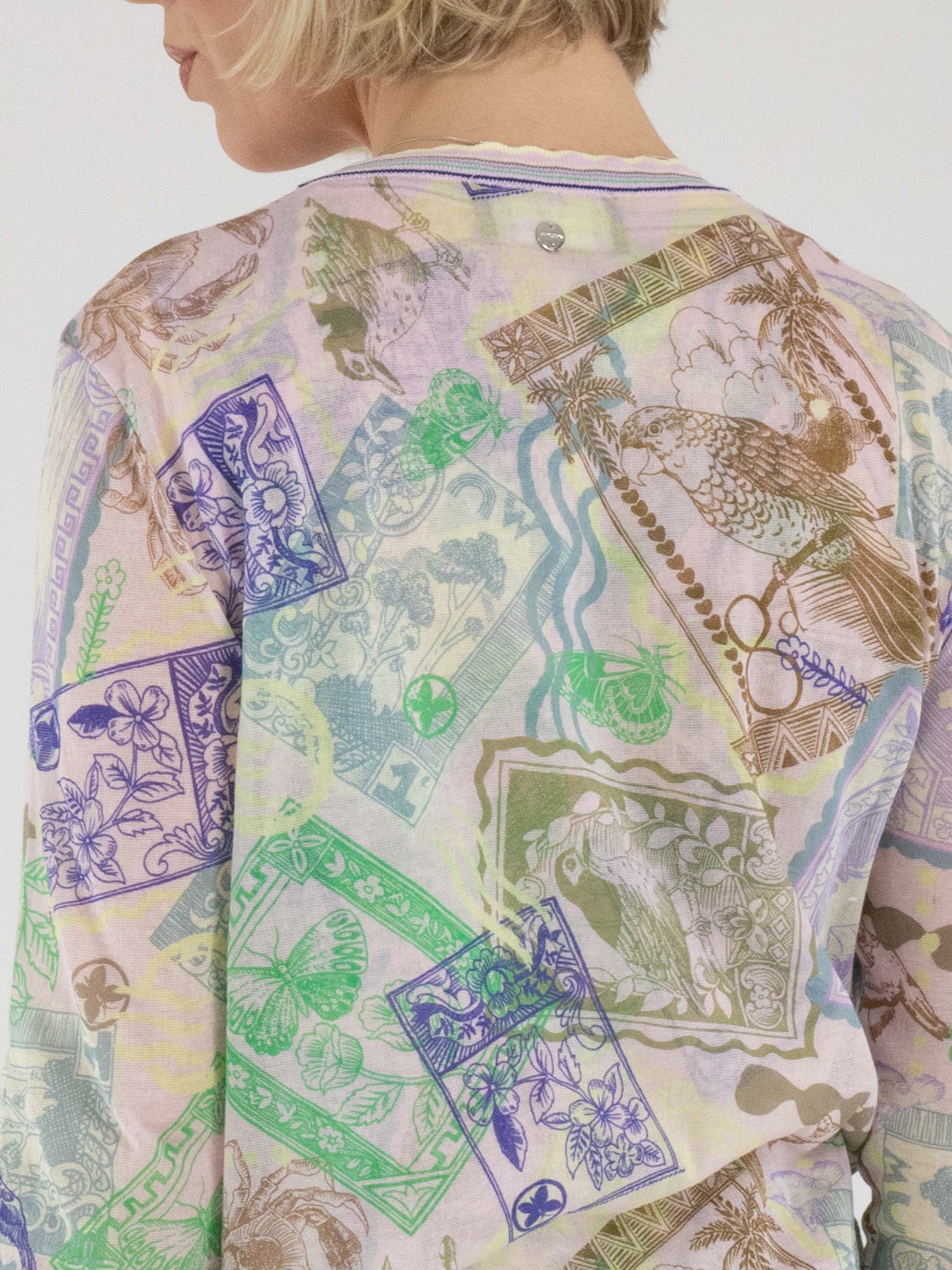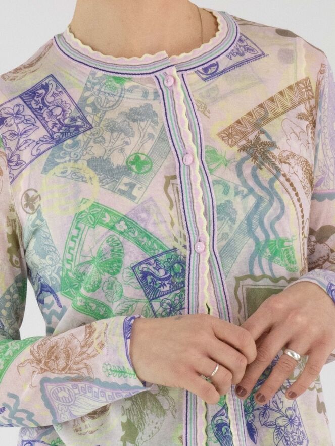 A lightly transparent cardigan by Marc Cain featuring a stamp print in various pastel shades such as yellow, green and blue on a pink background. The cardigan has a three-button fastening. Along the edge of the closure and the round neckline, a wavy finely ribbed knit trim is applied in a striped pattern matching the colours of the fabric. This cardigan can be washed at 30 degrees.