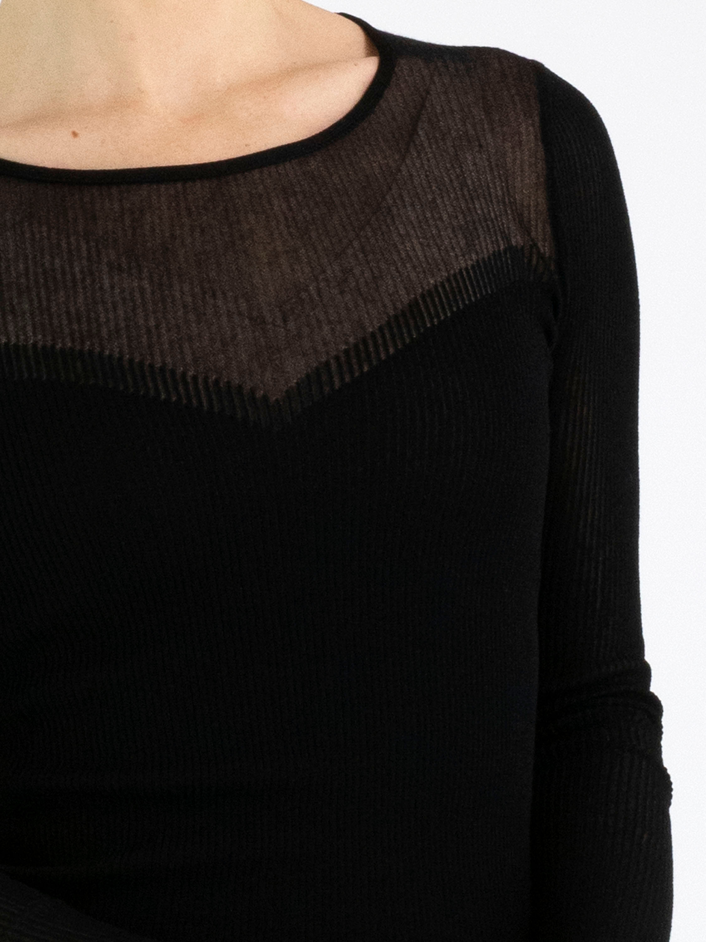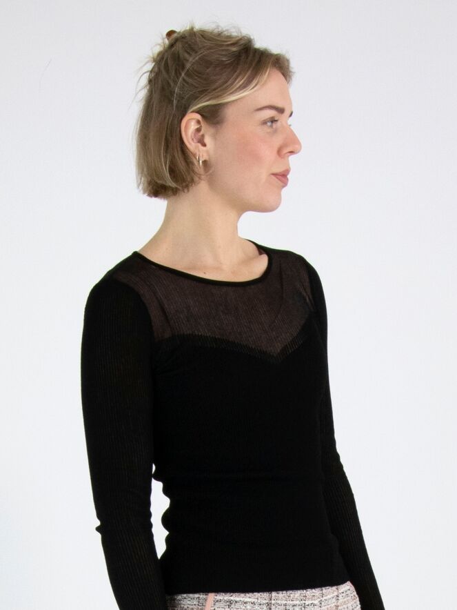 A pullover from Marc Cain in a finely ribbed structure in black. The fabric is slightly sheer up to the bust. The pullover can be washed at 30 degrees.