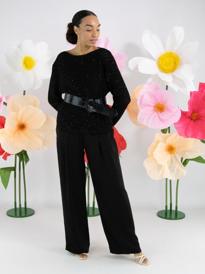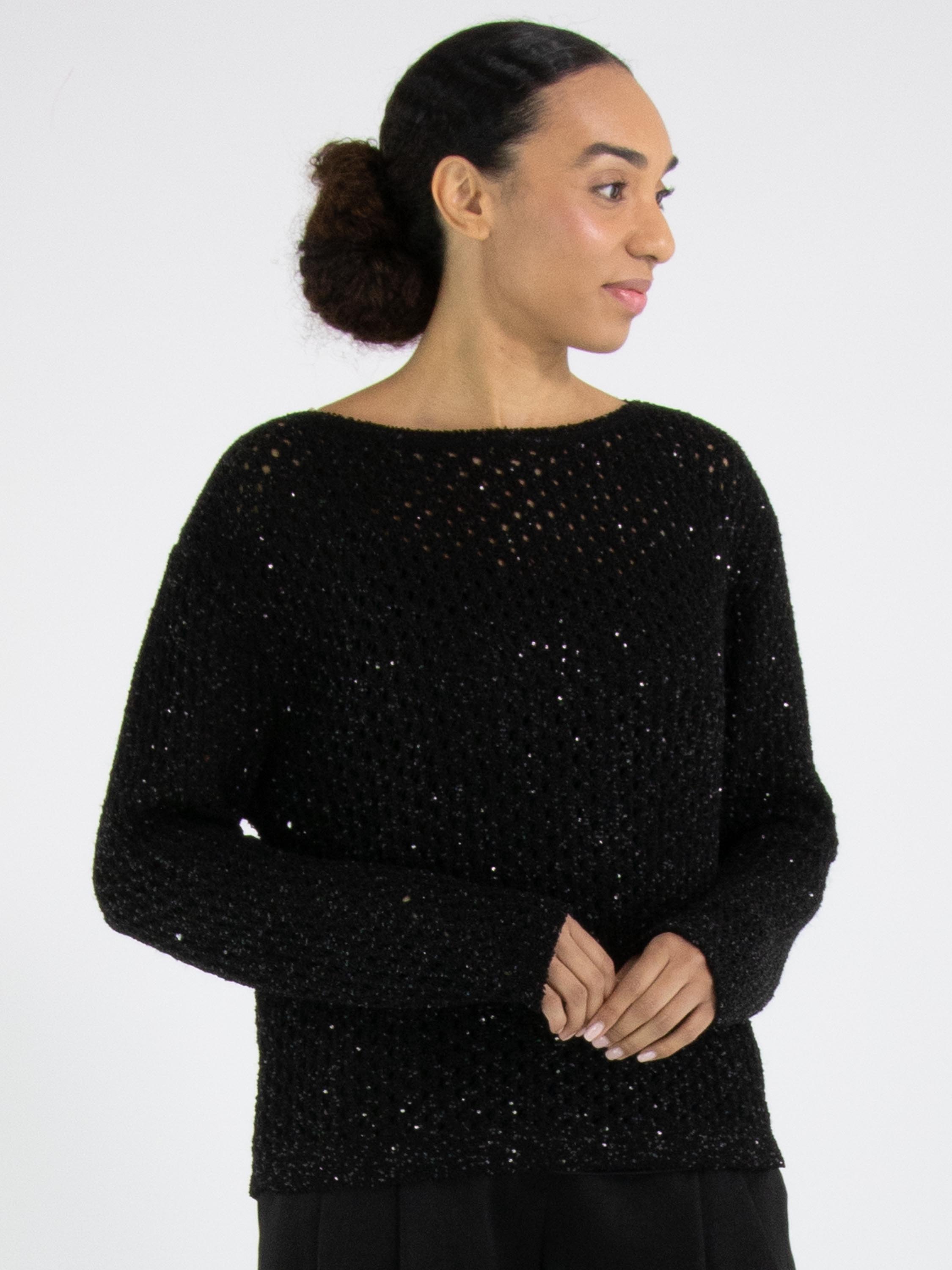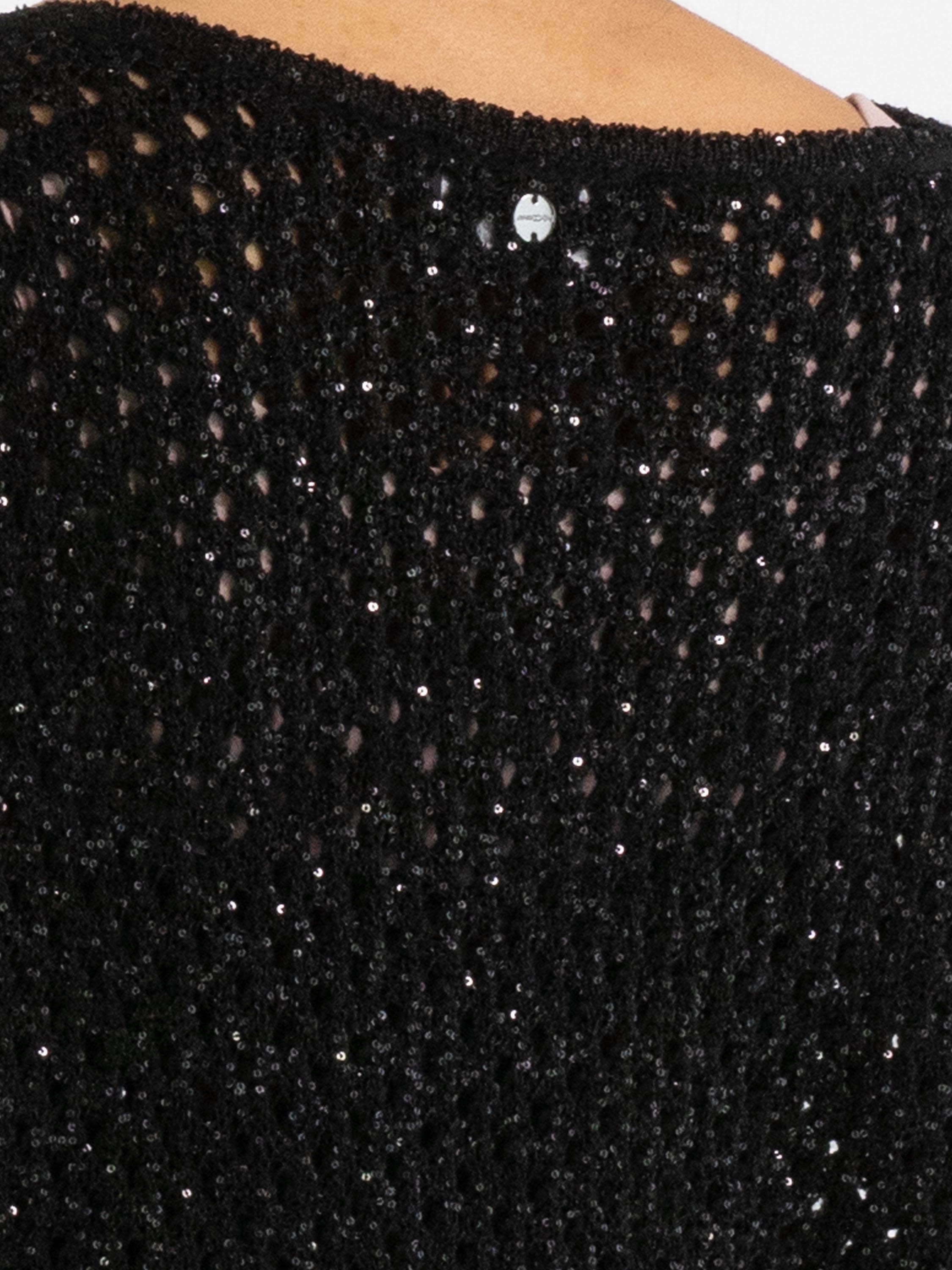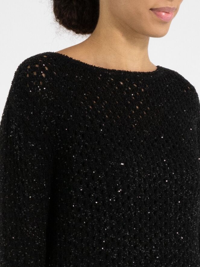 An open-knit pullover from Marc Cain in black. Black sequins are woven into the fabric. The pullover has a round neckline and can be hand-washed.