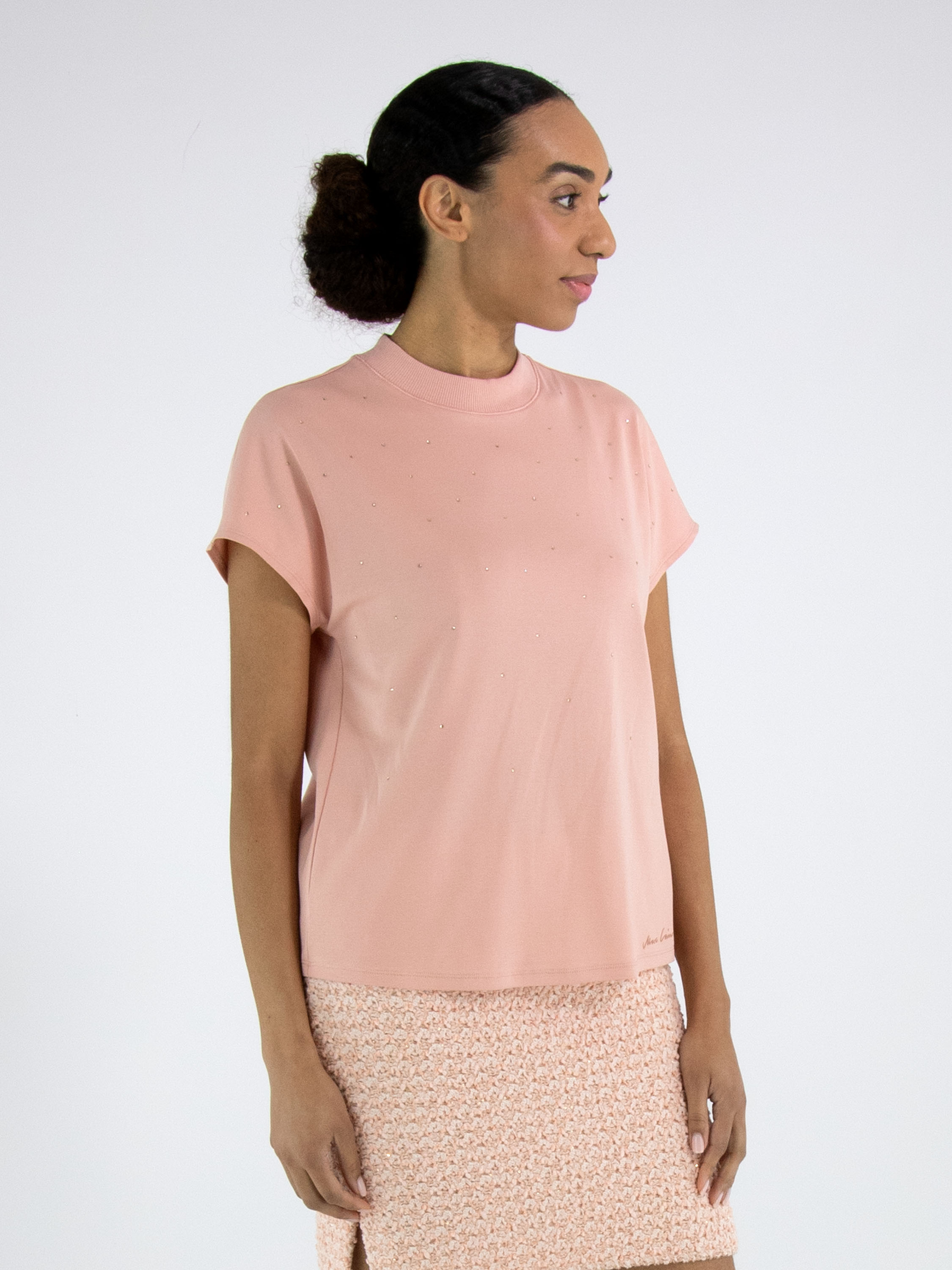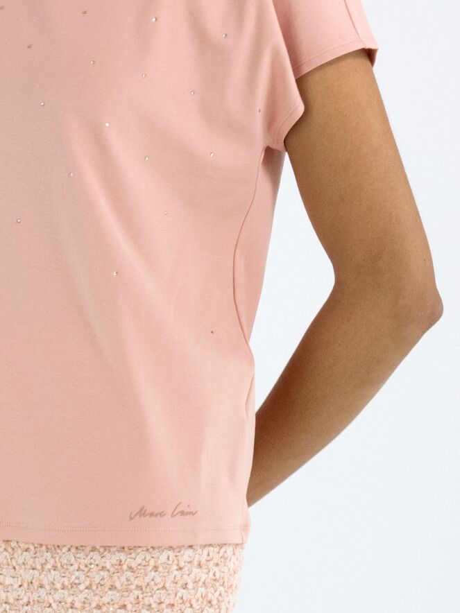 A shirt from Marc Cain in salmon pink. Decorative rhinestones are scattered across the front. Along the edge of the high round neckline is a finely ribbed knit trim. The shirt has cap sleeves and can be washed at 30 degrees.