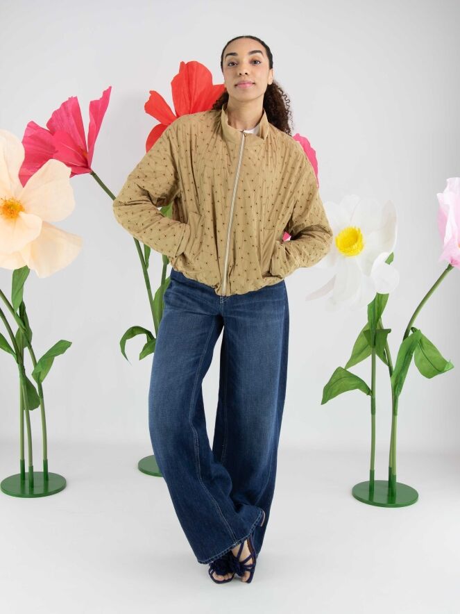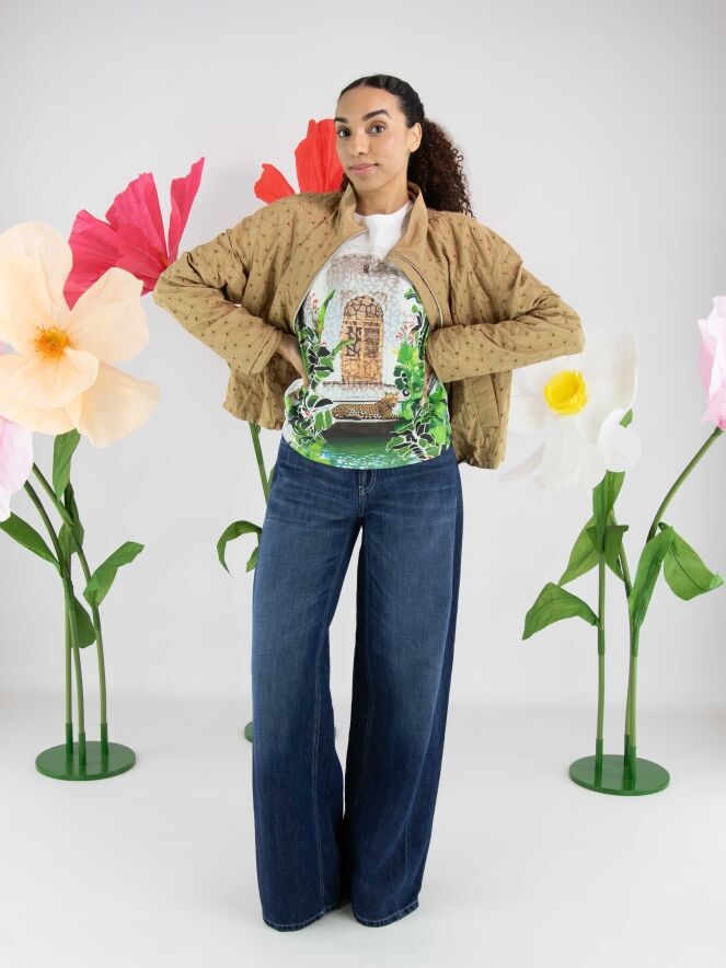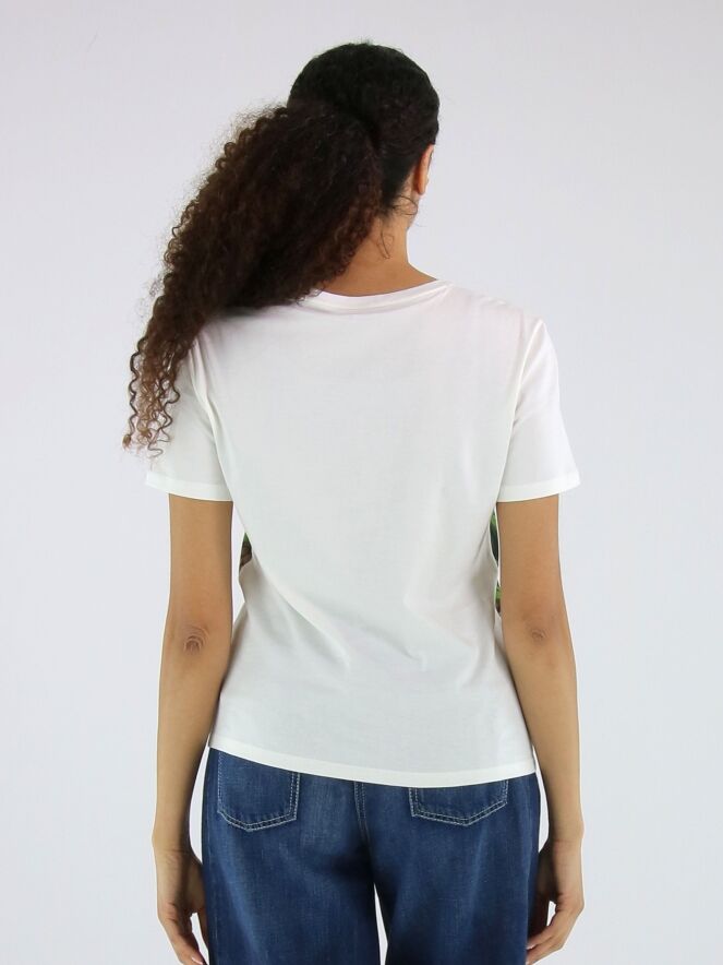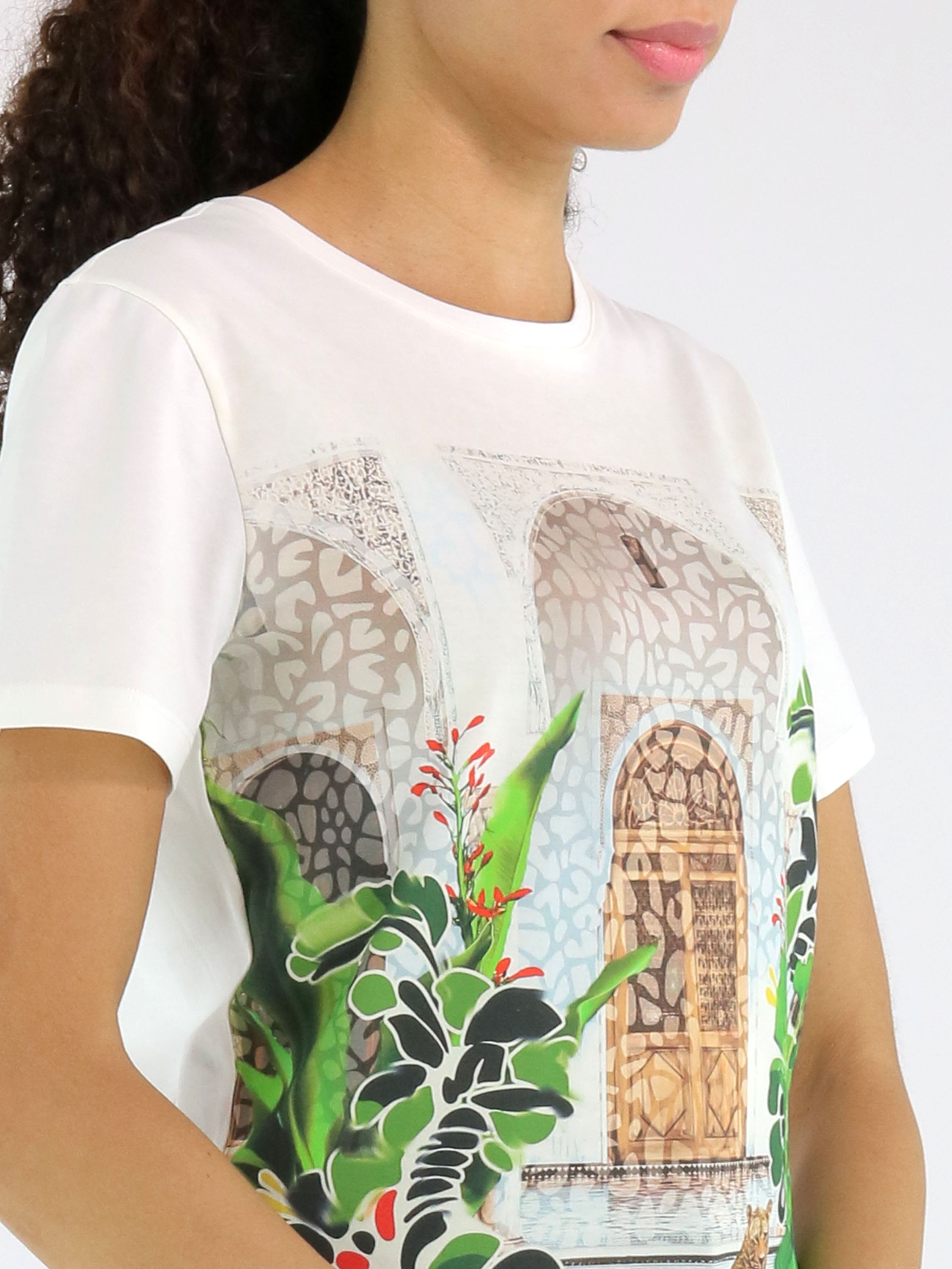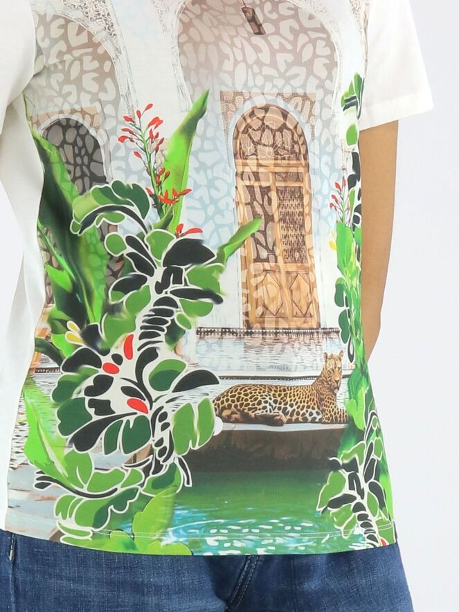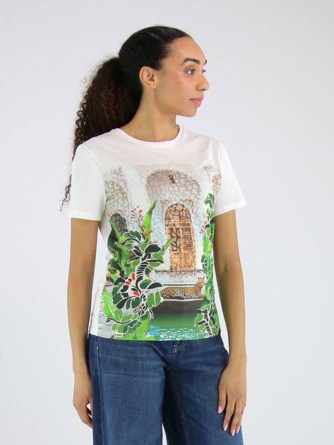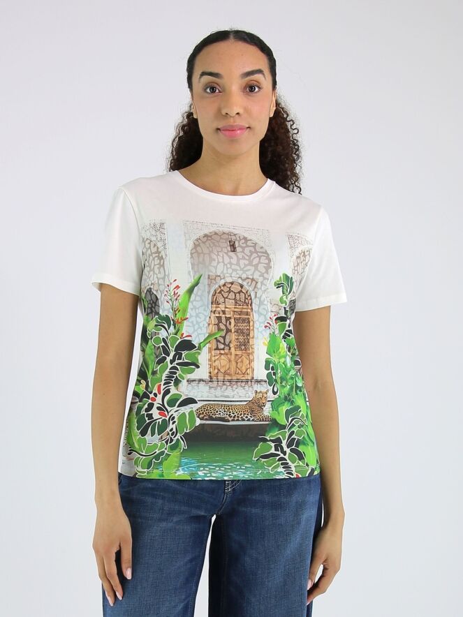 Shirt by Marc Cain featuring a multicolour print of a leopard resting in an Arabian garden on an off-white background. The detailed illustration lends the design a distinctive and artistic character. Styled with a round neckline and short sleeves, this shirt can be washed at 30 degrees.