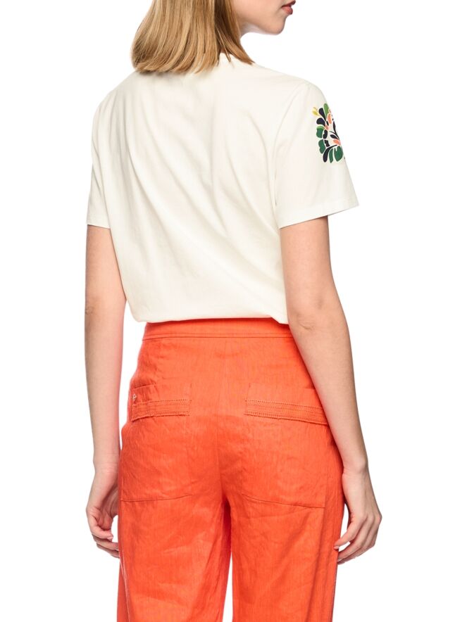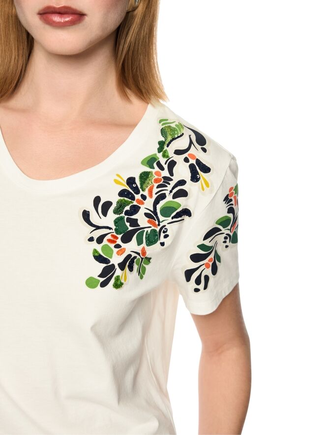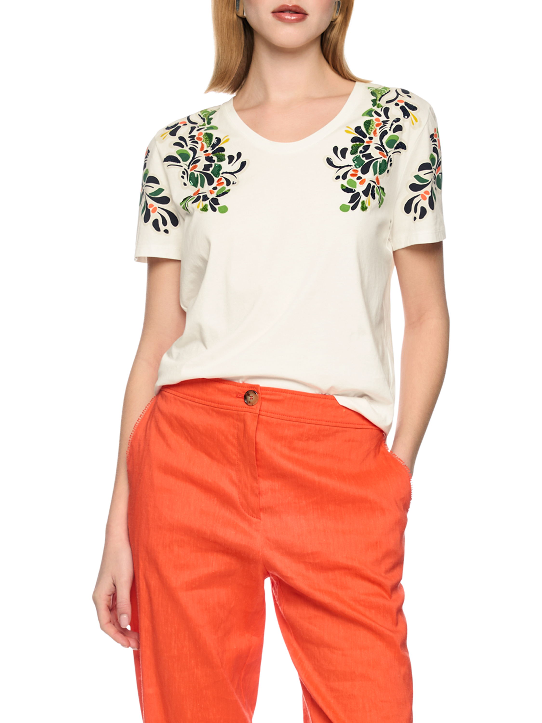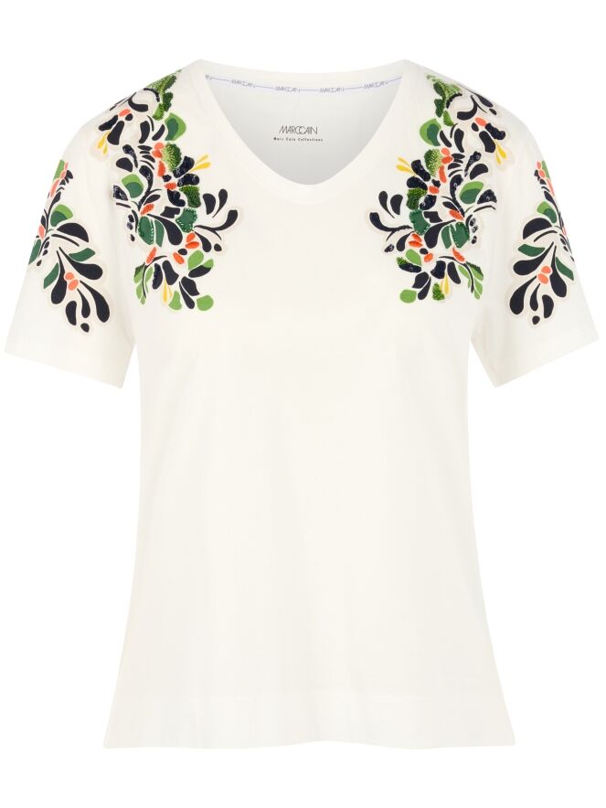 Shirt by Marc Cain in an off-white shade. From the shoulders across the front to the bust and over the short sleeves, a jacquard pattern appears in multiple tones of green, coral red, beige and black. The design is subtly embellished with rhinestones and sequins in various shades, adding a refined and luxurious touch. This shirt can be washed at 30 degrees.