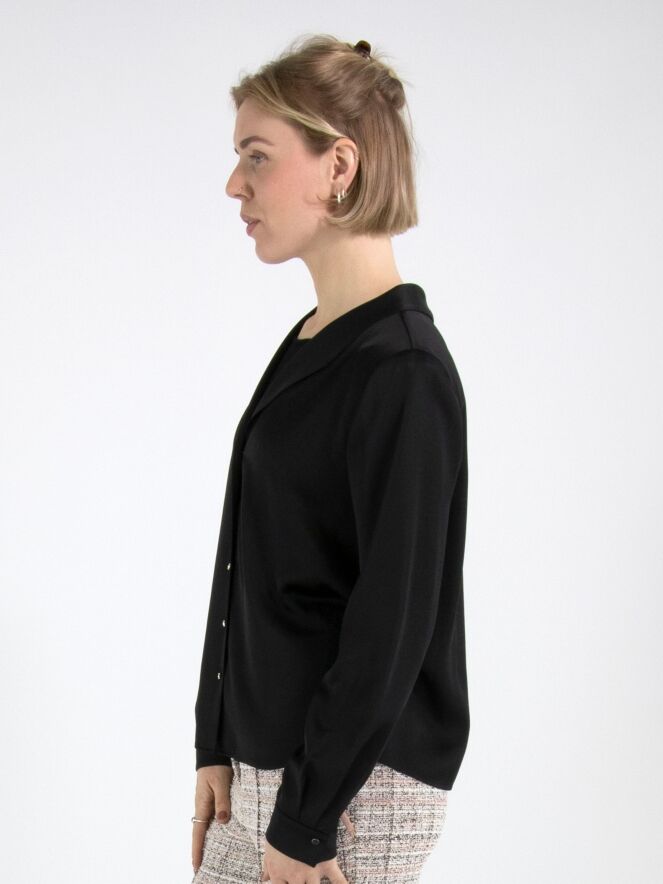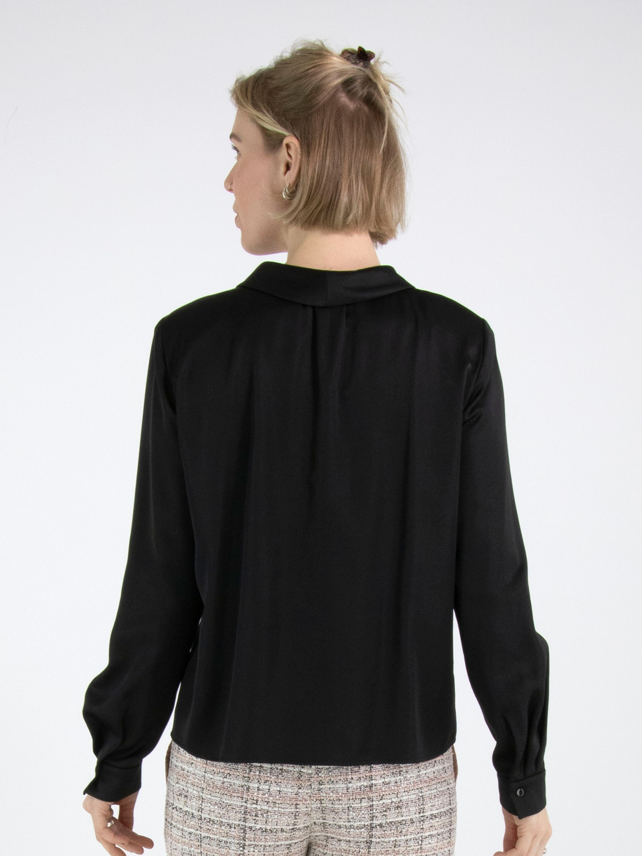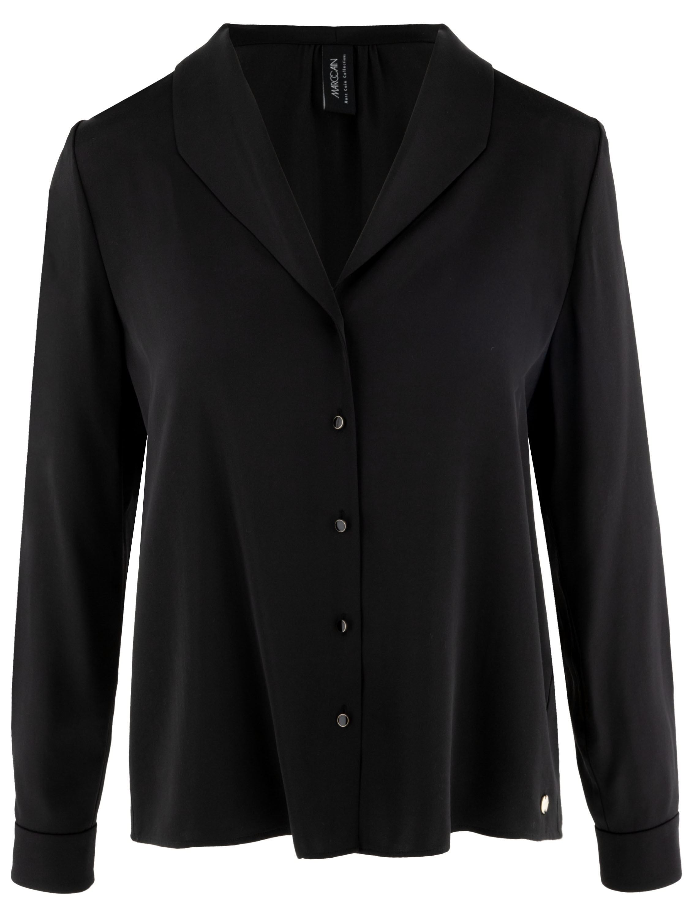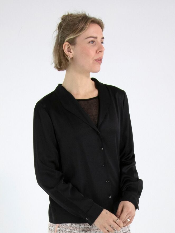 A blouse from Marc Cain in a matte satin fabric in black. The blouse has a button fastening. At the cuffs, the fabric features several pleats. This blouse can be washed at 30 degrees.