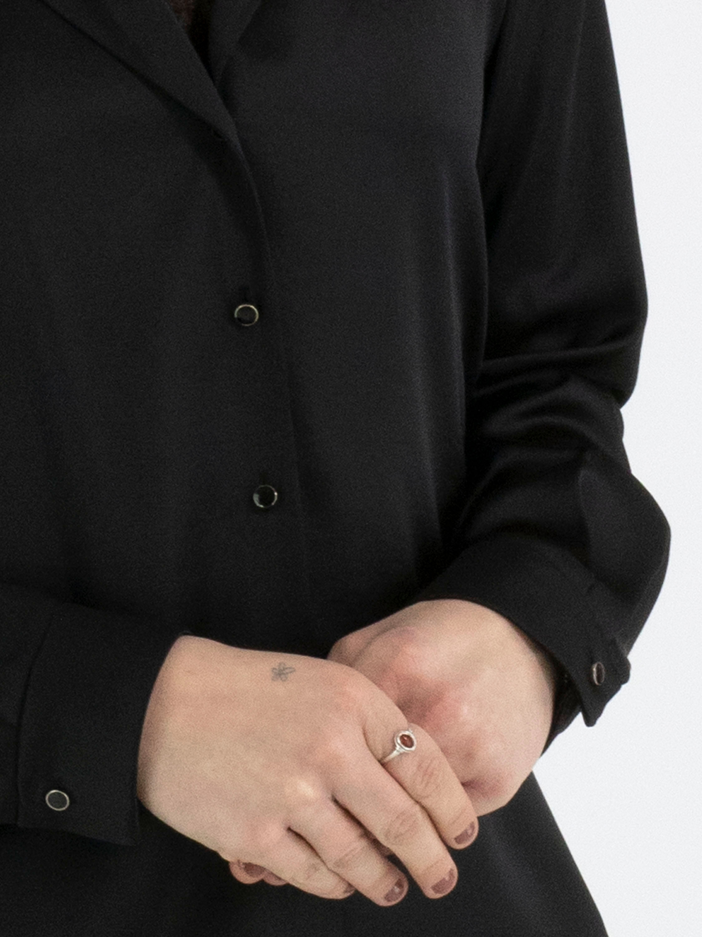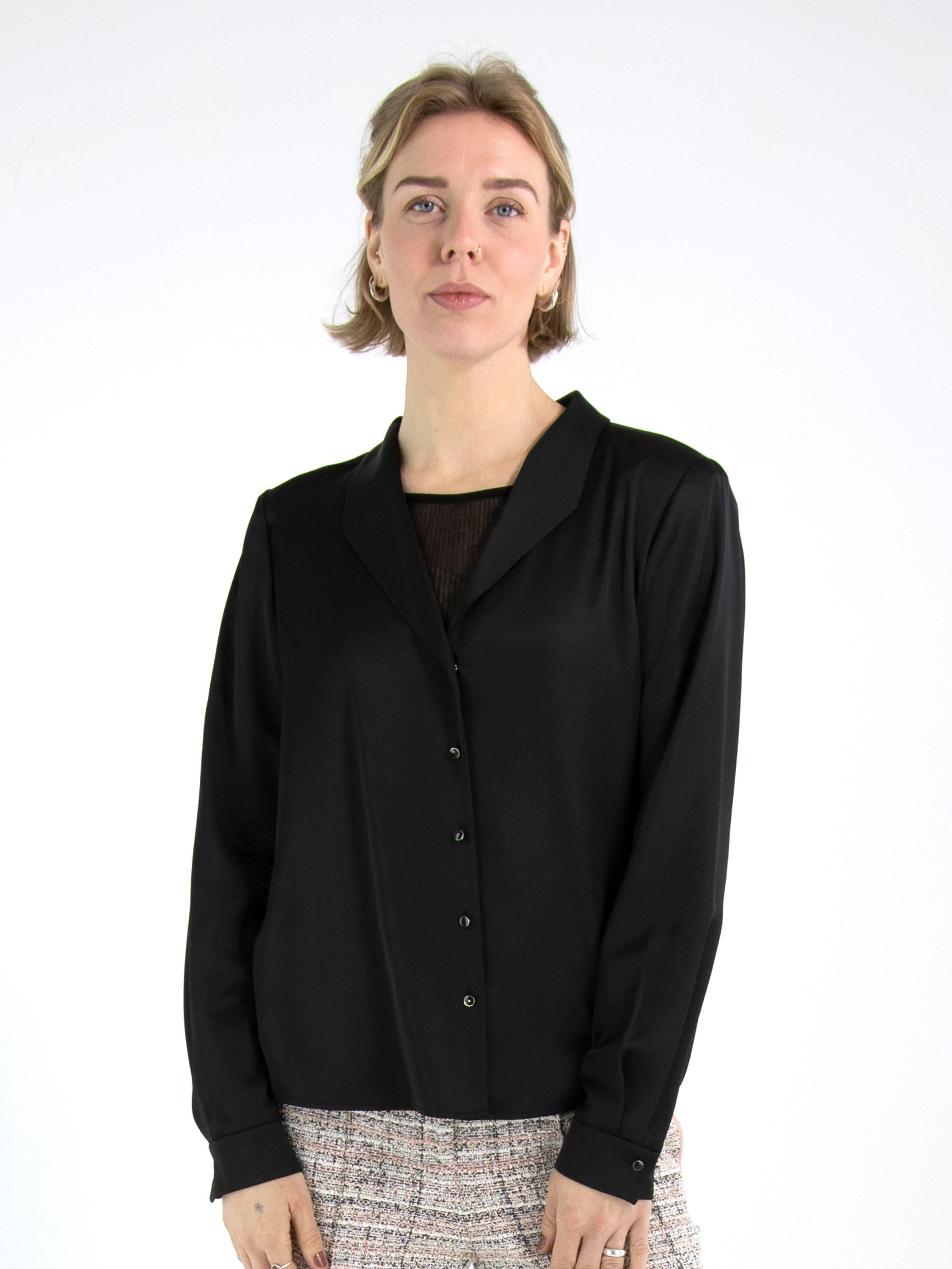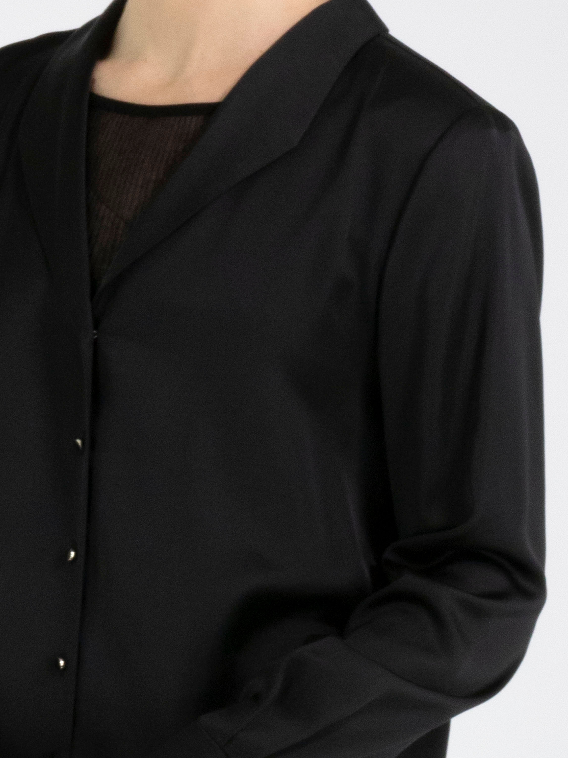 A blouse from Marc Cain in a matte satin fabric in black. The blouse has a button fastening. At the cuffs, the fabric features several pleats. This blouse can be washed at 30 degrees.