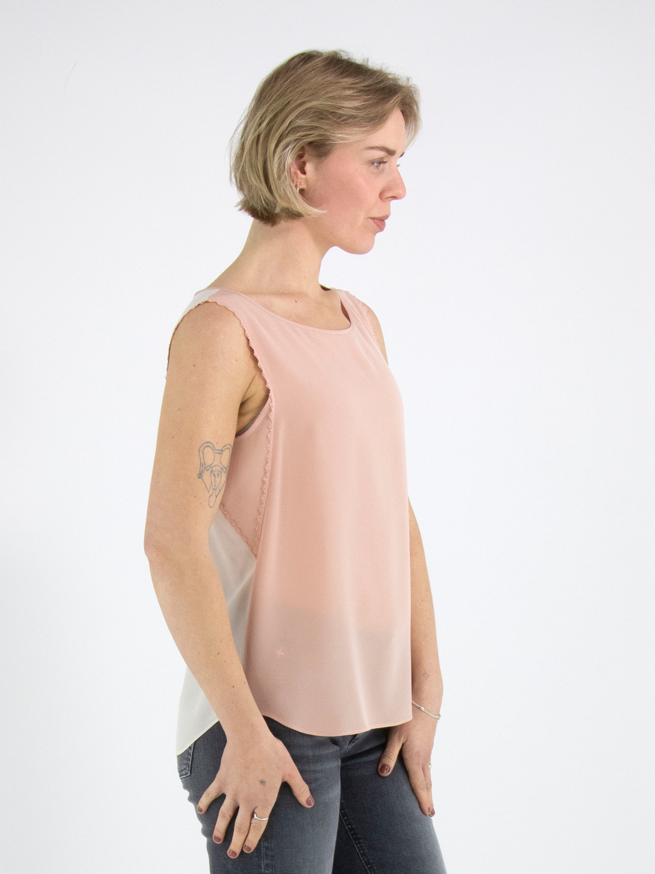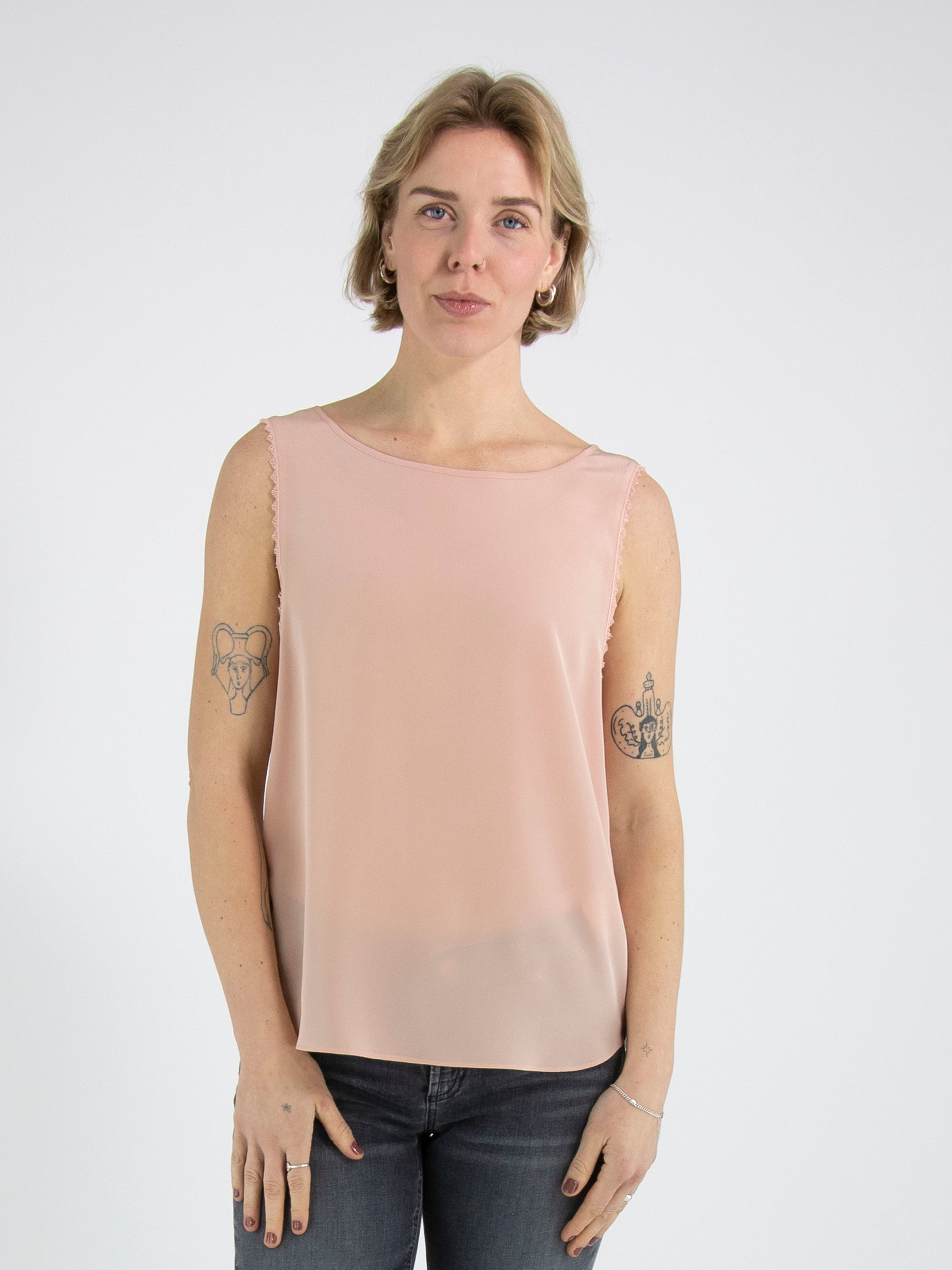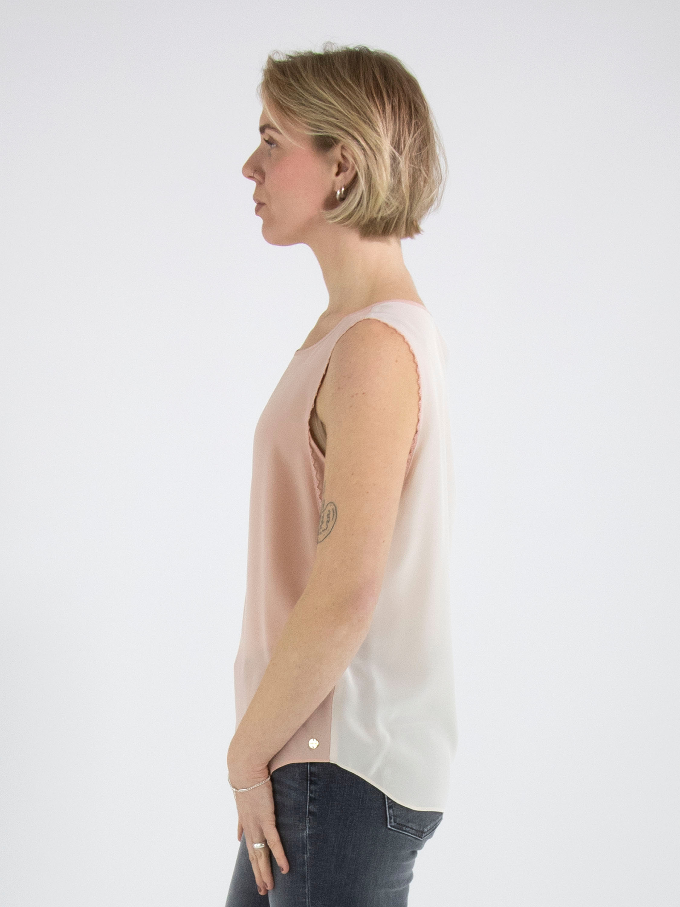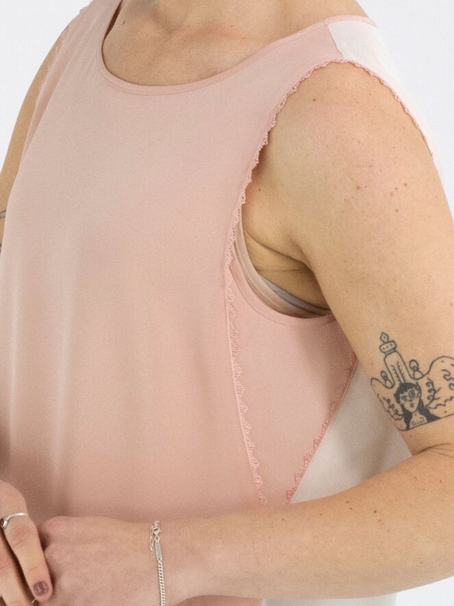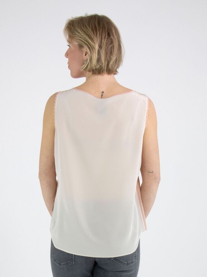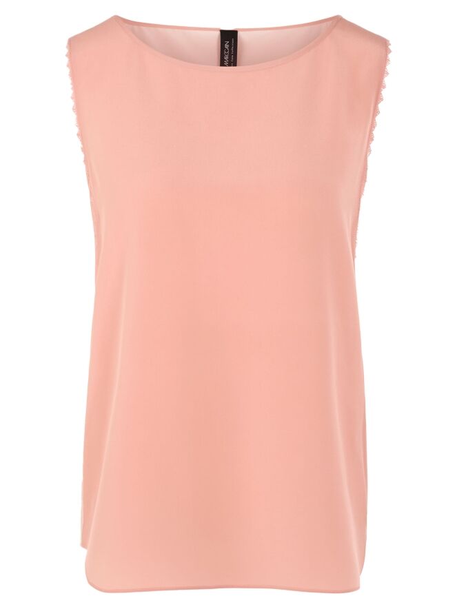 A top from Marc Cain with a salmon pink front and a nude-coloured back. Along the edges at the armholes is a scalloped thread trim. The top has a round neckline and can be hand-washed.