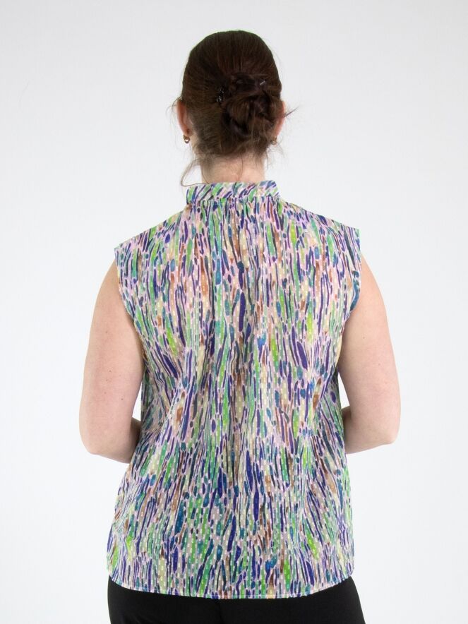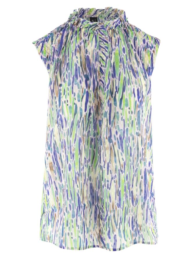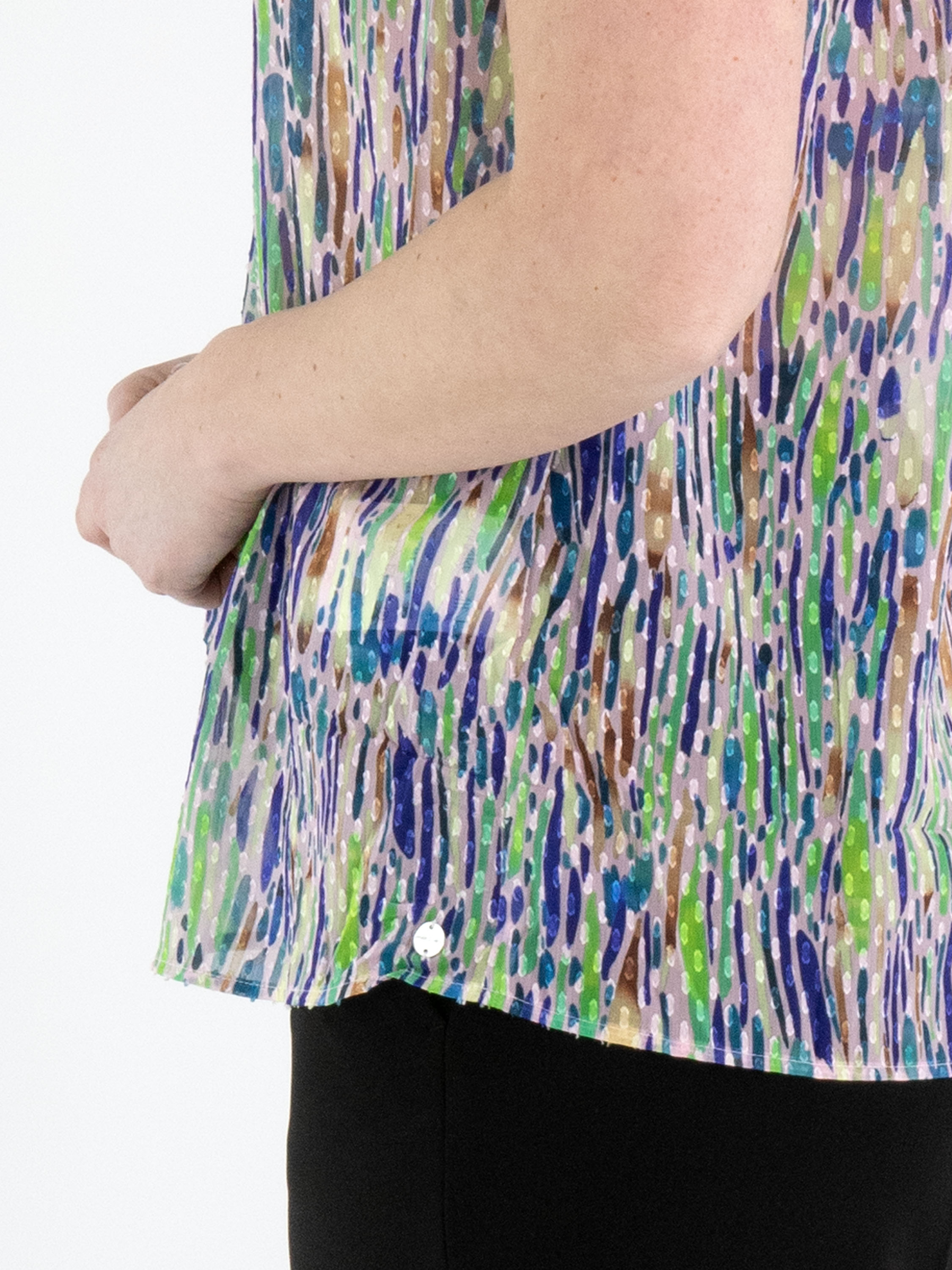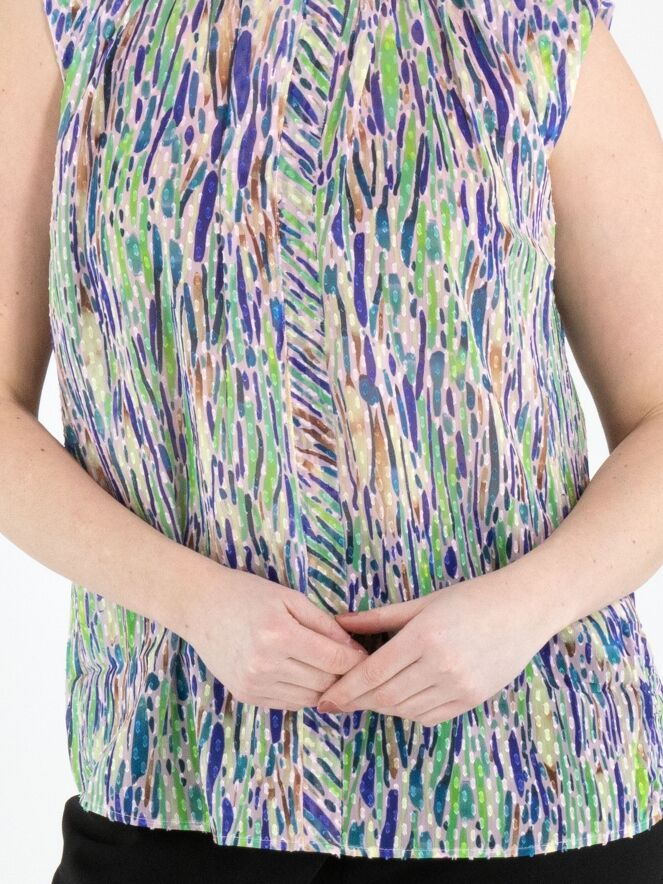 A lightly transparent top by Marc Cain featuring a confetti print in various shades of green, blue and brown on a pastel pink background. Along the elasticated round neckline, a double voile trim is applied. The fabric is finely pleated along the neckline edge. This top can be washed at 30 degrees.