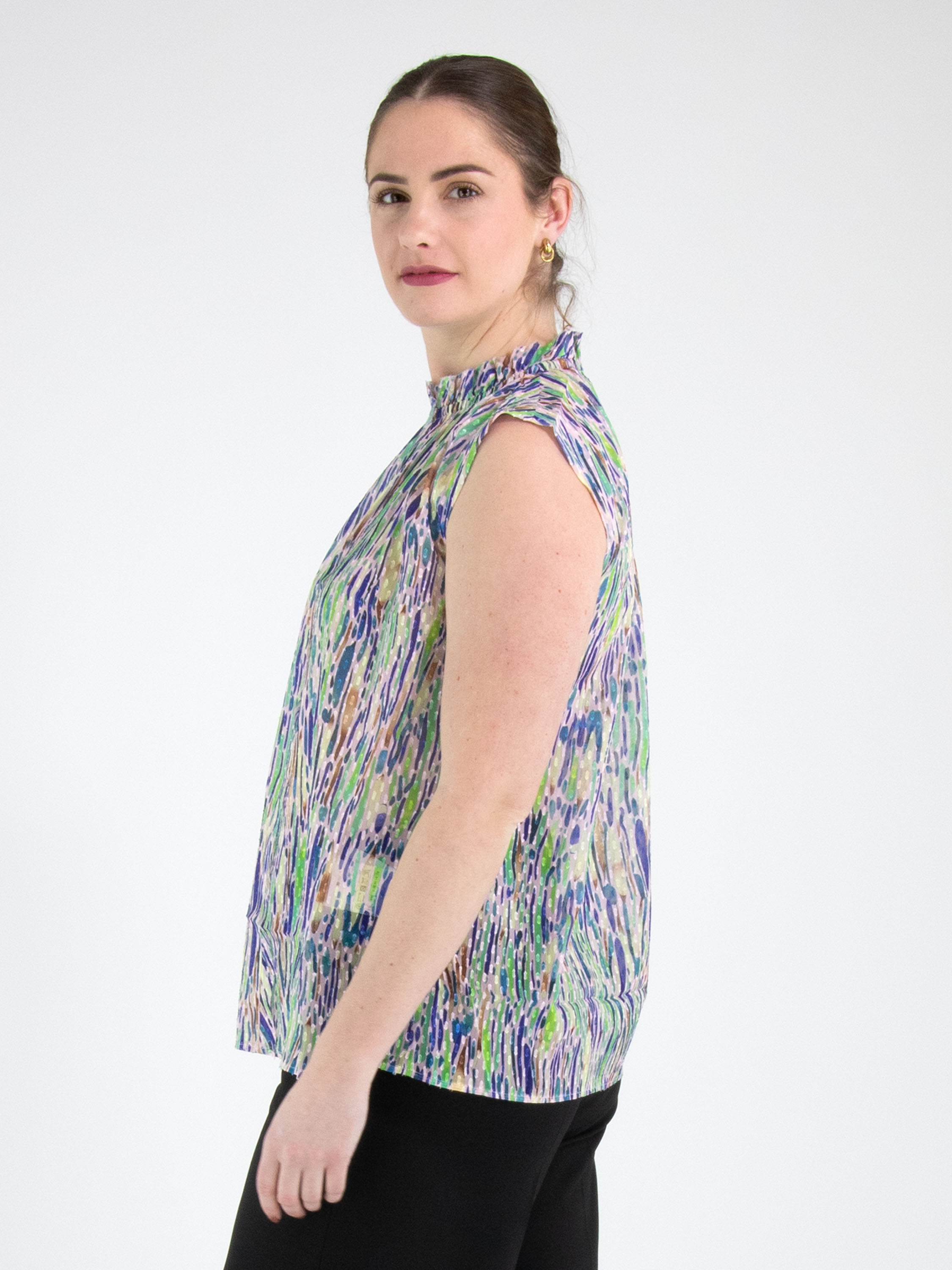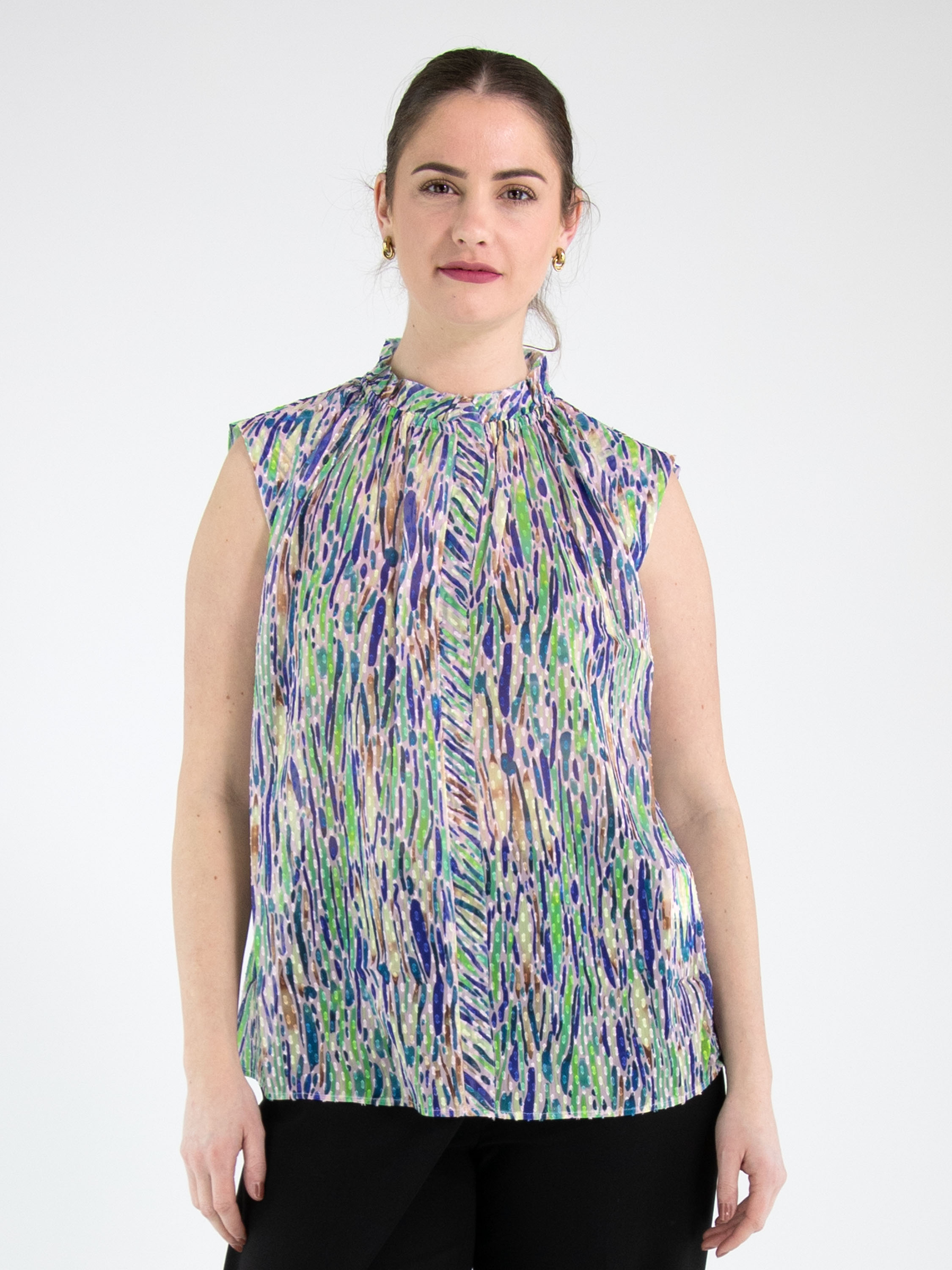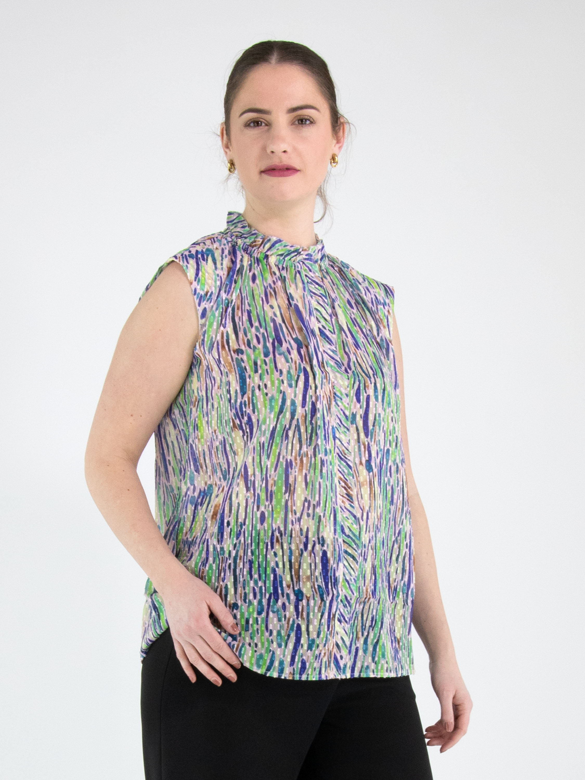 A lightly transparent top by Marc Cain featuring a confetti print in various shades of green, blue and brown on a pastel pink background. Along the elasticated round neckline, a double voile trim is applied. The fabric is finely pleated along the neckline edge. This top can be washed at 30 degrees.